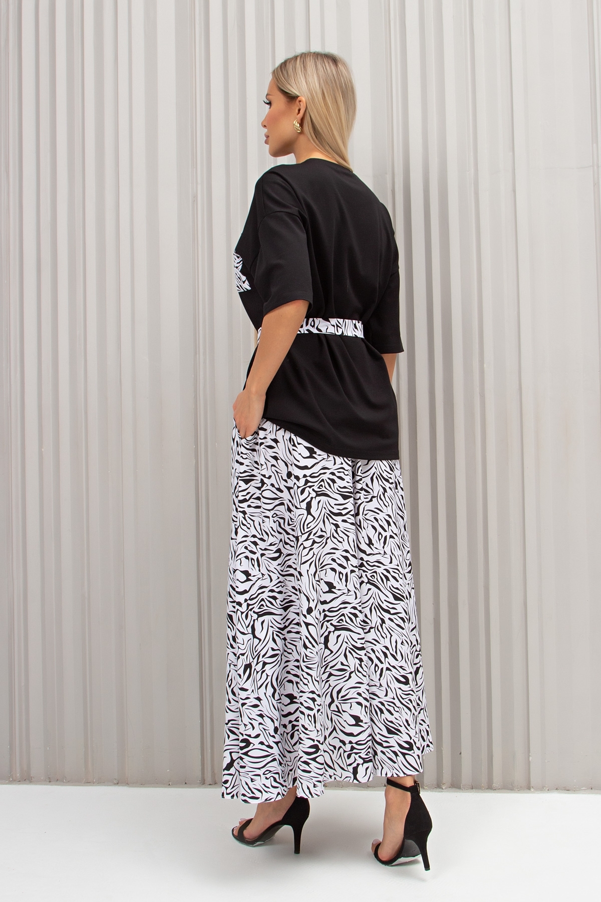 Стильный костюм состоит из футболки и юбки. Футболка прямого кроя выполнена из трикотажного полотна. Округлая горловина. Короткий втачной рукав со спущенным плечом. Полочка оформлена накладным карманом. Юбка расклешенного кроя, выполнена из легкой ткани Ниагара. Верх оформлен притачным поясом, по спинке застежка на петлю и пуговицы. В боковых швах функциональные карманы. Низ ровный, без разрезов. Пояс из основной ткани в комплекте.