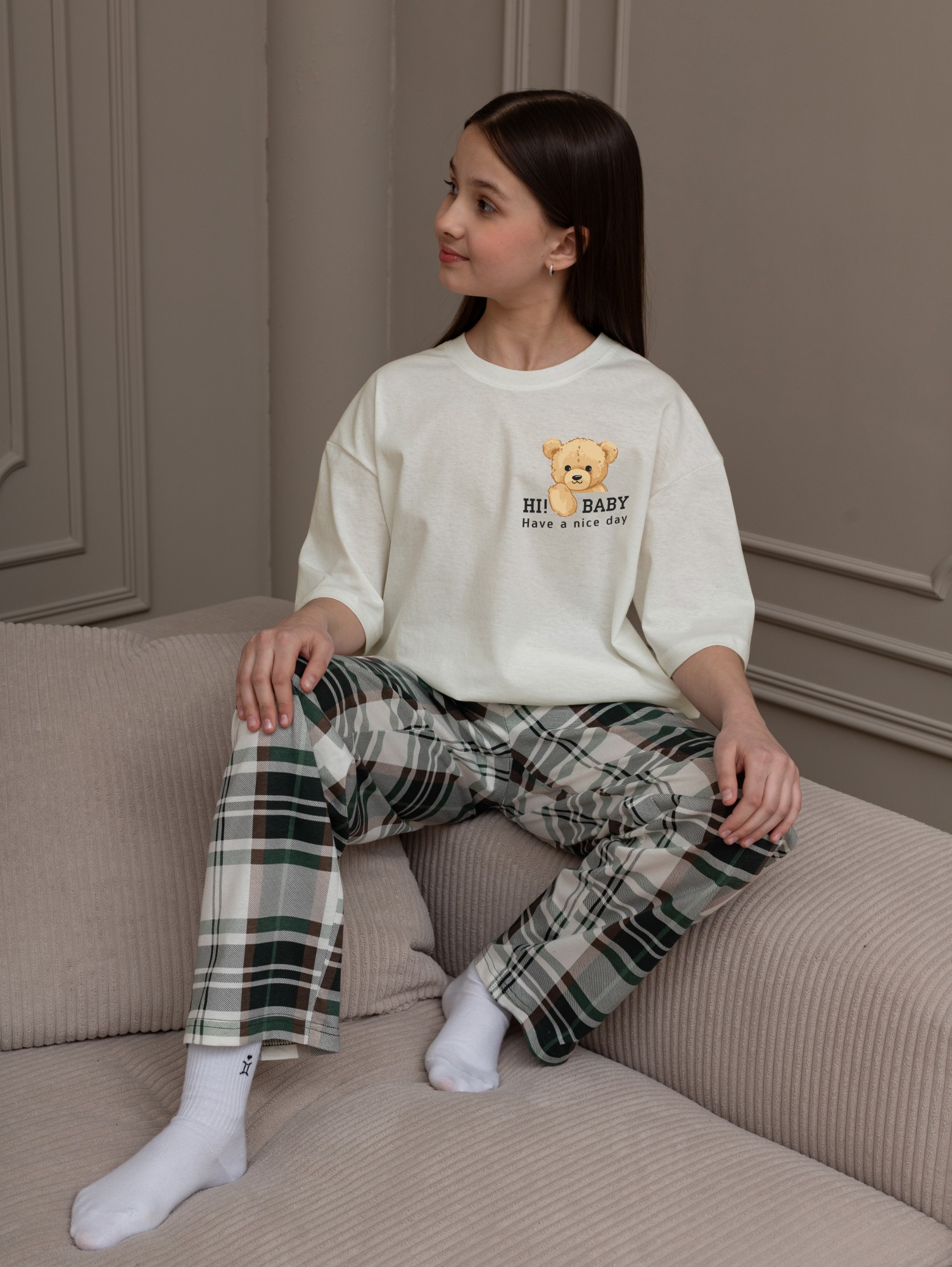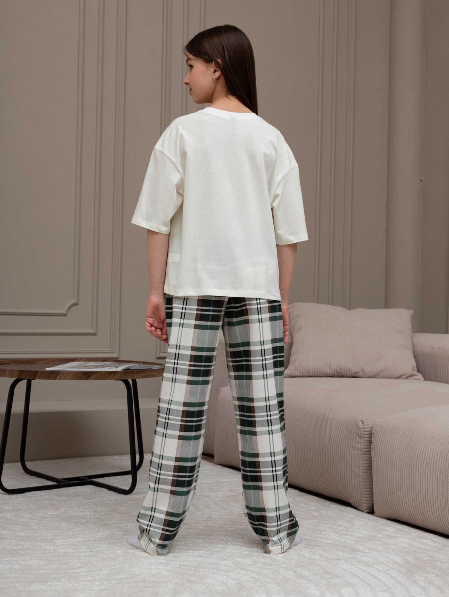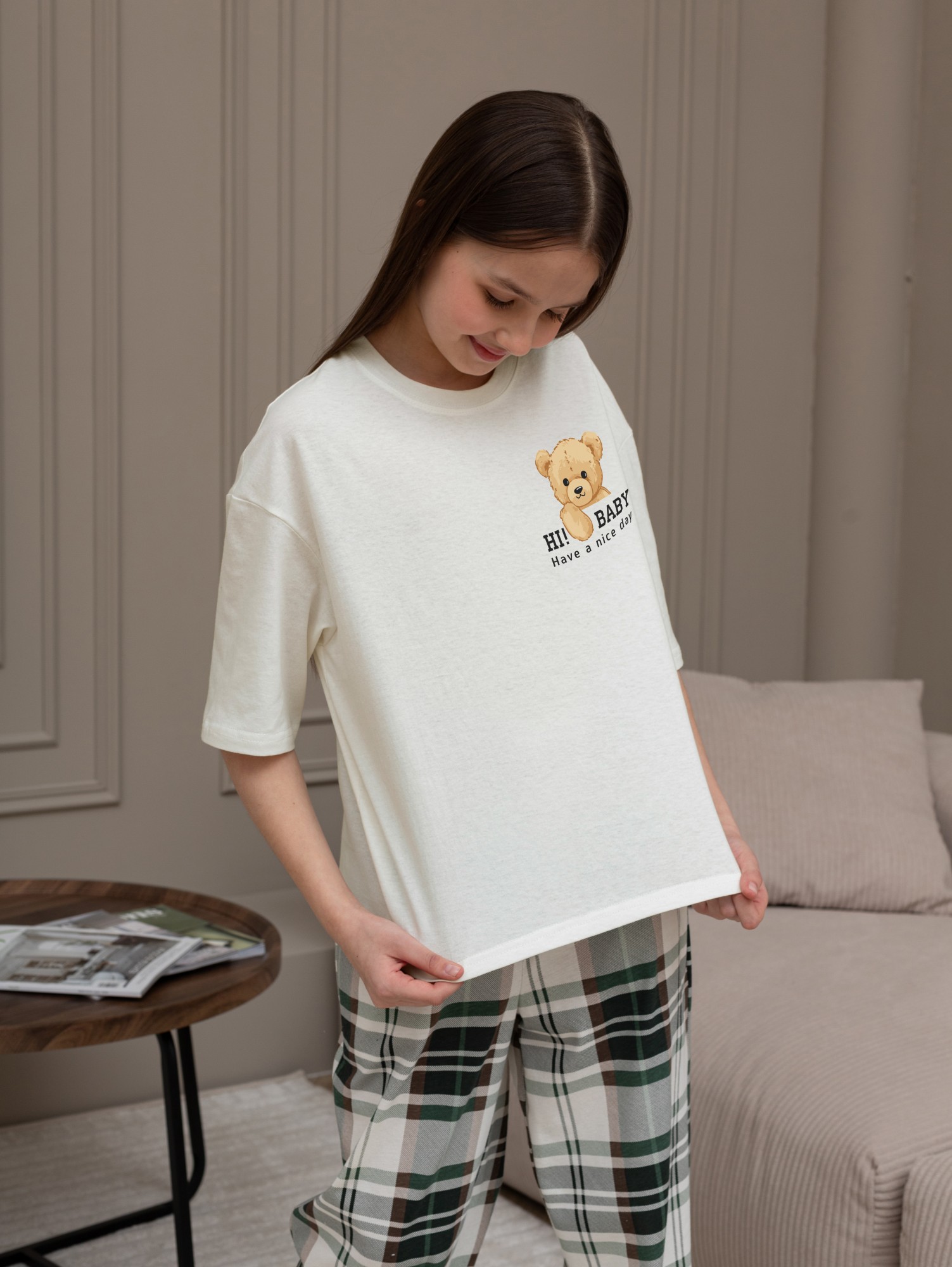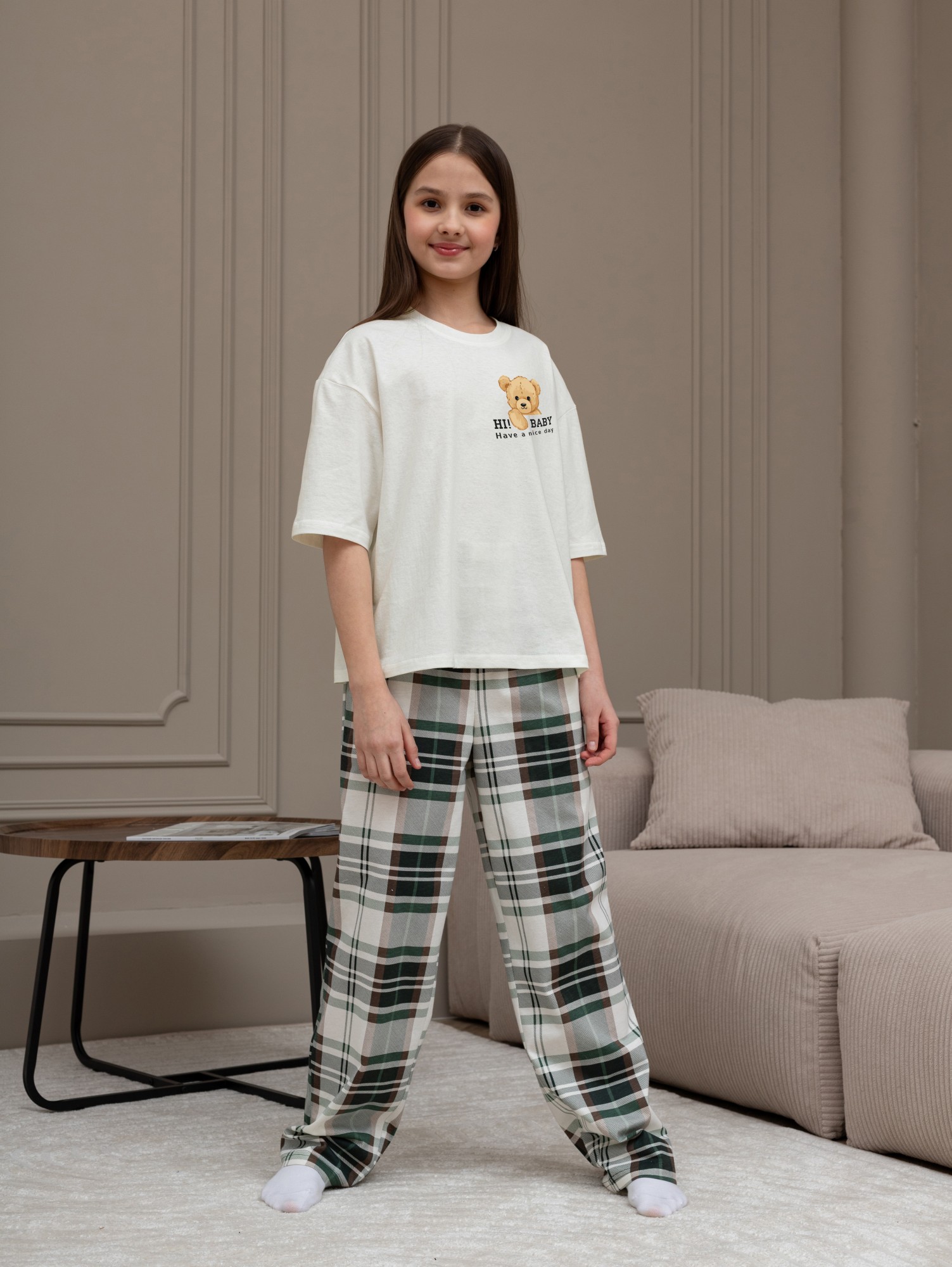 Костюм для девочки из трикотажного полотна "кулирка" в комбинации двух видов: гладкокрашеного и набивного с тематическим рисунком, состоящий из футболки и брюк. Футболка из гладкокрашеного полотна, свободного силуэта, со спущенной линией плеч и втачными короткими рукавами, горловиной овальной формы, обработанной втачной планкой и отделочной строчкой. В центре переда - принт, выполненгный в технике шелкографии. Брюки из полотна с набивным рисунком длинные, прямые, на притачном поясе с эластичной тесьмой внутри и карманами в боковыых швах.