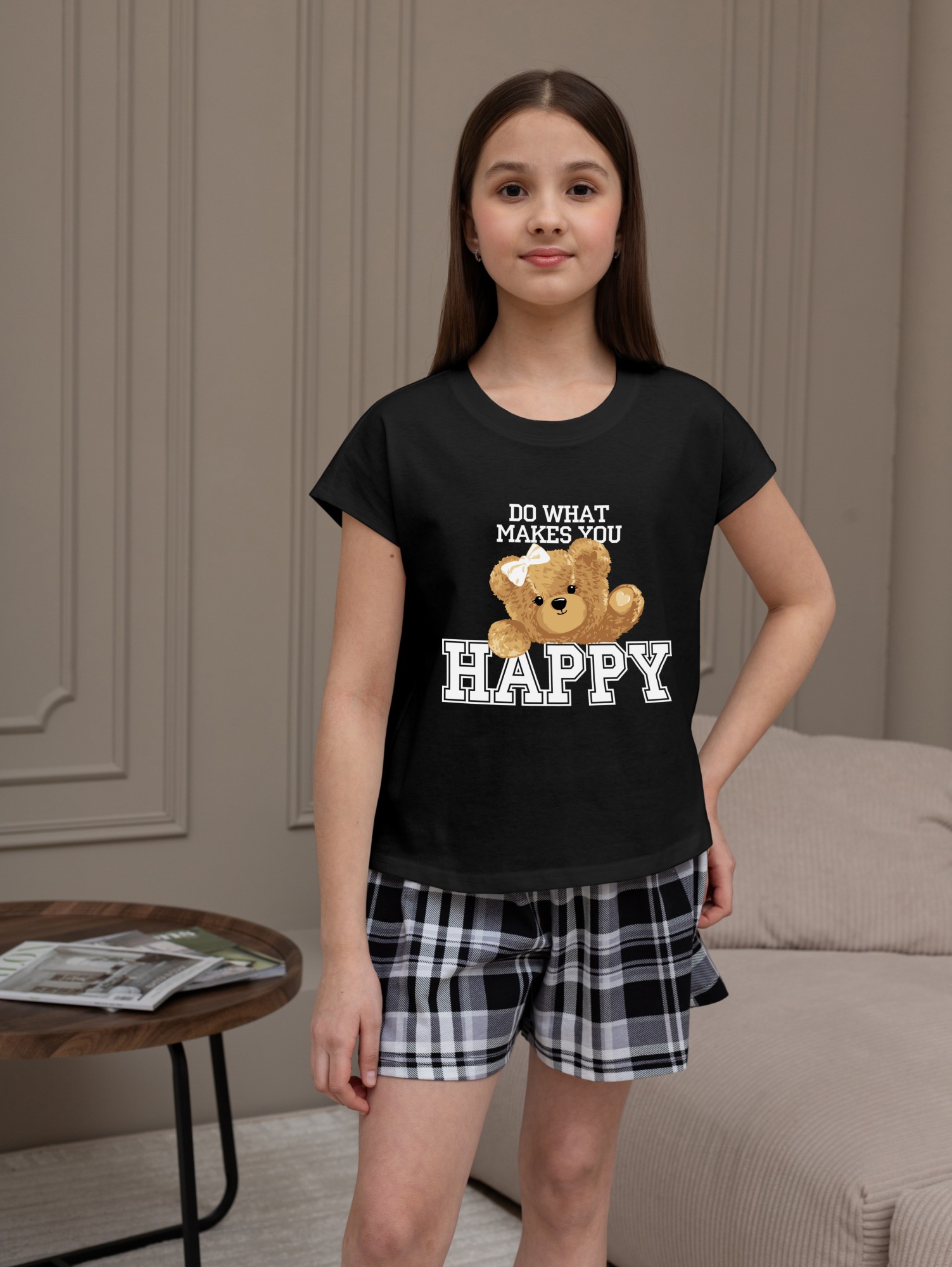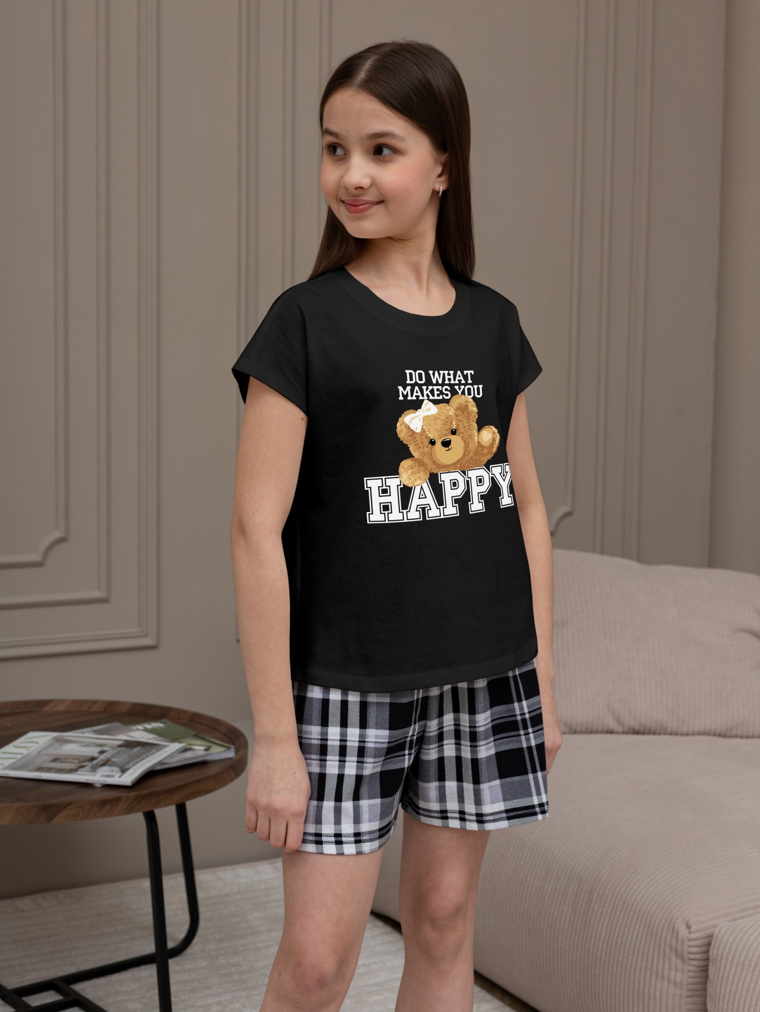 Костюм для девочки из трикотажного полотна "кулирка" в комбинации двух видов: гладкокрашеного и набивного с тематическим рисунком, состоящий из футболки и шорт. Футболка из гладкокрашеного полотна, с цельнокроенными короткими рукавами, горловиной овальной формы, обработанной втачной планкой и отделочной строчкой. В центре переда - принт, выполненгный в технике шелкографии. Шорты из полотна с набивным рисунком, свободного силуэта, на цельнокроенном поясе с эластичной тесьмой внутри.