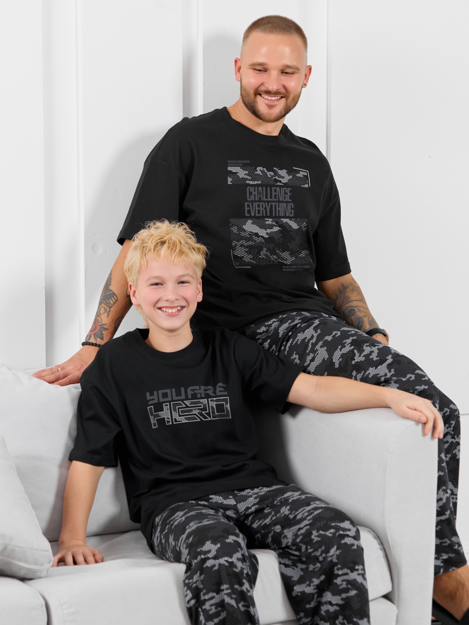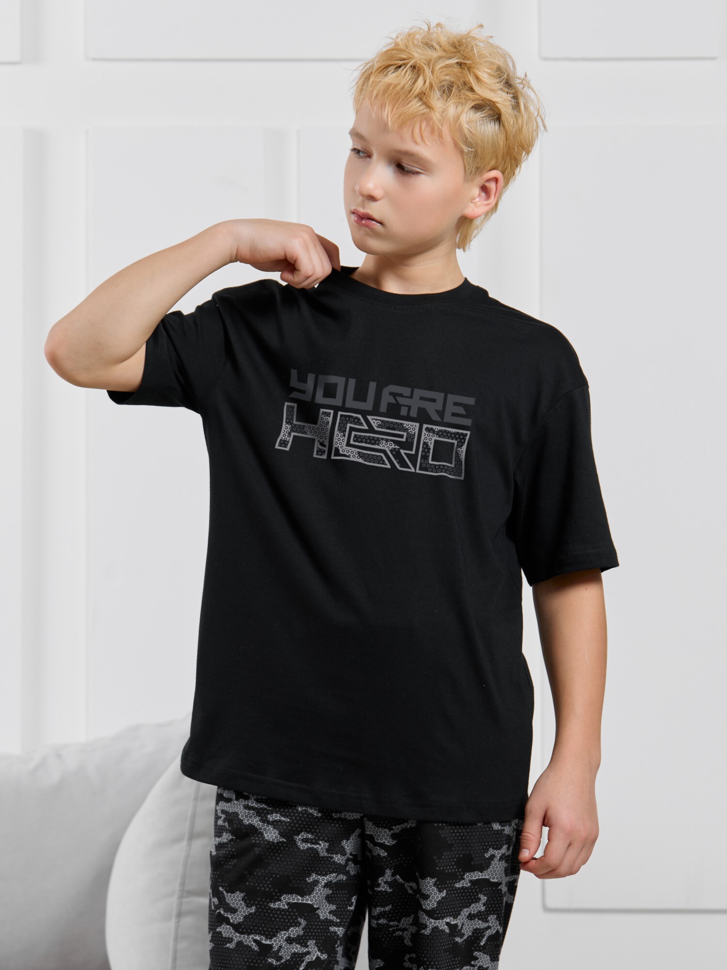 Костюмдля мальчика, состоящий из футболки и брюк. Футболка однотонная с принтом на груди; модель свободная, со спущенной линией плеч, овальным вырезом горловины. Брюки из полотна с набивным рисунком эксклюзивного дизайна, прямые, с боковыми карманами с обтачными входами, на притачном поясе с отстроченной эластичной тесьмой.