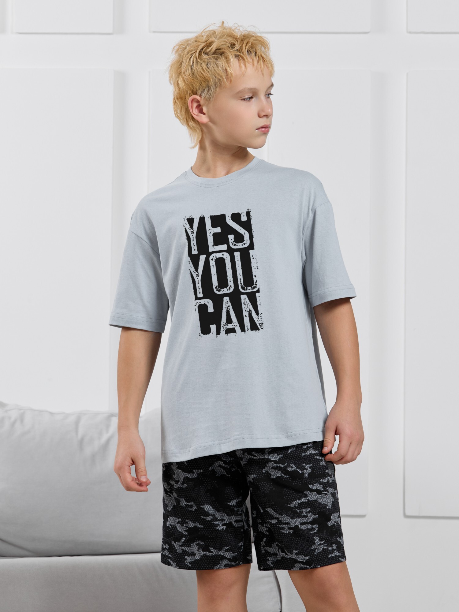 Костюм для мальчика, состоящий из футболки и шорт. Футболка однотонная с принтом на груди; модель свободная, со спущенной линией плеч. Шорты из полотна с набивным рисунком эксклюзивного дизайна, с боковыми карманами с обтачными входами, на притачном поясе с отстроченной эластичной тесьмой.