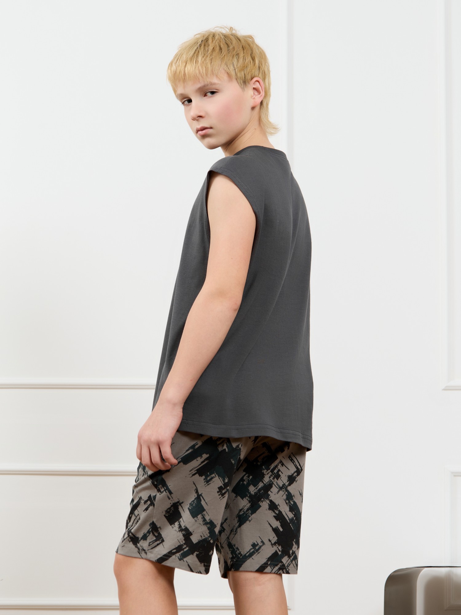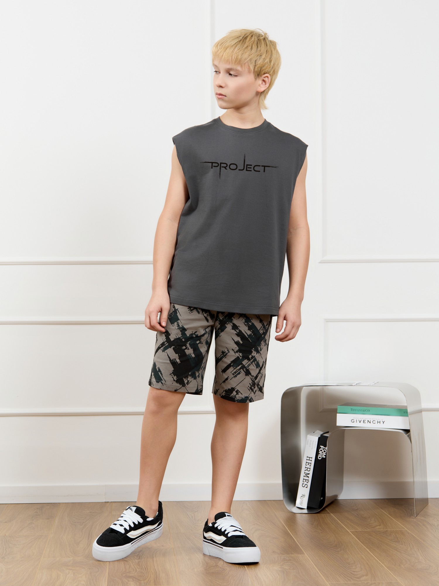Костюм для мальчика, состоящий из майки и шорт. Майка однотонная с принтом на груди; модель свободная, со спущенной линией плеч и углубленной проймой. Шорты из полотна с набивным рисунком эксклюзивного дизайна, с боковыми карманами с обтачными входами, на притачном поясе с отстроченной эластичной тесьмой.