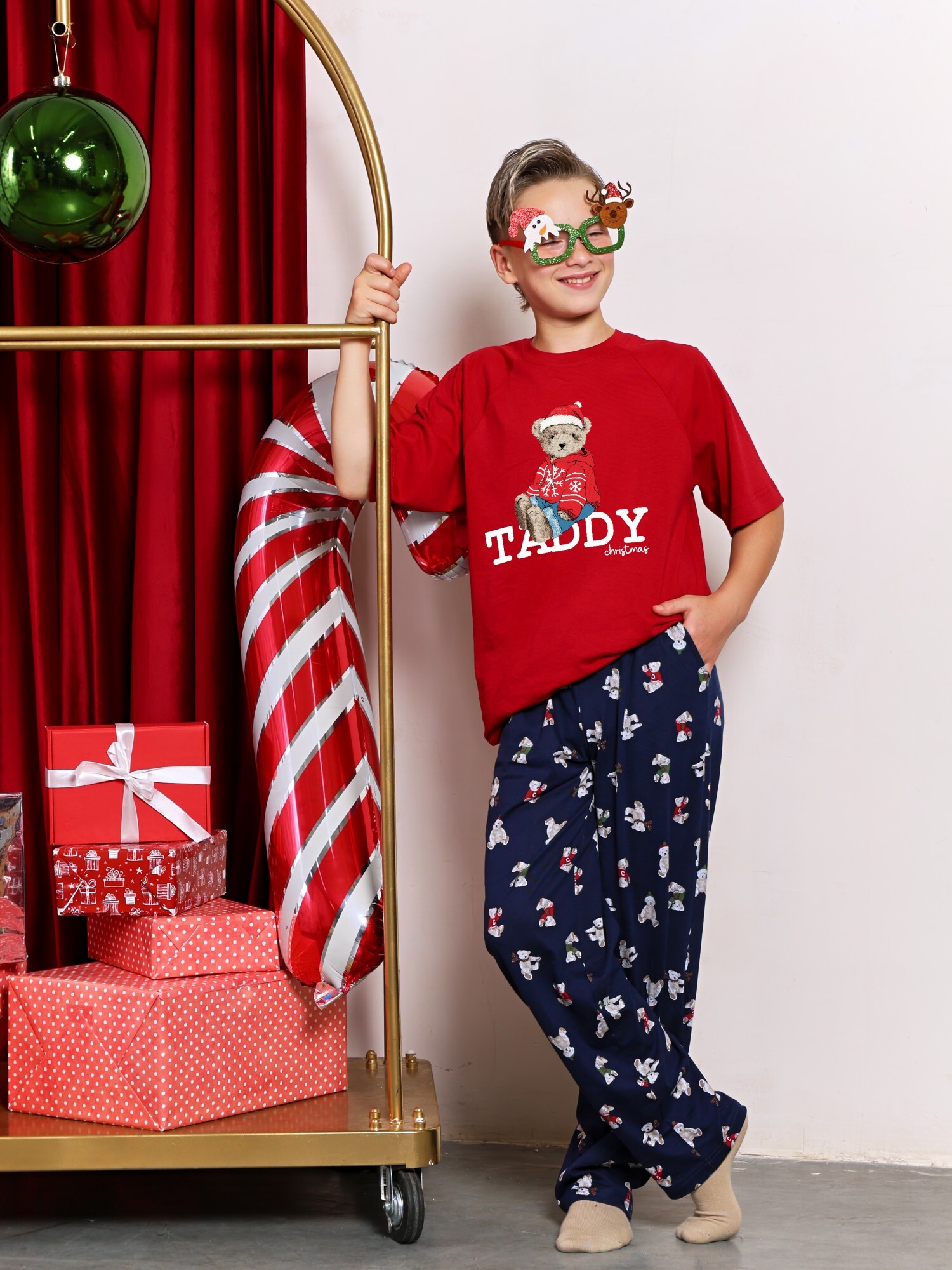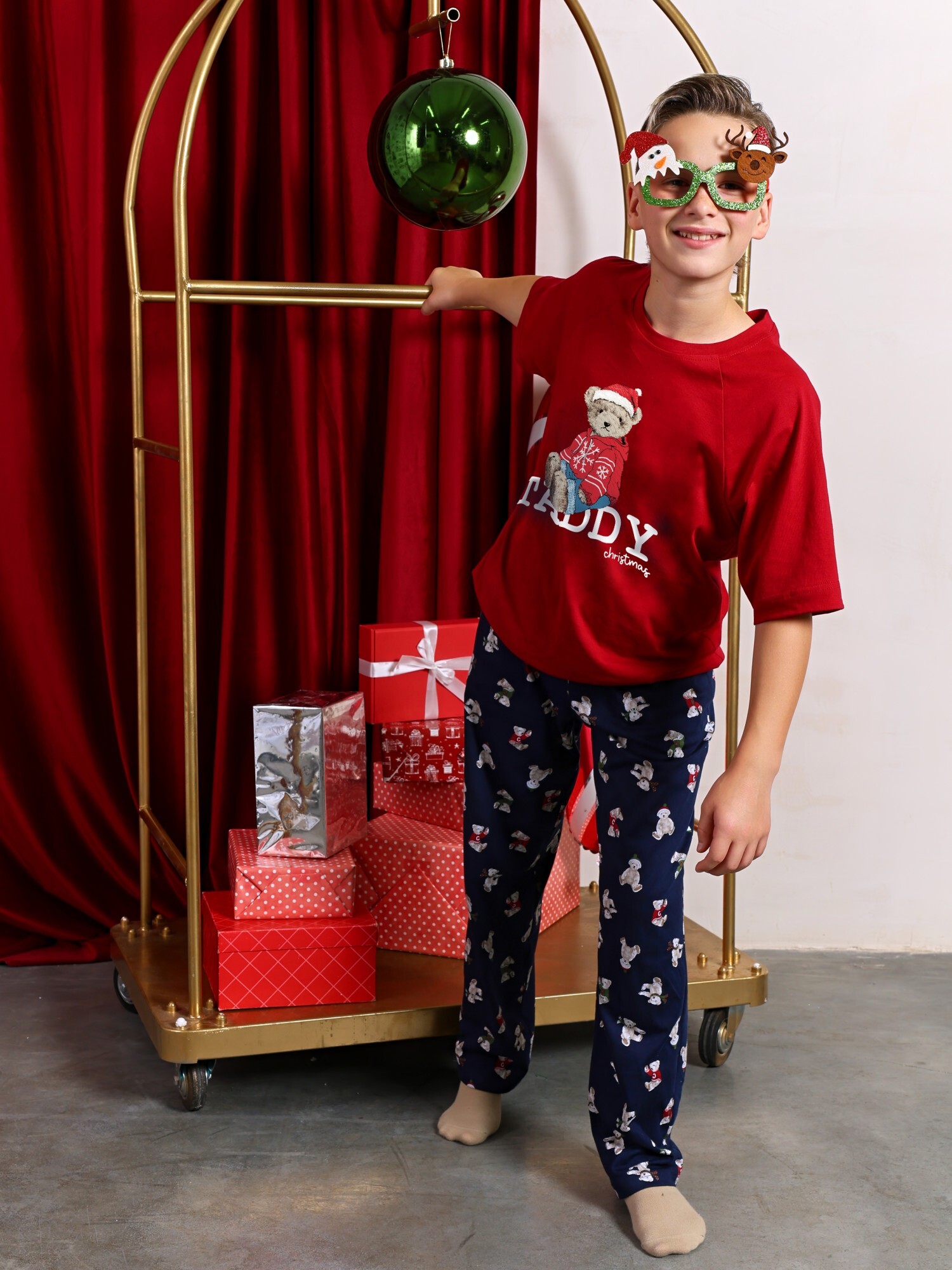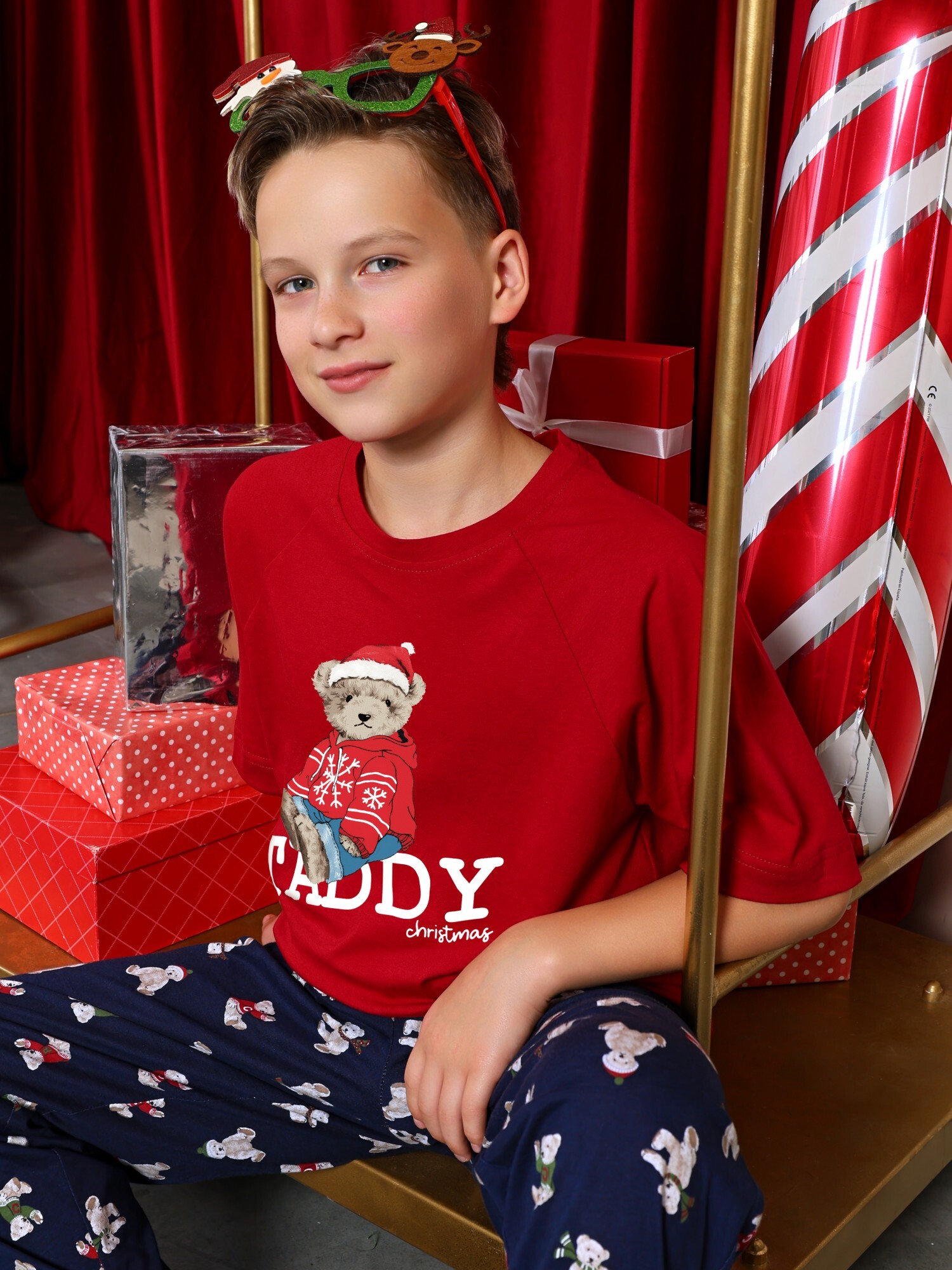 Костюм для мальчика из трикотажного полотна "кулирка" в комбинации двух видов: гладкокрашеного и набивного с тематическим рисунком, состоящий из футболки и брюк. Футболка из гладкокрашеного полотна,с рукавами "реглан" длиной до локтя, горловиной овальной формы, обработанной втачной планкой и отделочной строчкой. В центре переда - принт, выполненгный в технике шелкографии. Брюки из полотна с набивным рисунком длинные, прямые, на притачном поясе с эластичной тесьмой внутри и карманами в боковыых швах.