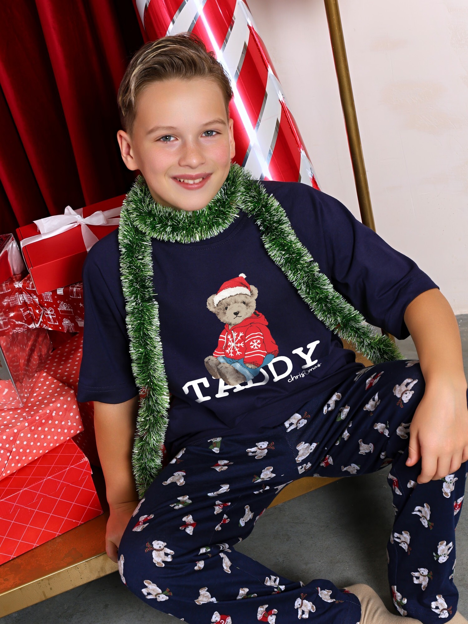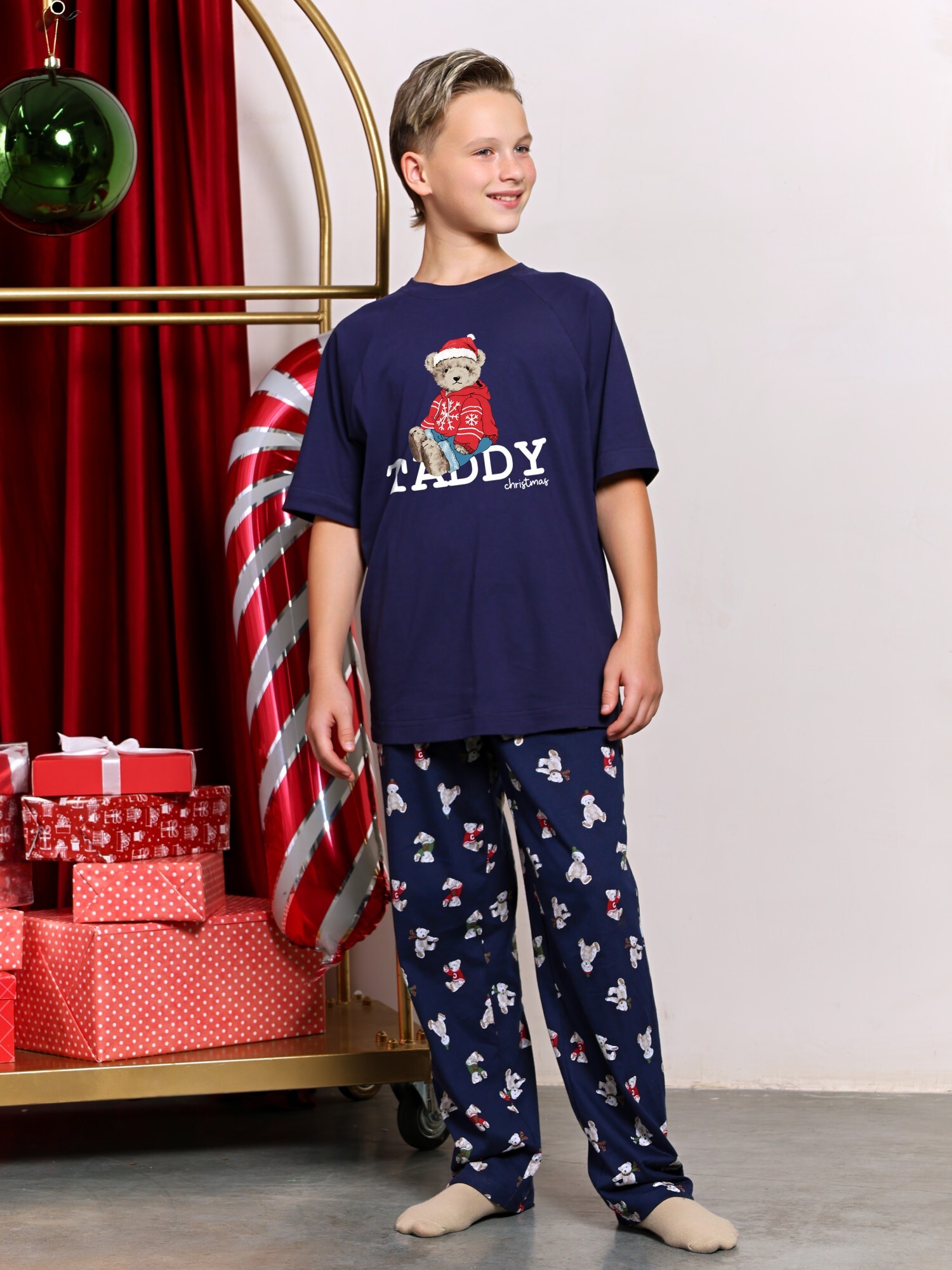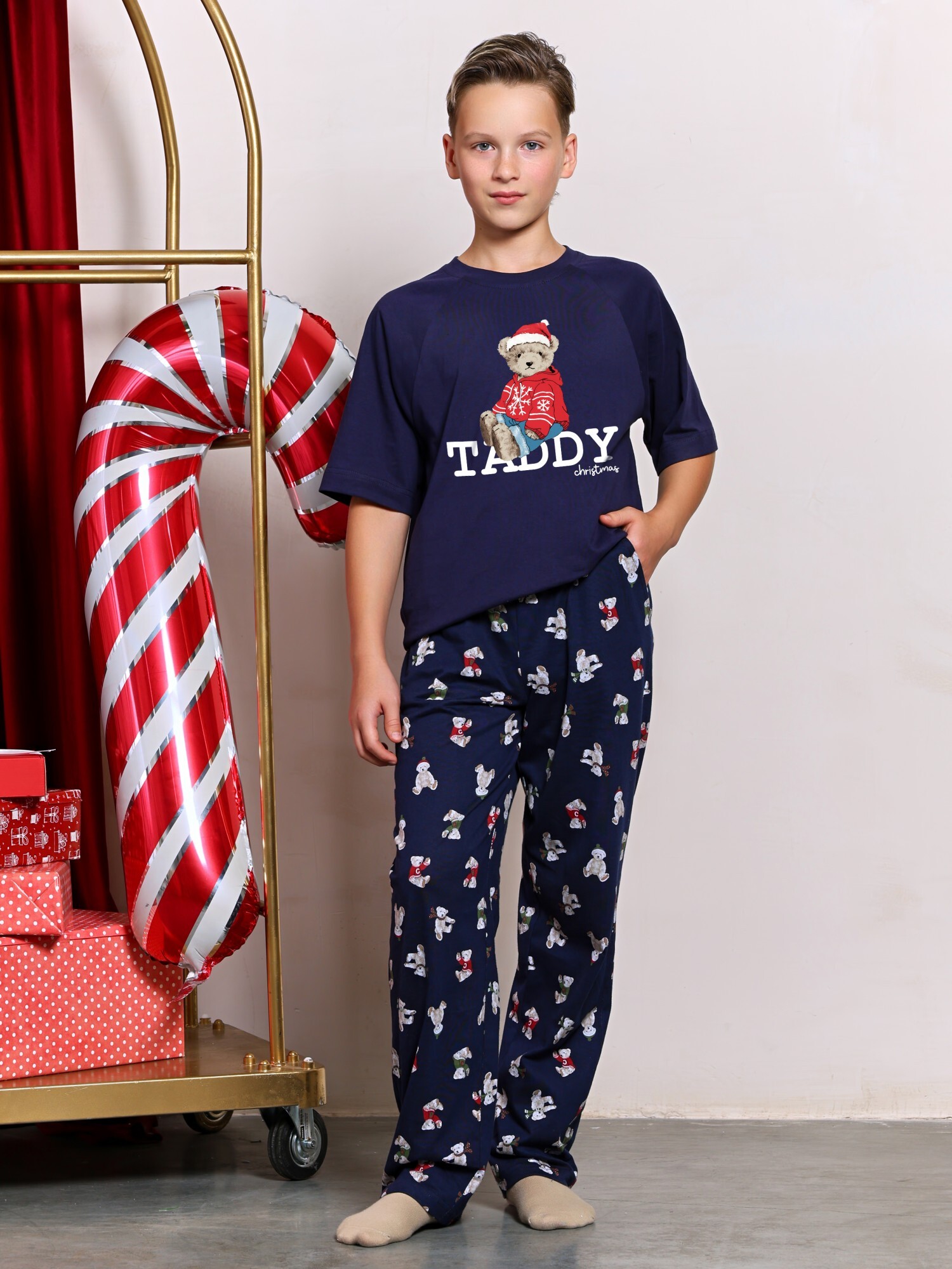 Костюм для мальчика из трикотажного полотна "кулирка" в комбинации двух видов: гладкокрашеного и набивного с тематическим рисунком, состоящий из футболки и брюк. Футболка из гладкокрашеного полотна,с рукавами "реглан" длиной до локтя, горловиной овальной формы, обработанной втачной планкой и отделочной строчкой. В центре переда - принт, выполненгный в технике шелкографии. Брюки из полотна с набивным рисунком длинные, прямые, на притачном поясе с эластичной тесьмой внутри и карманами в боковыых швах.