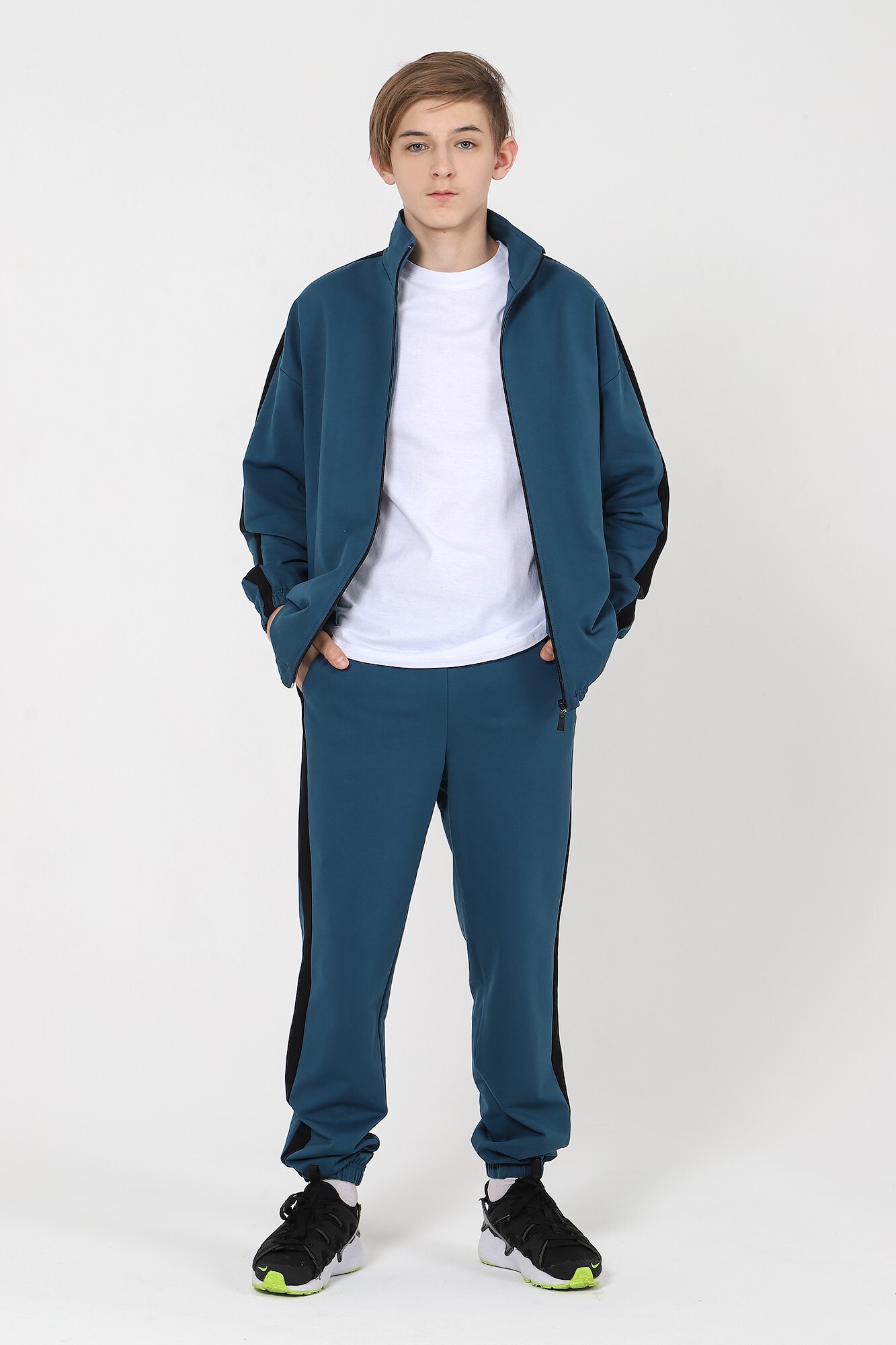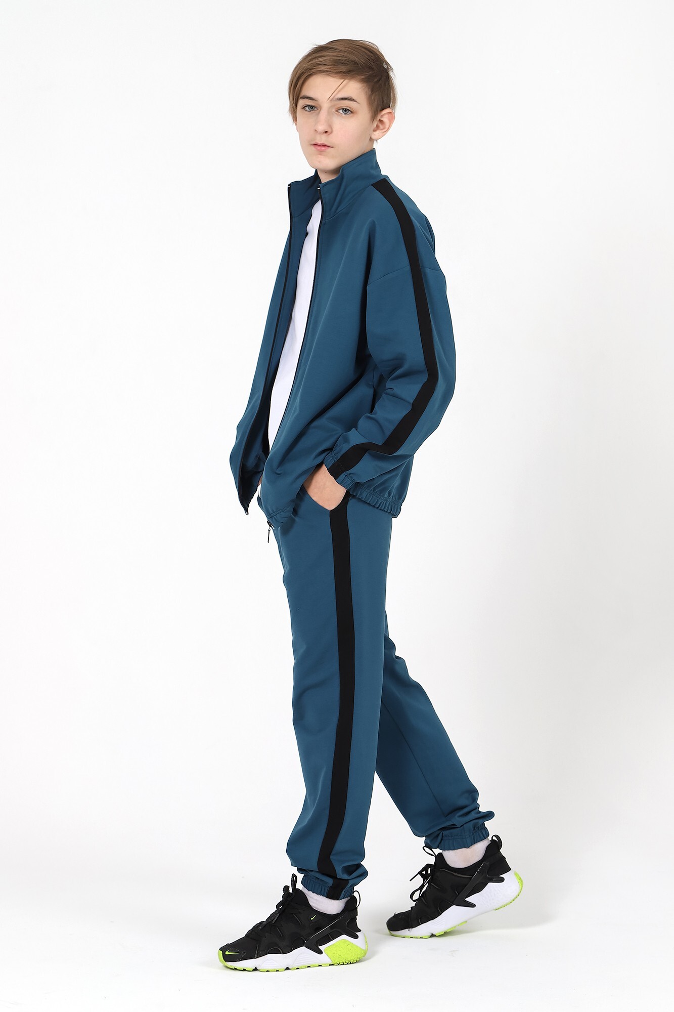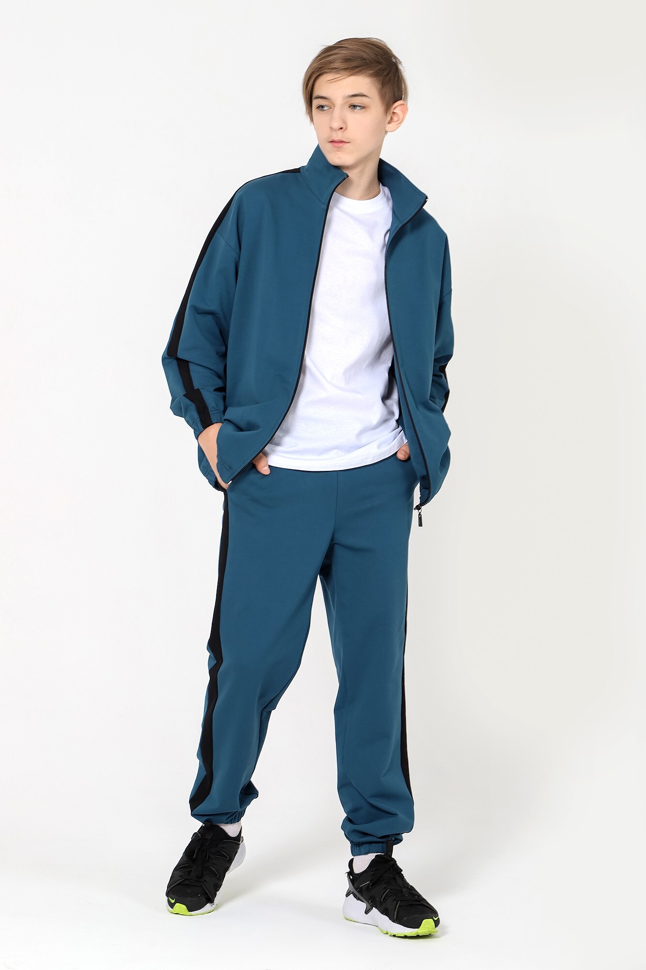 Костюм подростковый из приятного к телу и комфортного в эксплуотации хлопкового футера с добавлением лайкры. Джемпер с воротником-стойкой, со спущенной линией плеч, с застежкой на разъемную молнию, закрытую с изнаночной стороны подбортом, с карманами в боковых швах. Брюки с боковыми карманами, отрезным поясом с отстроченной эластичной тесьмой и внутренним шнуром для регулировки свободы прилегания по линии талии. По низу джемпер, рукава и брючины собраны на эластичную тесьму. По линии плеч, центру рукавов и по боковым линиям брюк - контрастные втавки.