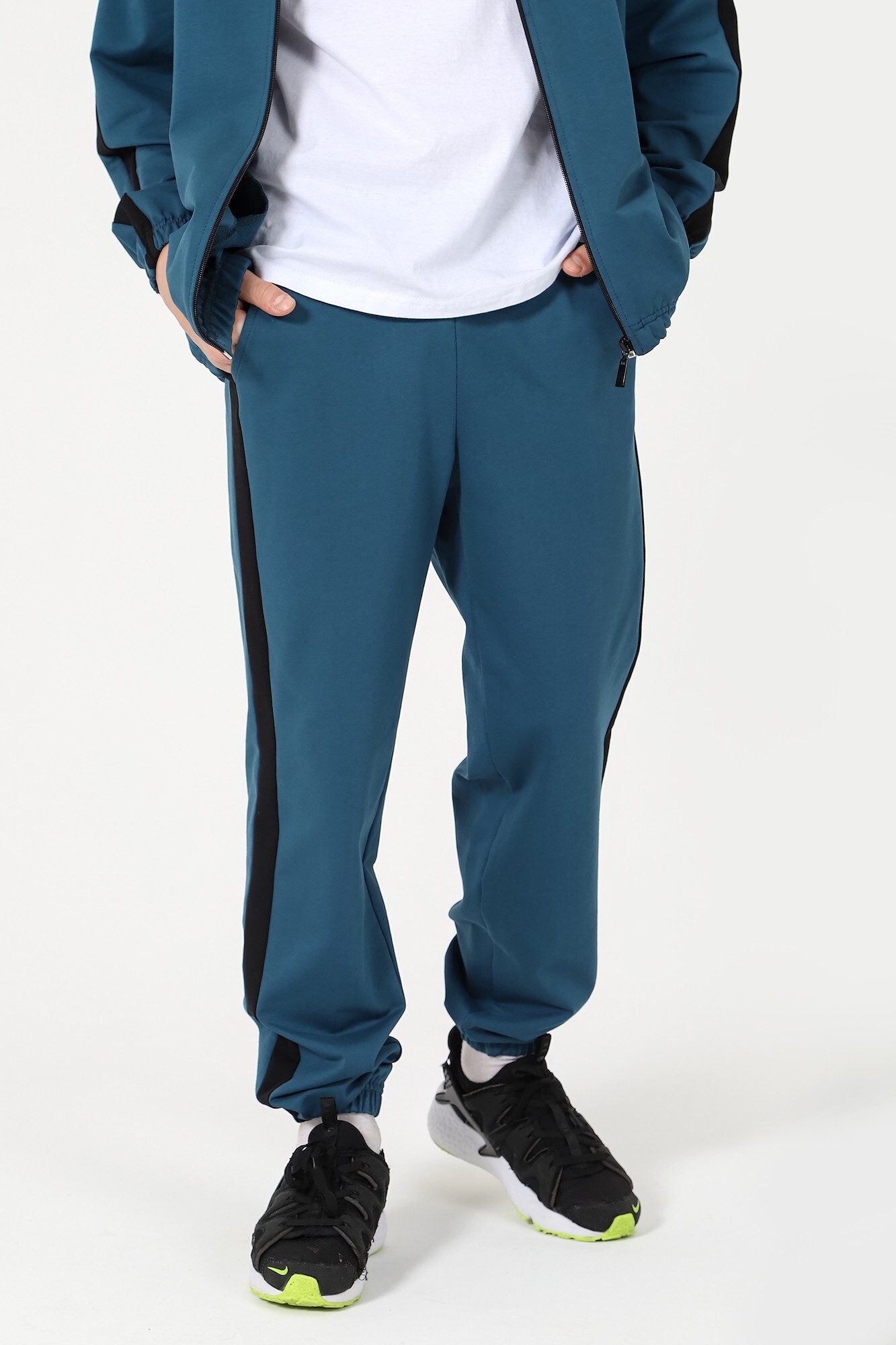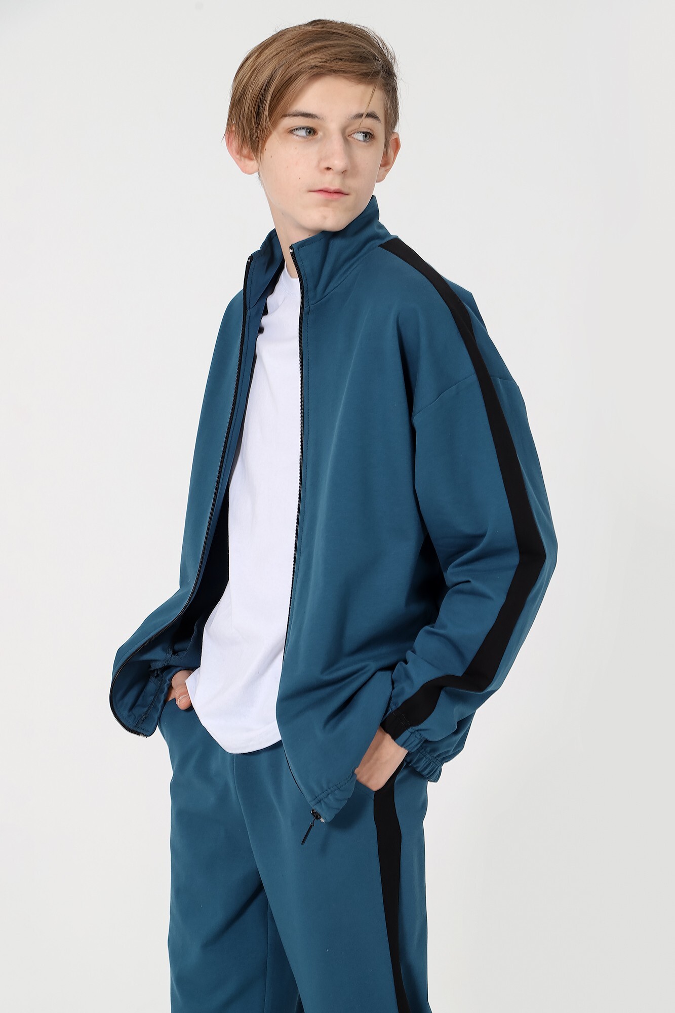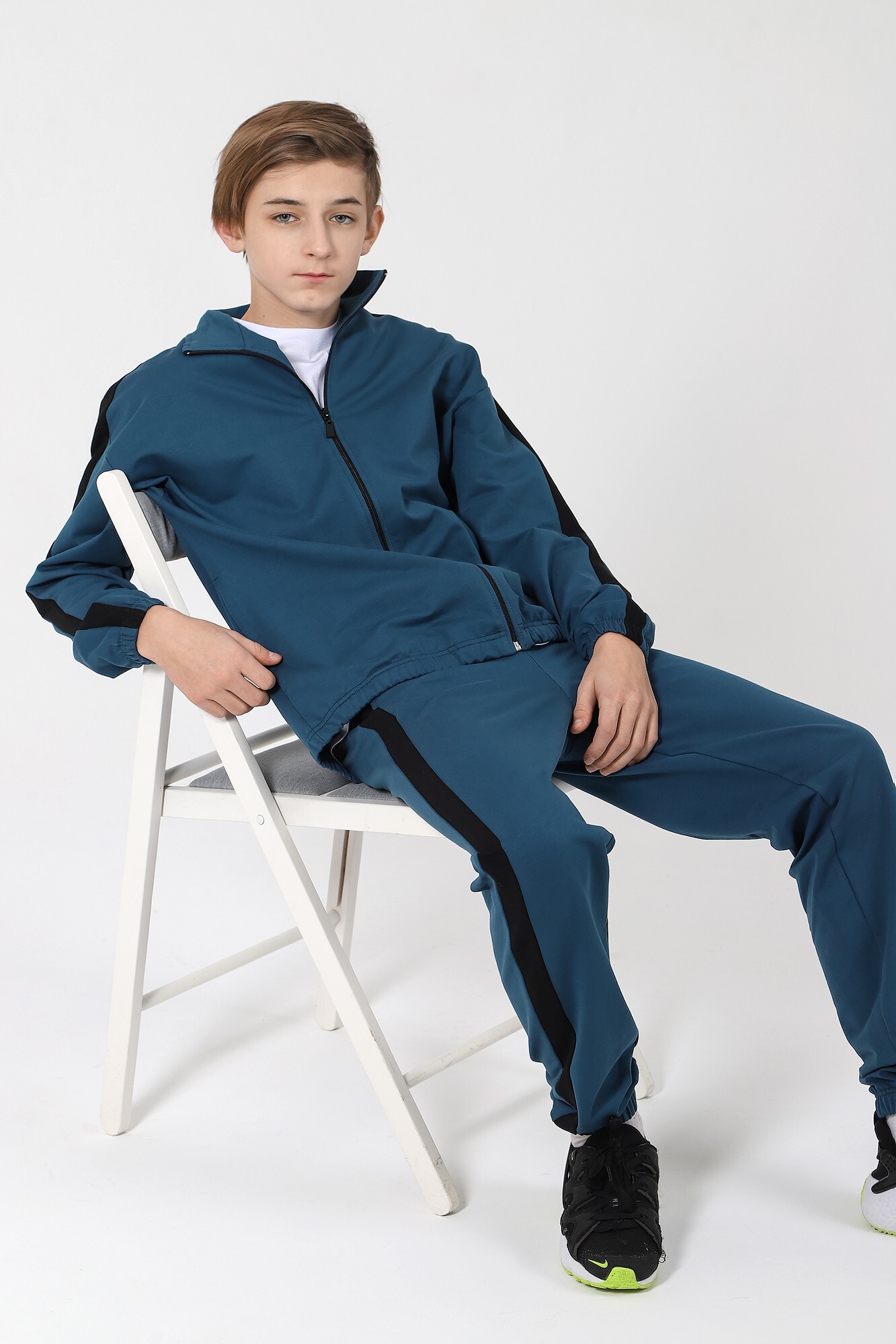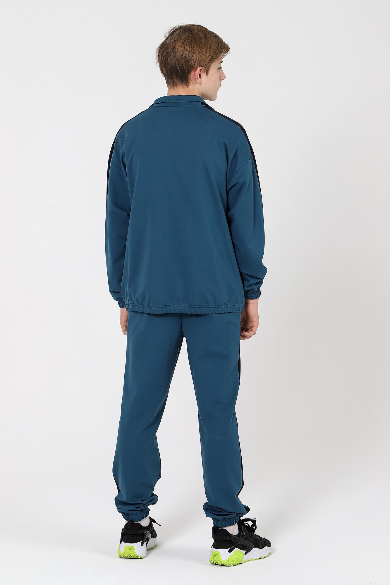 Костюм подростковый из приятного к телу и комфортного в эксплуотации хлопкового футера с добавлением лайкры. Джемпер с воротником-стойкой, со спущенной линией плеч, с застежкой на разъемную молнию, закрытую с изнаночной стороны подбортом, с карманами в боковых швах. Брюки с боковыми карманами, отрезным поясом с отстроченной эластичной тесьмой и внутренним шнуром для регулировки свободы прилегания по линии талии. По низу джемпер, рукава и брючины собраны на эластичную тесьму. По линии плеч, центру рукавов и по боковым линиям брюк - контрастные втавки.