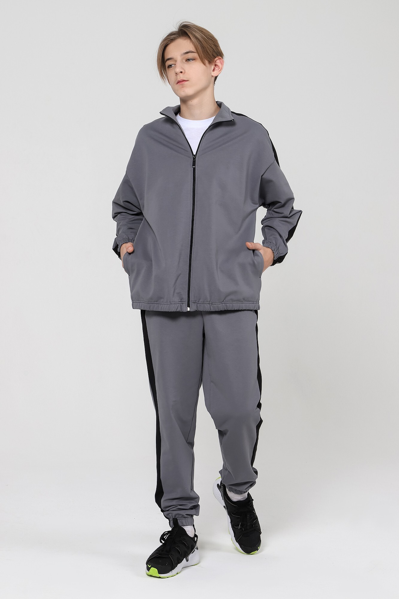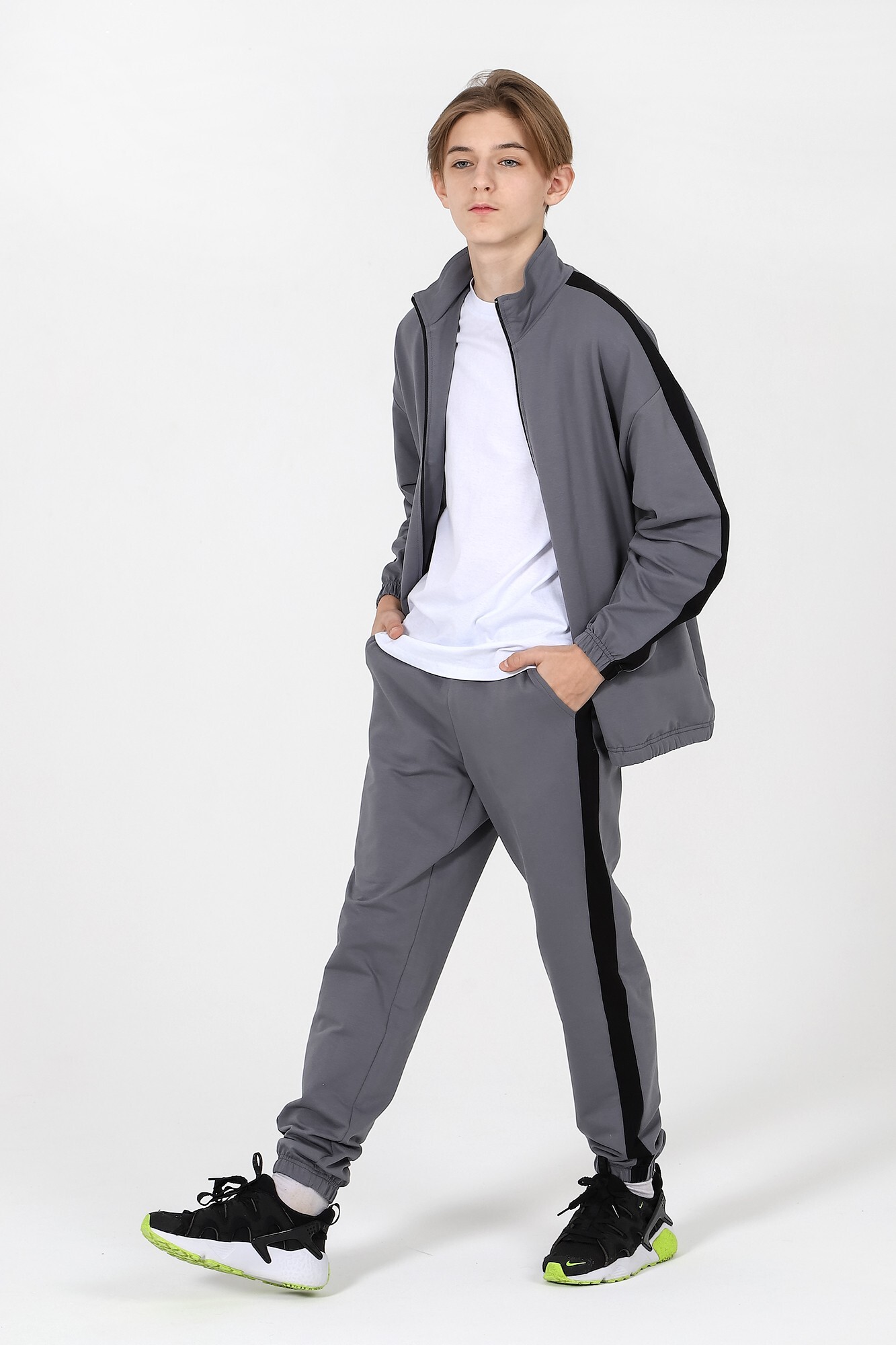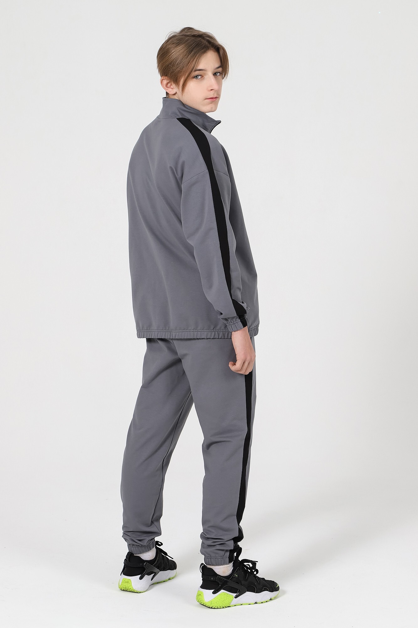 Костюм подростковый из приятного к телу и комфортного в эксплуотации хлопкового футера с добавлением лайкры. Джемпер с воротником-стойкой, со спущенной линией плеч, с застежкой на разъемную молнию, закрытую с изнаночной стороны подбортом, с карманами в боковых швах. Брюки с боковыми карманами, отрезным поясом с отстроченной эластичной тесьмой и внутренним шнуром для регулировки свободы прилегания по линии талии. По низу джемпер, рукава и брючины собраны на эластичную тесьму. По линии плеч, центру рукавов и по боковым линиям брюк - контрастные втавки.