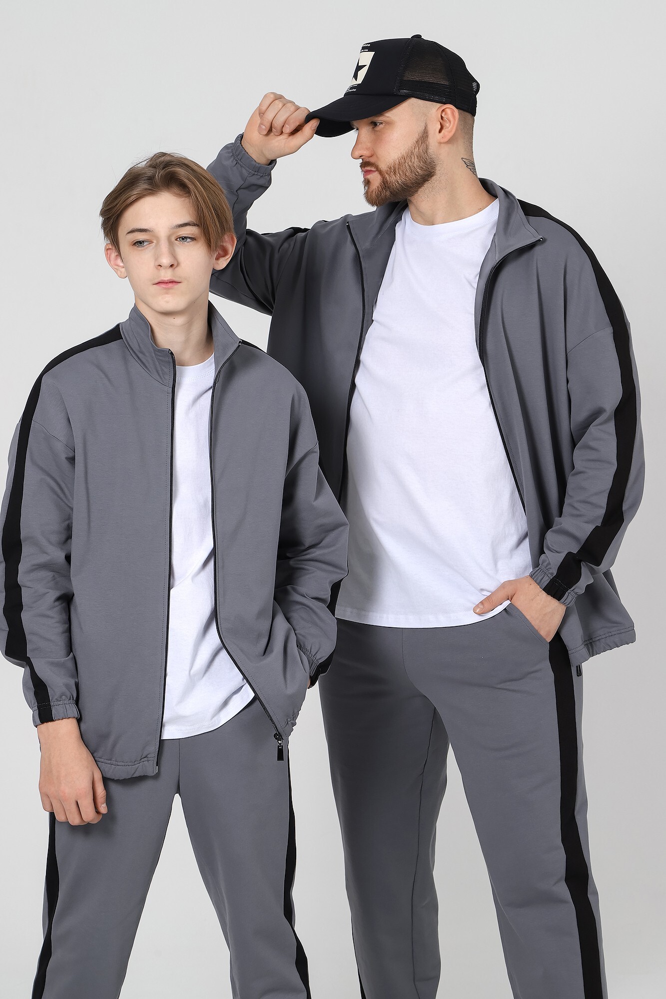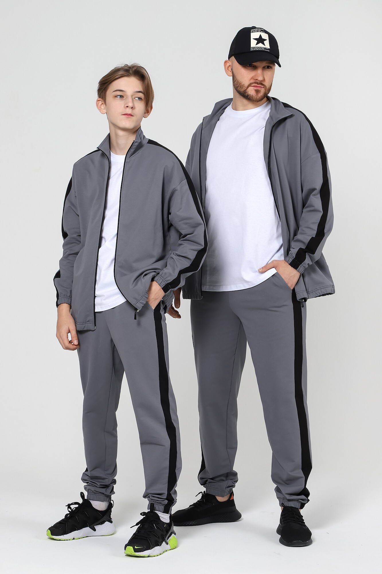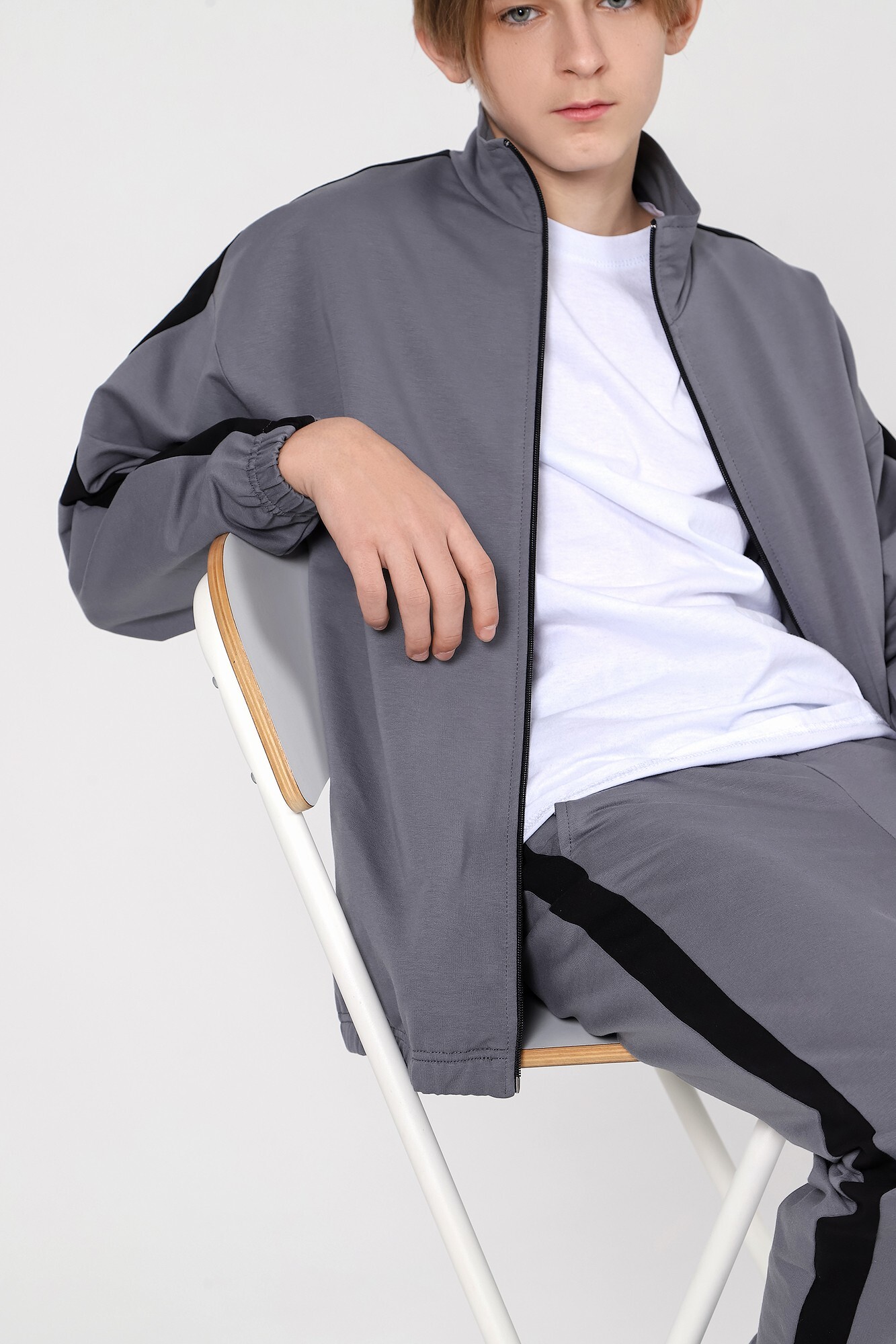 Костюм подростковый из приятного к телу и комфортного в эксплуотации хлопкового футера с добавлением лайкры. Джемпер с воротником-стойкой, со спущенной линией плеч, с застежкой на разъемную молнию, закрытую с изнаночной стороны подбортом, с карманами в боковых швах. Брюки с боковыми карманами, отрезным поясом с отстроченной эластичной тесьмой и внутренним шнуром для регулировки свободы прилегания по линии талии. По низу джемпер, рукава и брючины собраны на эластичную тесьму. По линии плеч, центру рукавов и по боковым линиям брюк - контрастные втавки.