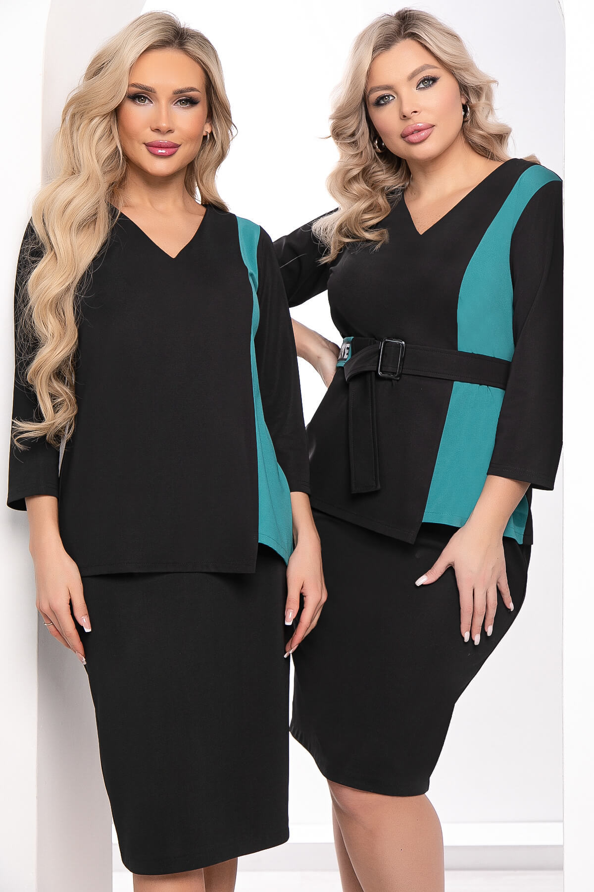 Костюм-двойка, состоящий из юбки на резинке и блузы с поясом и пряжкой. Очень удобный комплект для офиса и деловых встреч. Комфортный костюм в черно-бирюзовом цвете с трендовой асимметрией. Блуза свободного кроя с V-образным вырезом горловины, рукав втачной, укороченный. Юбка прямого кроя, по талии на комфортной резинке. Завершается образ элегантным вырезом по низу юбки.