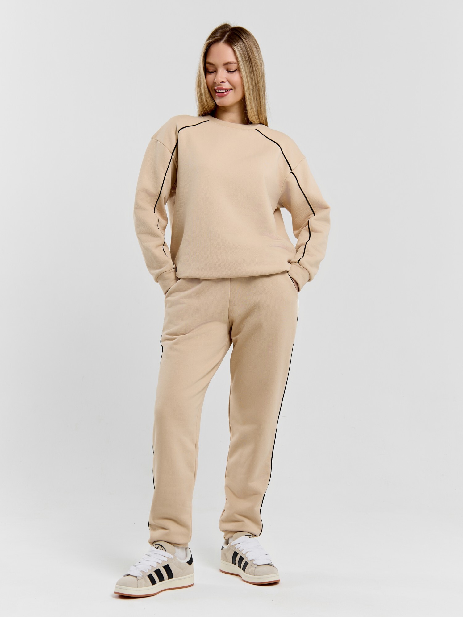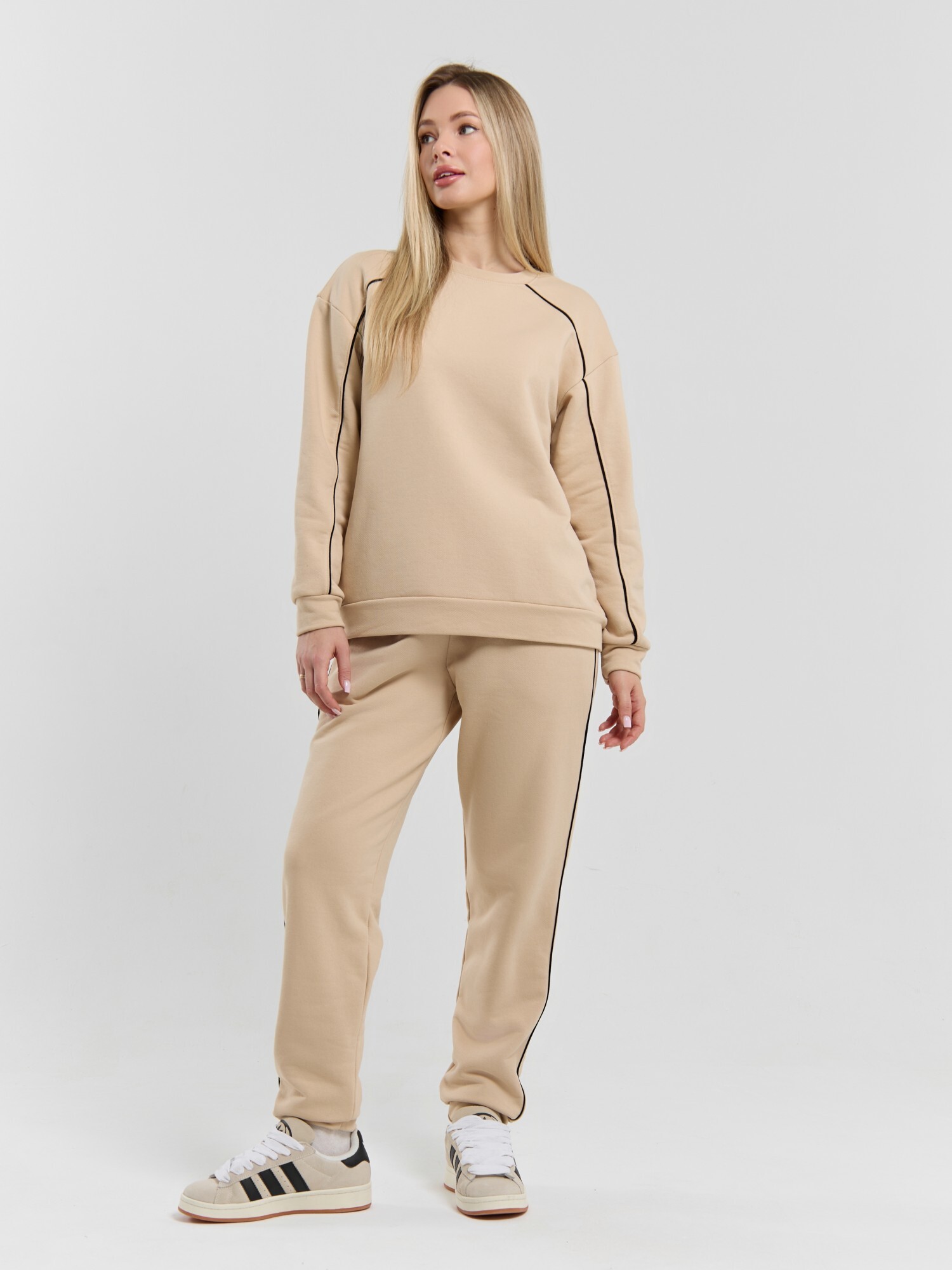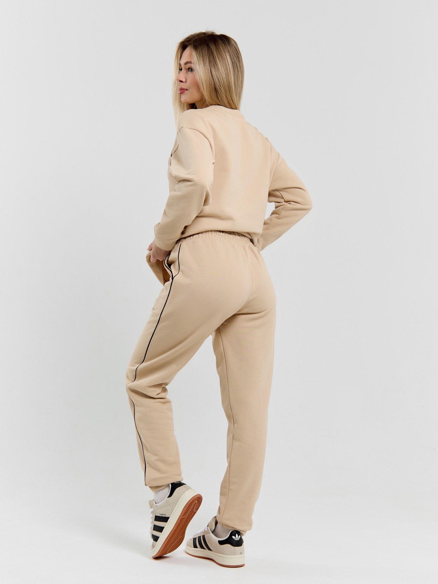 вставлен кант контрастного цвета, переходящий с полочки на рукава и образующий единую линию.Брюки – полуприлегающего силуэта, на притачном поясе с эластичной тесьмой внутри и шнурком, продетым через две петли в центре пояса. Боковые швы брюк, входы в карман- с кантом контрастного цвета в швах соединения. Нижние срезы брюк обработаны манжетами.
