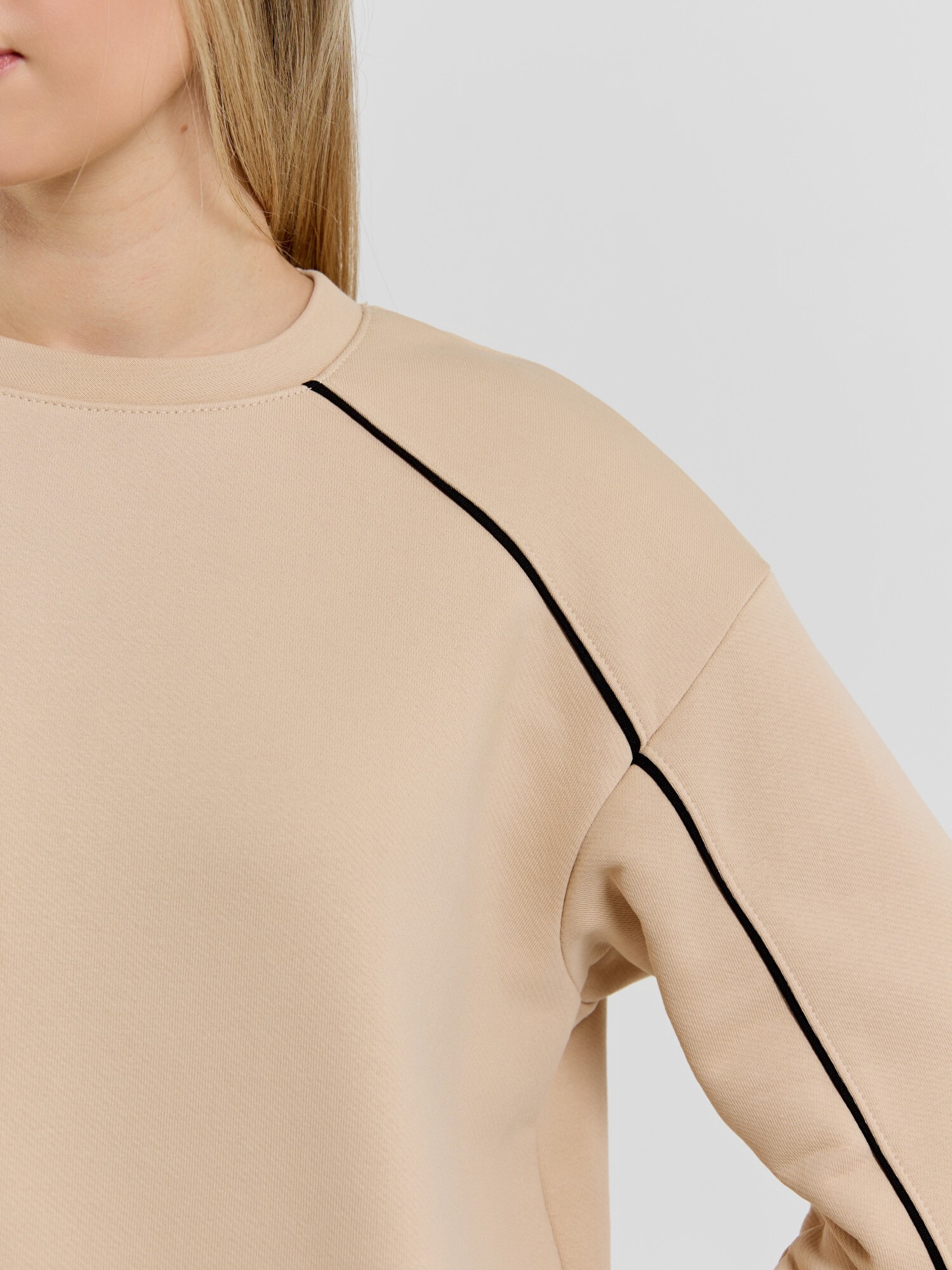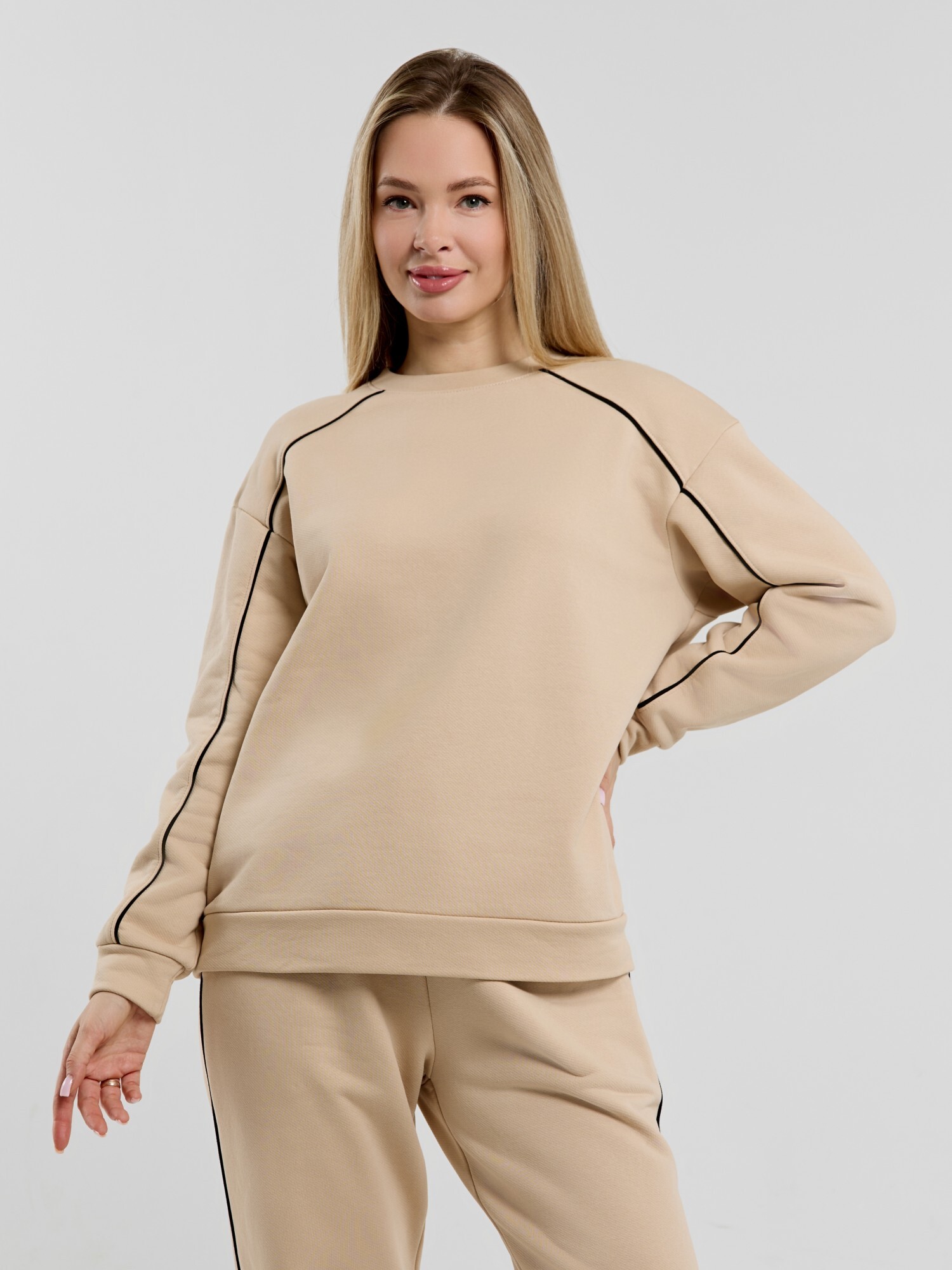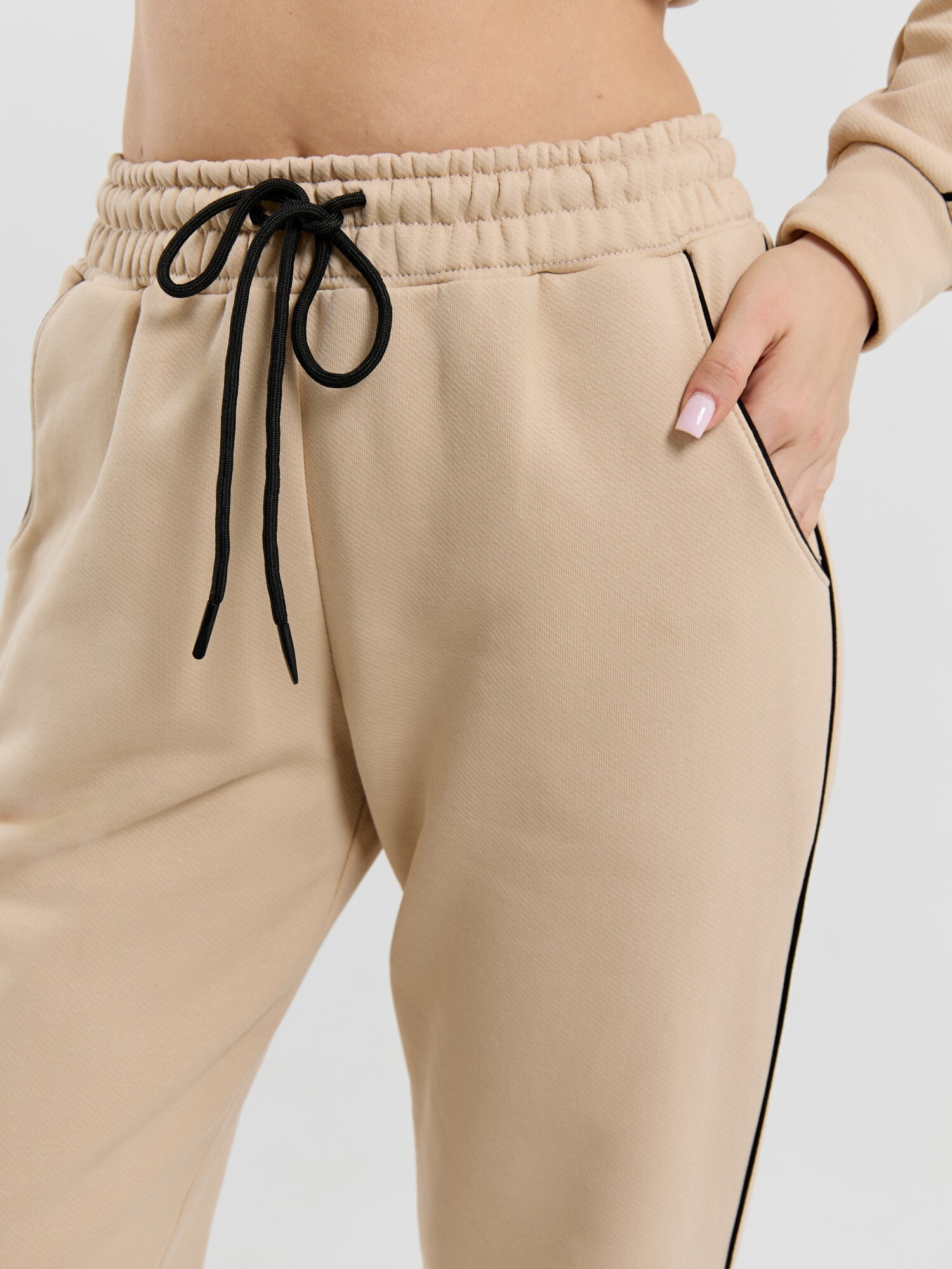 вставлен кант контрастного цвета, переходящий с полочки на рукава и образующий единую линию.Брюки – полуприлегающего силуэта, на притачном поясе с эластичной тесьмой внутри и шнурком, продетым через две петли в центре пояса. Боковые швы брюк, входы в карман- с кантом контрастного цвета в швах соединения. Нижние срезы брюк обработаны манжетами.