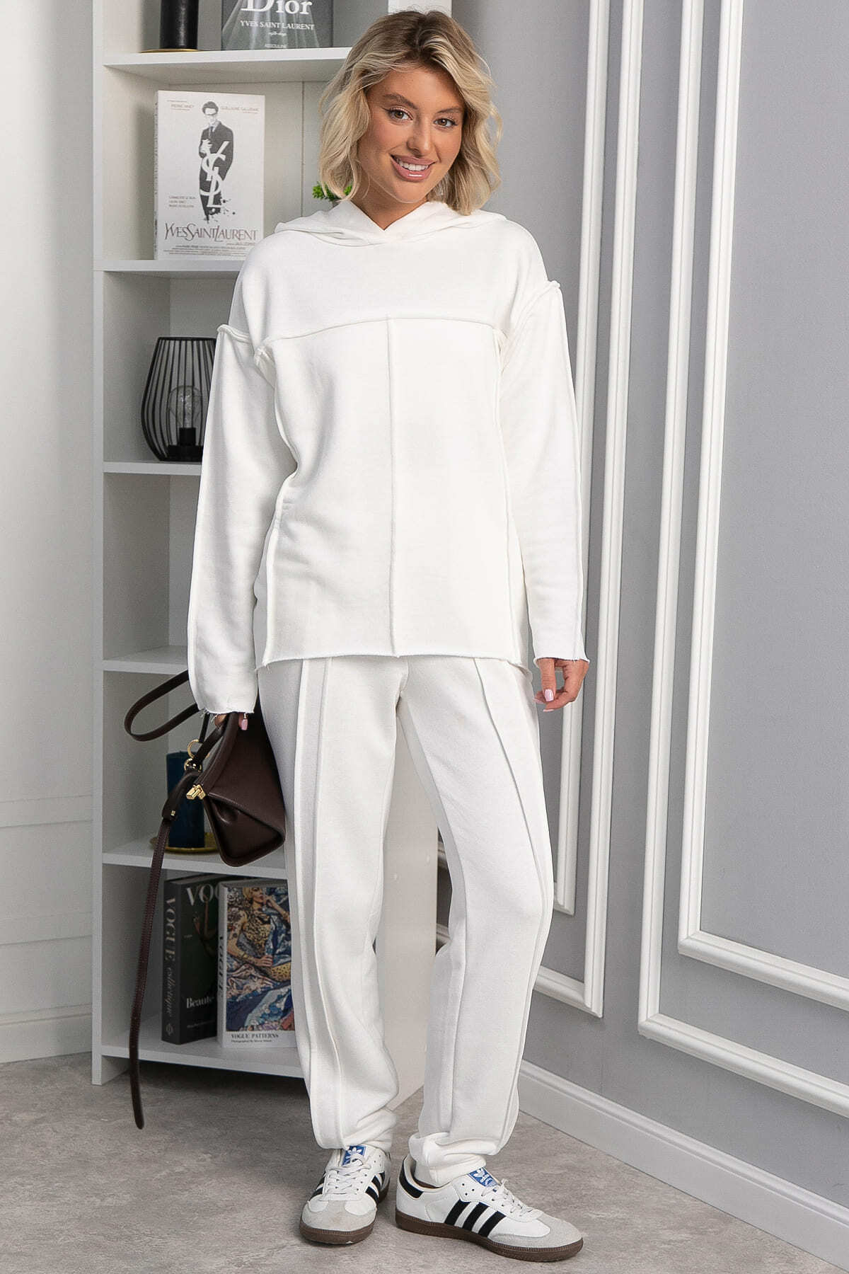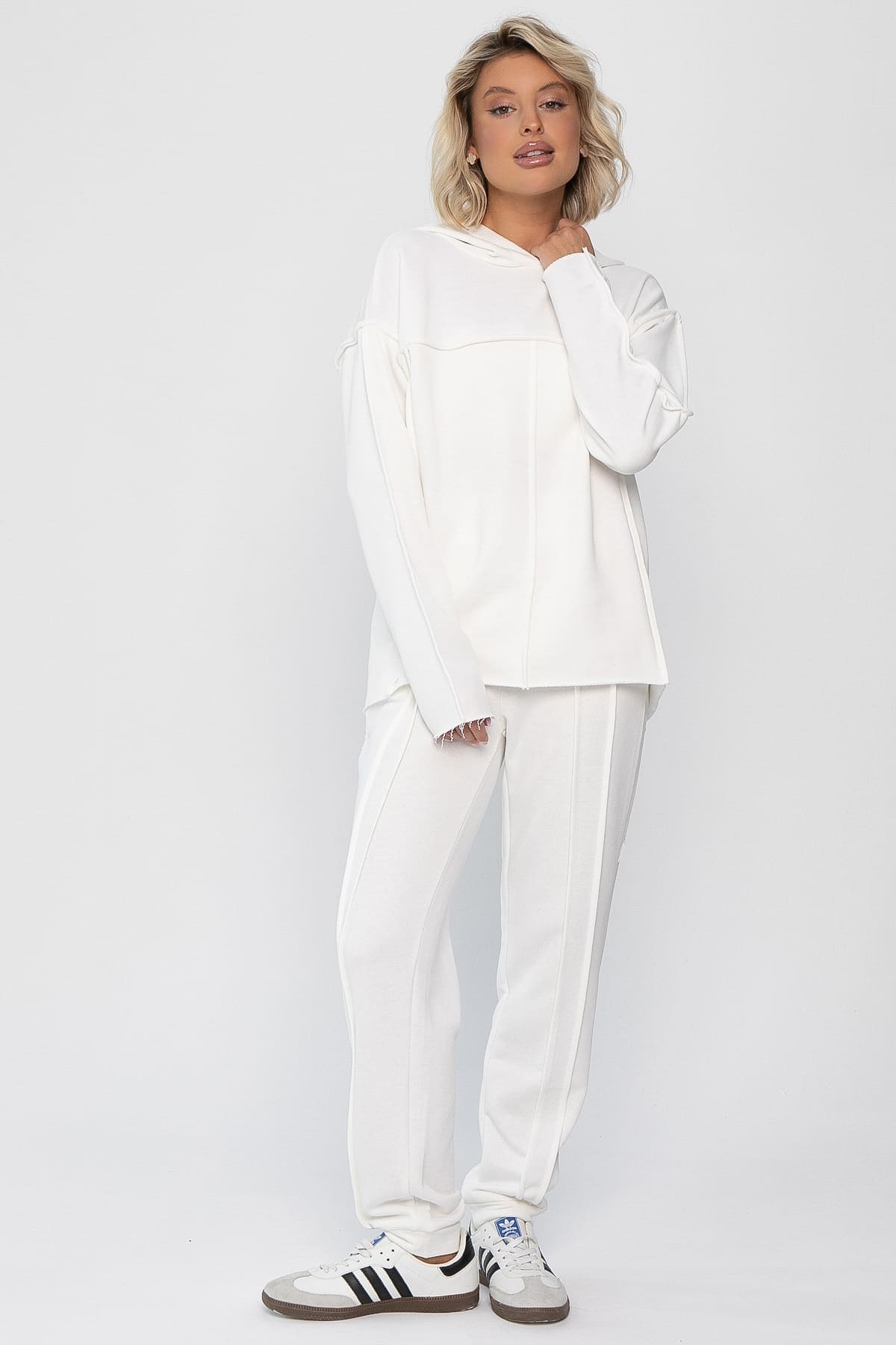 Настоящий must-have для любителей активного отдыха и городского стиля! Эко-стиль: в этом стиле намеренное выставление напоказ швов, необработанных краев как часть эстетики, подчёркивающей натуральность и процесс создания одежды. Брюки на резинке по талии, отсрочка по переду, отсрочка по задней части, манжеты по низу брюк. Спущенное плечо верха, отсрочки по спинке и по переду, по боковым частям рукавов. Низ верха асимметричный: передняя часть короче задней, низ изделия скруглённый. Капюшон украшает изделие и добавляет стиля. Низ рукавов и низ верха не обработан. У брюк есть передние и задние карманы. Футер — отличная ткань, которая очень теплая и комфортная. Необычные дизайнерские решения и выразительный стиль делают этот костюм не только комфортным, но и незабываемым элементом вашего гардероба, привлекающим внимание окружающих.