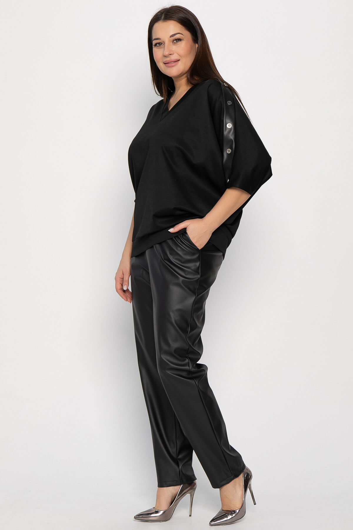Представляем стильный и современный костюм-двойку, который может стать основой вашего гардероба. Этот комплект, включающий удобную трикотажную блузу и элегантные брюки из экокожи, идеально подходит как для повседневных образов, так и для особых мероприятий. Особенностью блузы является декоративная планка из экокожи, расположенная на одном из плечевых швов. Эта деталь, украшенная стильными пуговицами, придаёт блузе уникальный и завершённый вид, создавая интересный визуальный контраст.