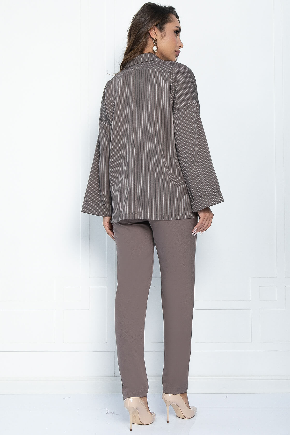 Брючный костюм в кофейном оттенке — один из лучших вариантов разнообразить гардероб! В нём вы будете себя чувствовать уверенно и комфортно. Можно носить как совместно, так и раздельно. Этот брючный костюм подойдет для работы в офисе, деловых встреч и мероприятий. Жакет в полоску свободного кроя на пуговицах, рукав спущенный на манжете, разрезы по боковым швам. Брюки полуприлегающего силуэта на резинке, есть карманы.