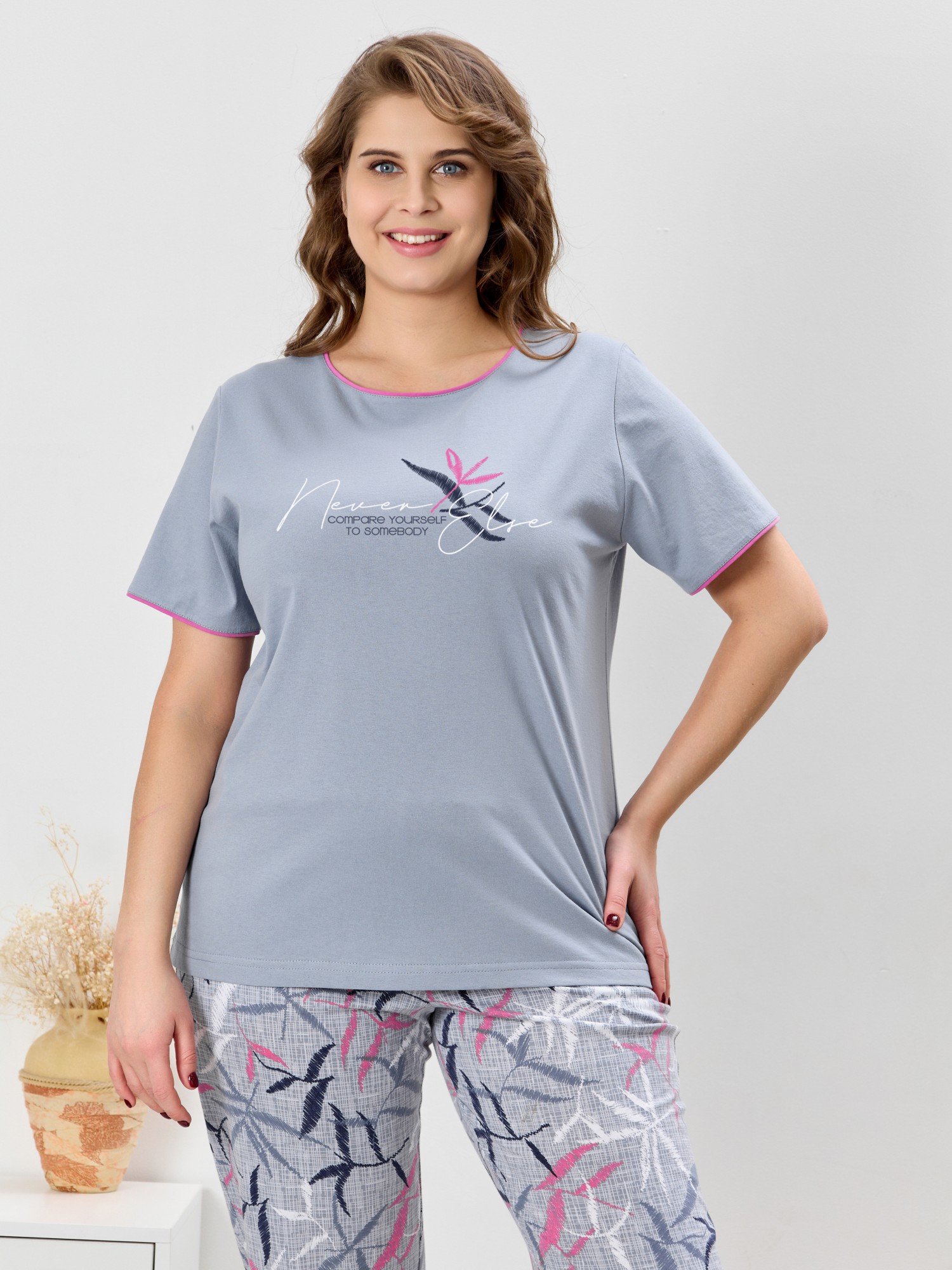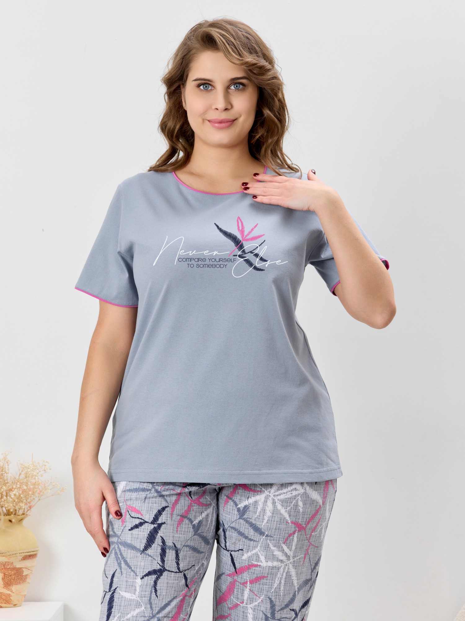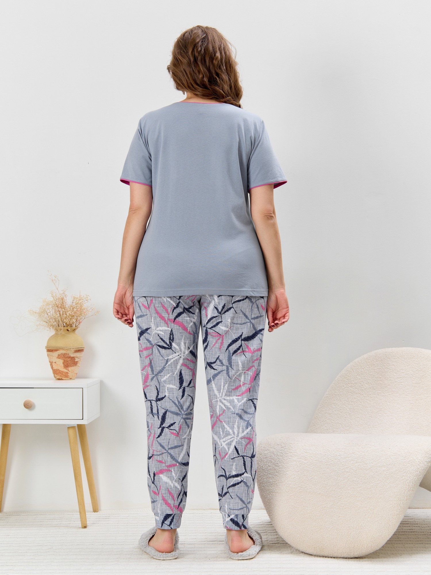 Костюм молодежный из трикотажного полотна «кулирка» в комбинации двух видов: с набивным рисунком и гладкокрашенного в единой цветовой гамме, состоящий из футболки и брюк. Футболка - из гладкокрашенного полотна, классического покроя, с короткими втачными рукавами, горловиной овальной формы и принтом на полочке, выполненным в технике «шелкографии». Горловина и низ рукавов обработаны узким притачным кантом.Брюки - из полотна с набивным рисунком, длинные, на притачном поясе с эластичной