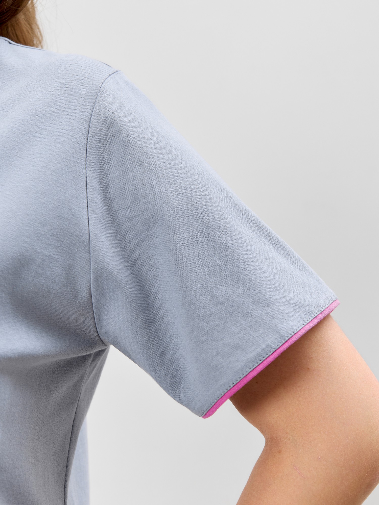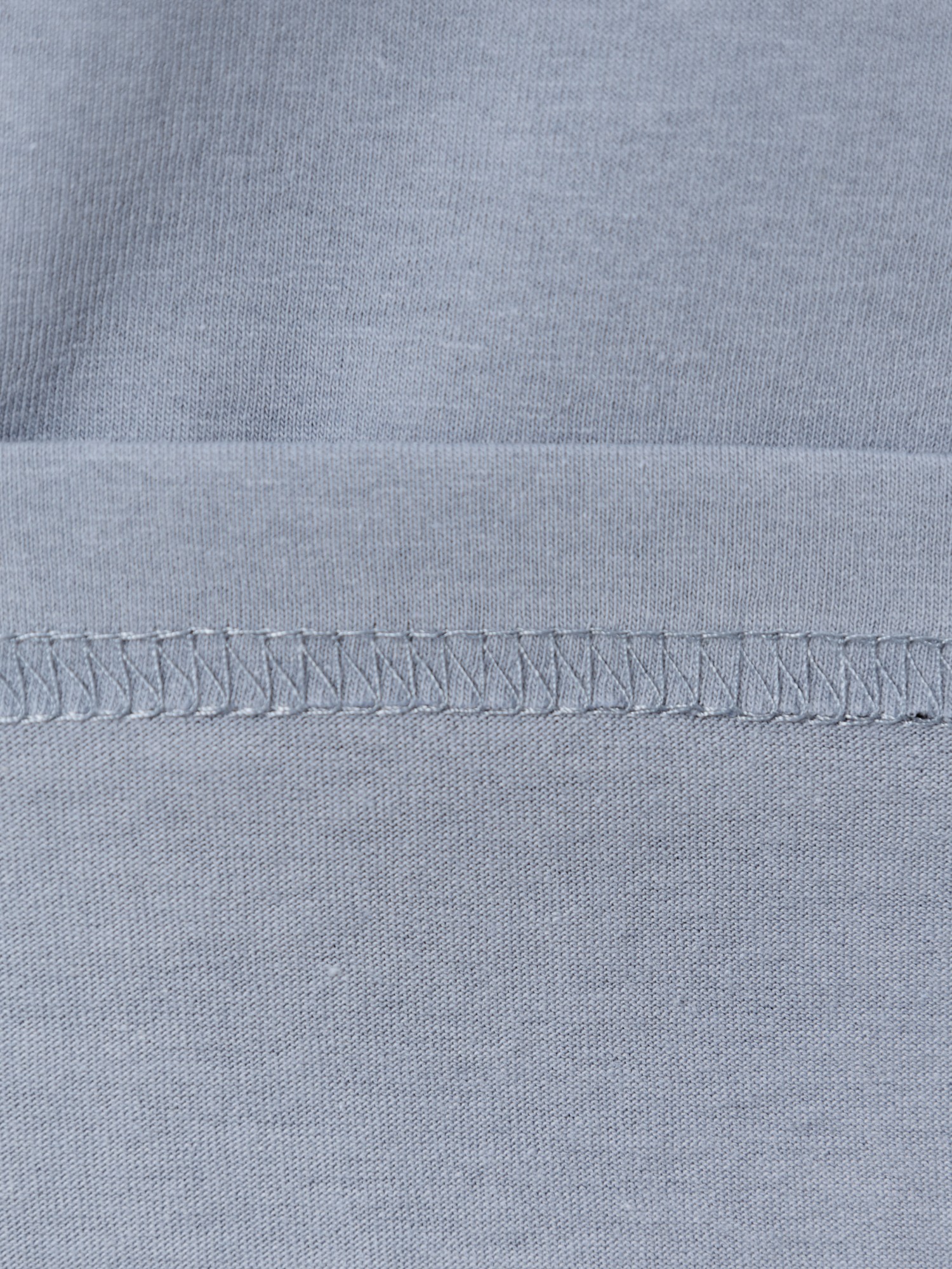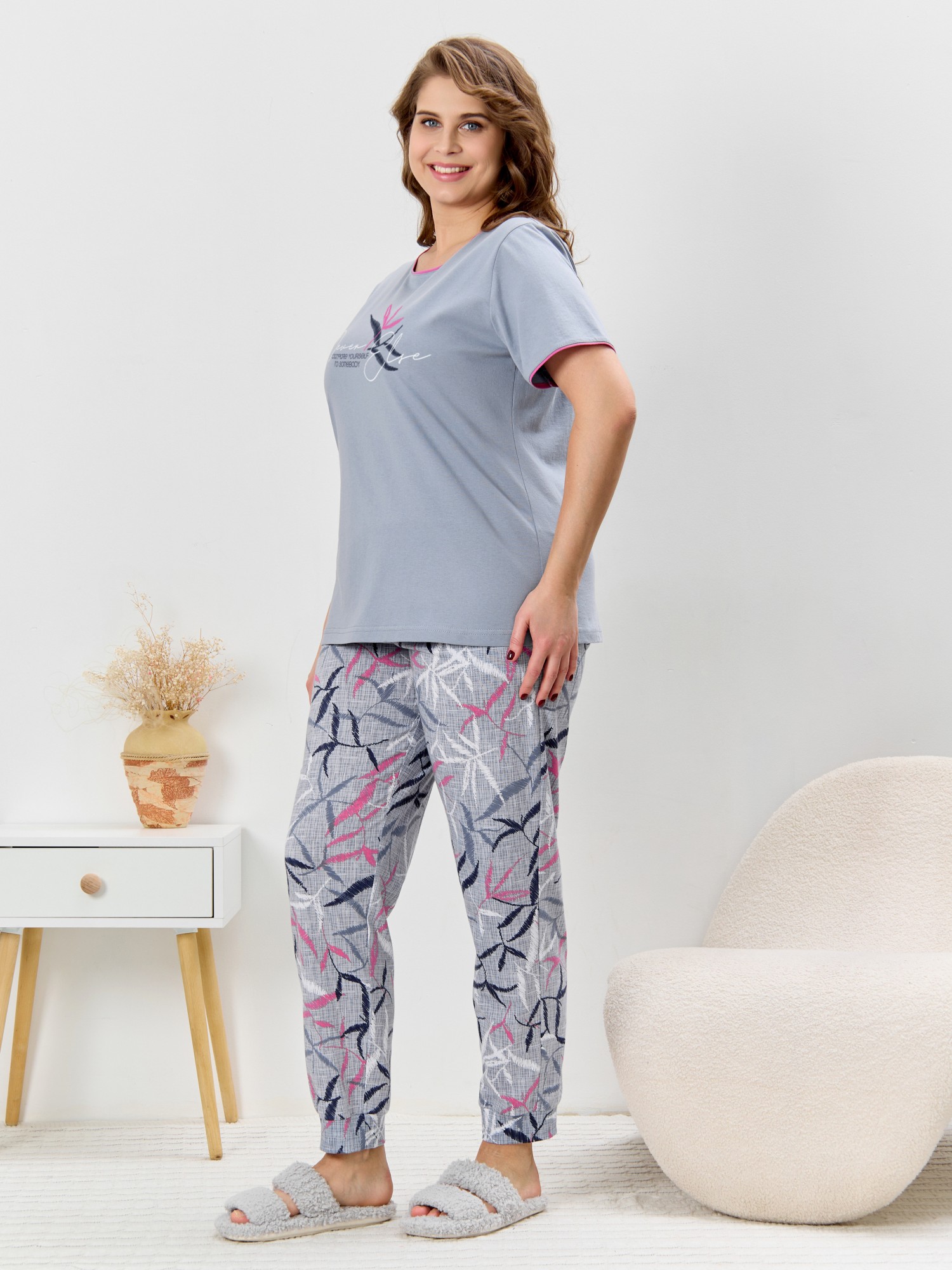 Костюм молодежный из трикотажного полотна «кулирка» в комбинации двух видов: с набивным рисунком и гладкокрашенного в единой цветовой гамме, состоящий из футболки и брюк. Футболка - из гладкокрашенного полотна, классического покроя, с короткими втачными рукавами, горловиной овальной формы и принтом на полочке, выполненным в технике «шелкографии». Горловина и низ рукавов обработаны узким притачным кантом.Брюки - из полотна с набивным рисунком, длинные, на притачном поясе с эластичной