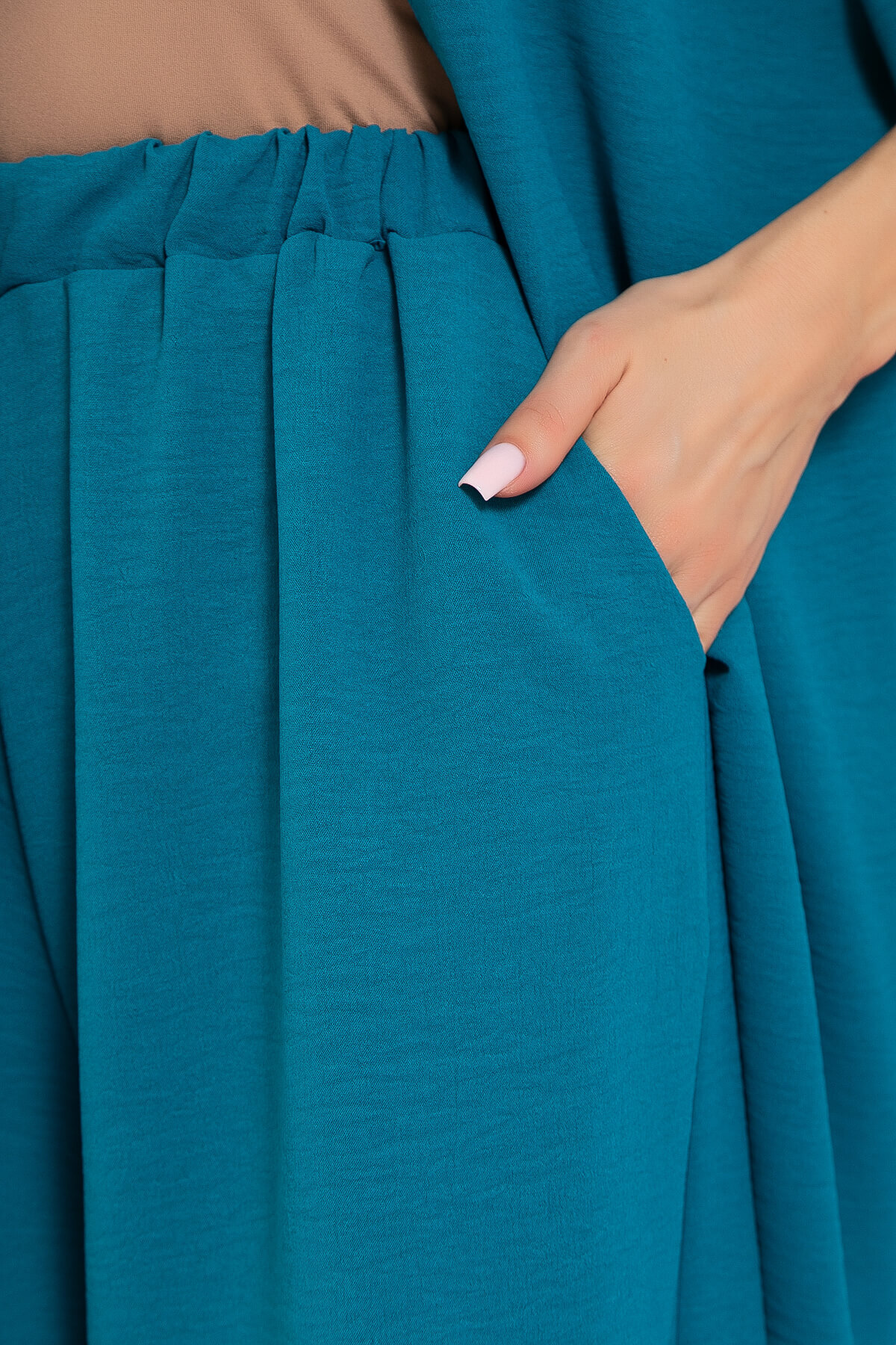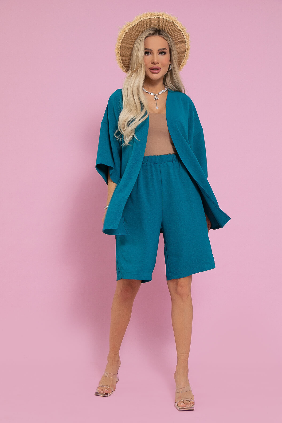 Очень удобный и комфортный костюм-двойка с шортами — универсальный вариант на лето. Лёгкий кардиган свободного кроя с удлинёнными разрезами по бокам, втачные укороченные рукава рубашечного кроя. Его можно носить нараспашку или завязать полочки узлом. Шорты свободного кроя, с притачным поясом на резинке, не сковывают движений и не подчёркивают недостатки. Два боковых кармана функциональны и не придают лишнего объёма. В таком костюме можно смело отправиться на прогулку или на встречу с друзьями.