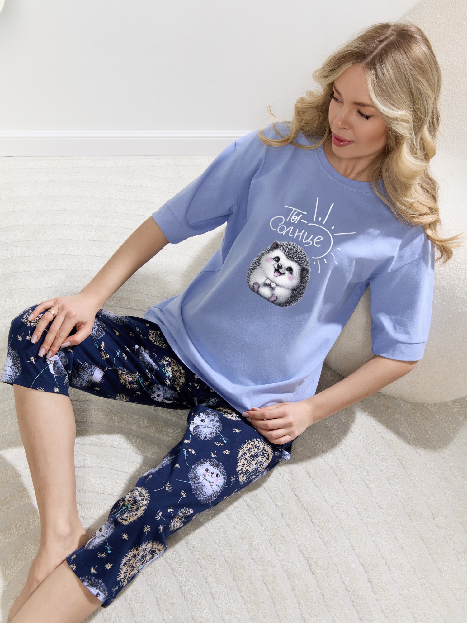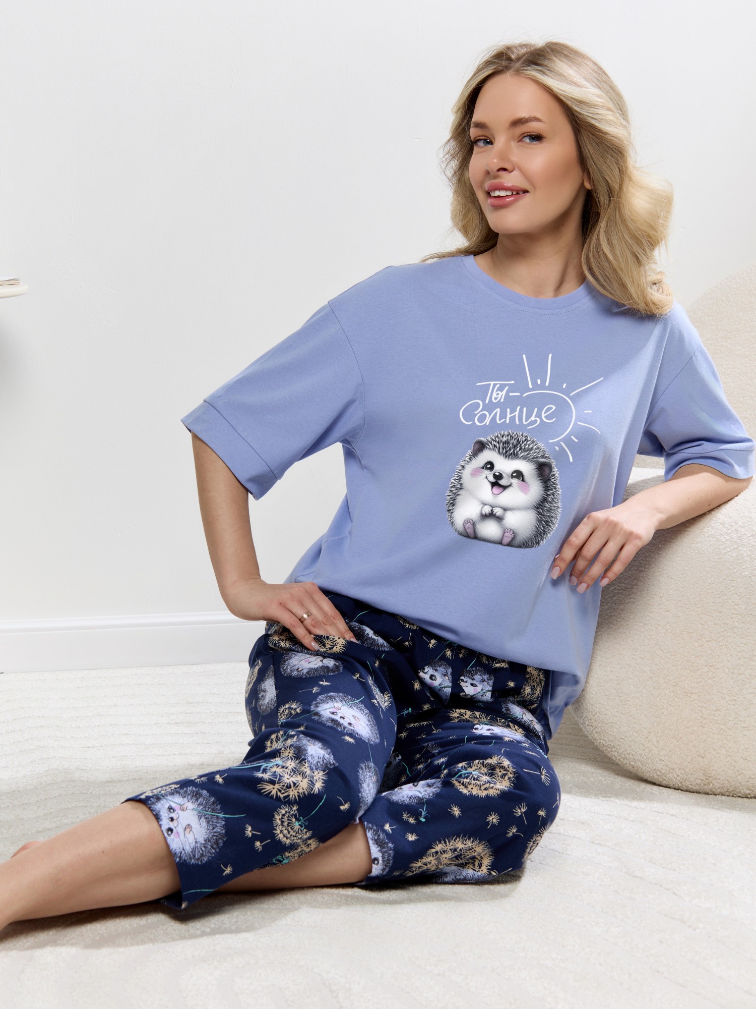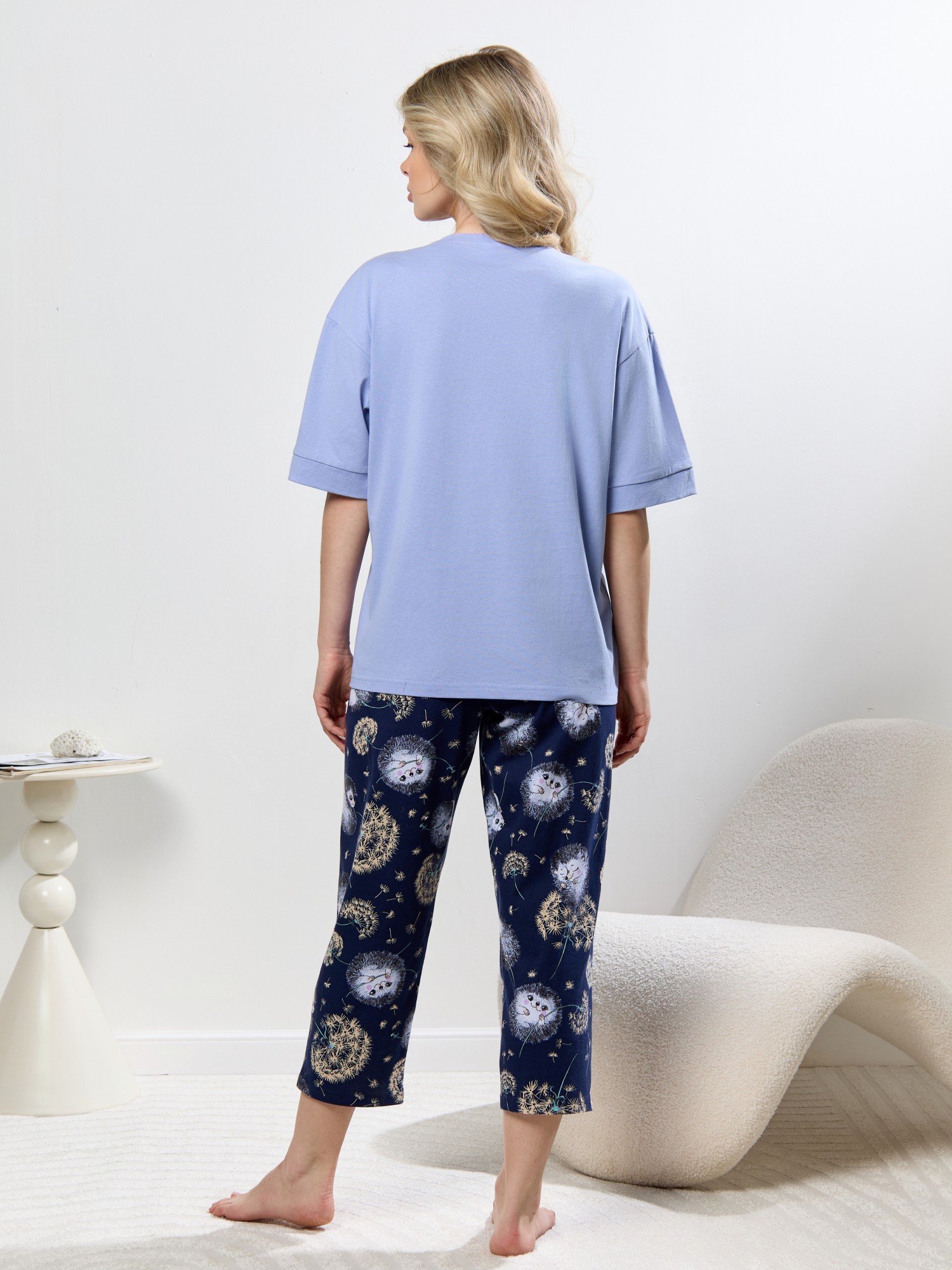 Костюм молодежный из трикотажного полотна «кулирка» в комбинации двух видов: с набивным рисунком и гладкокрашенного в единой цветовой гамме, состоящий из футболки и брюк. Футболка - из гладкокрашенного полотна, классического покроя, с короткими втачными рукавами, горловиной овальной формы и принтом на полочке, выполненным в технике «шелкографии». Горловина обработана притачной бейкой из основного материала, рукава обработаны притачными манжетами.Брюки - из полотна с набивным рисунком, длинные, слегка зауженные книзу, в боковых швах карманы, на притачном поясе с эластичной тесьмой внутри.