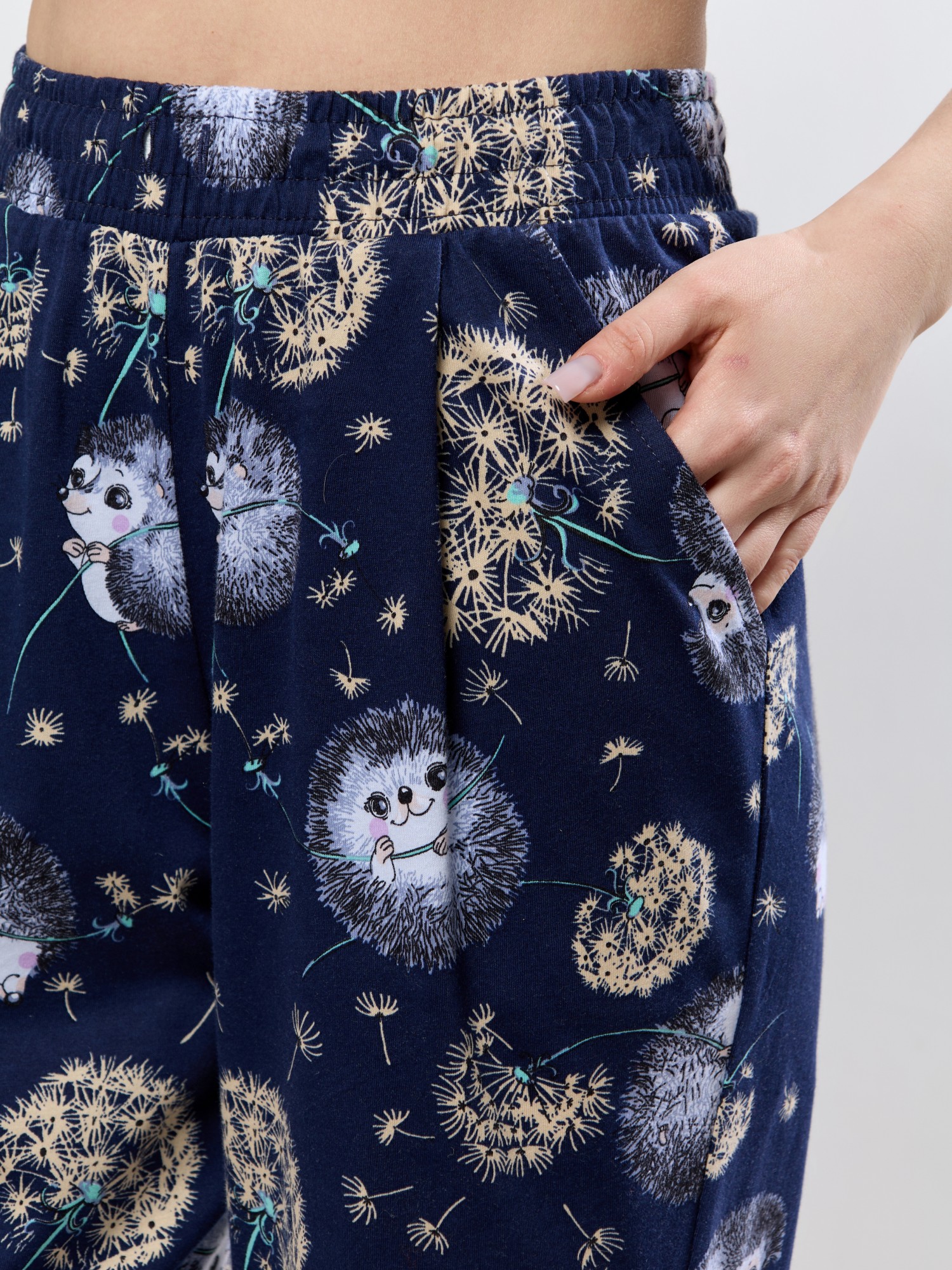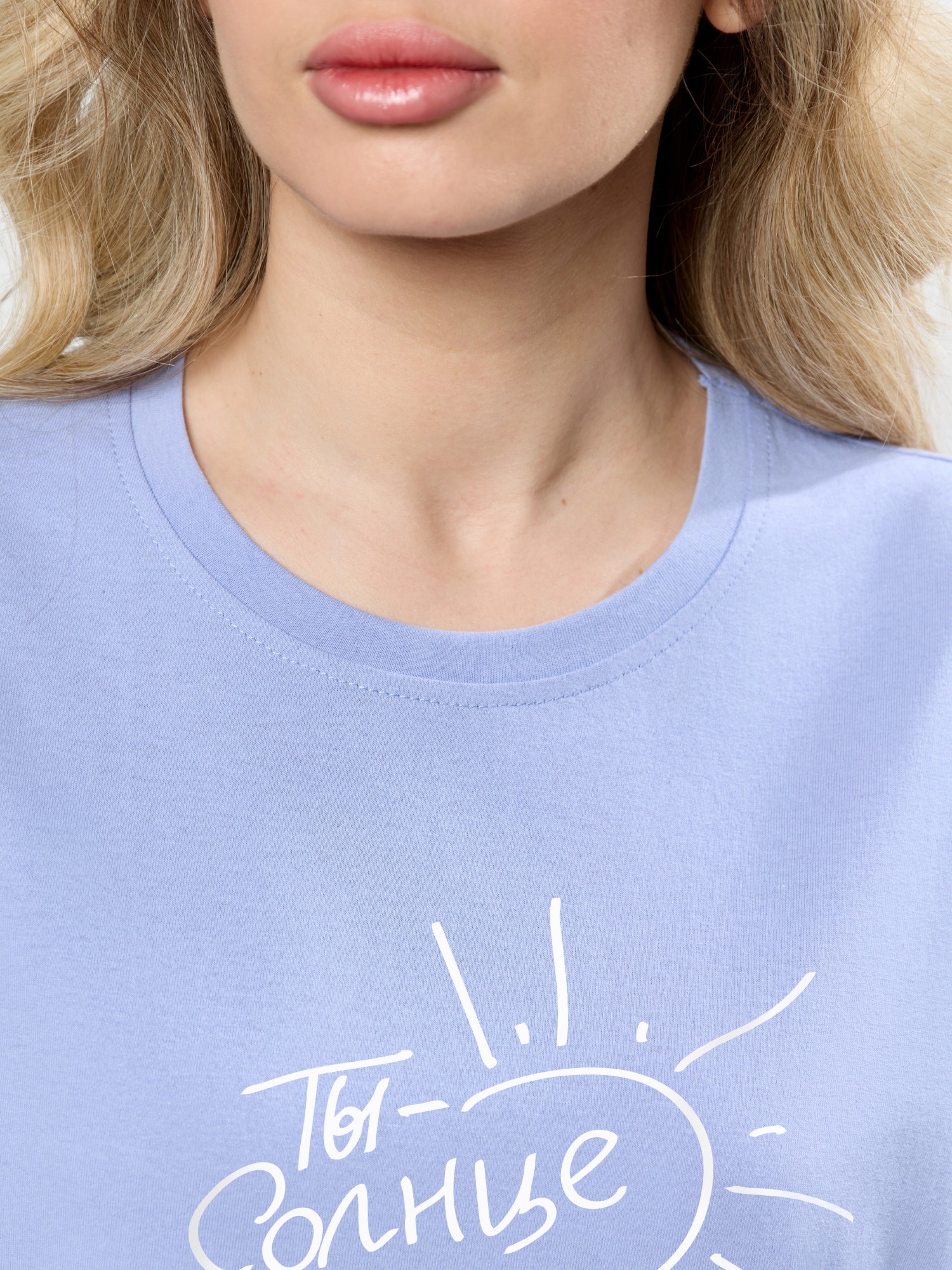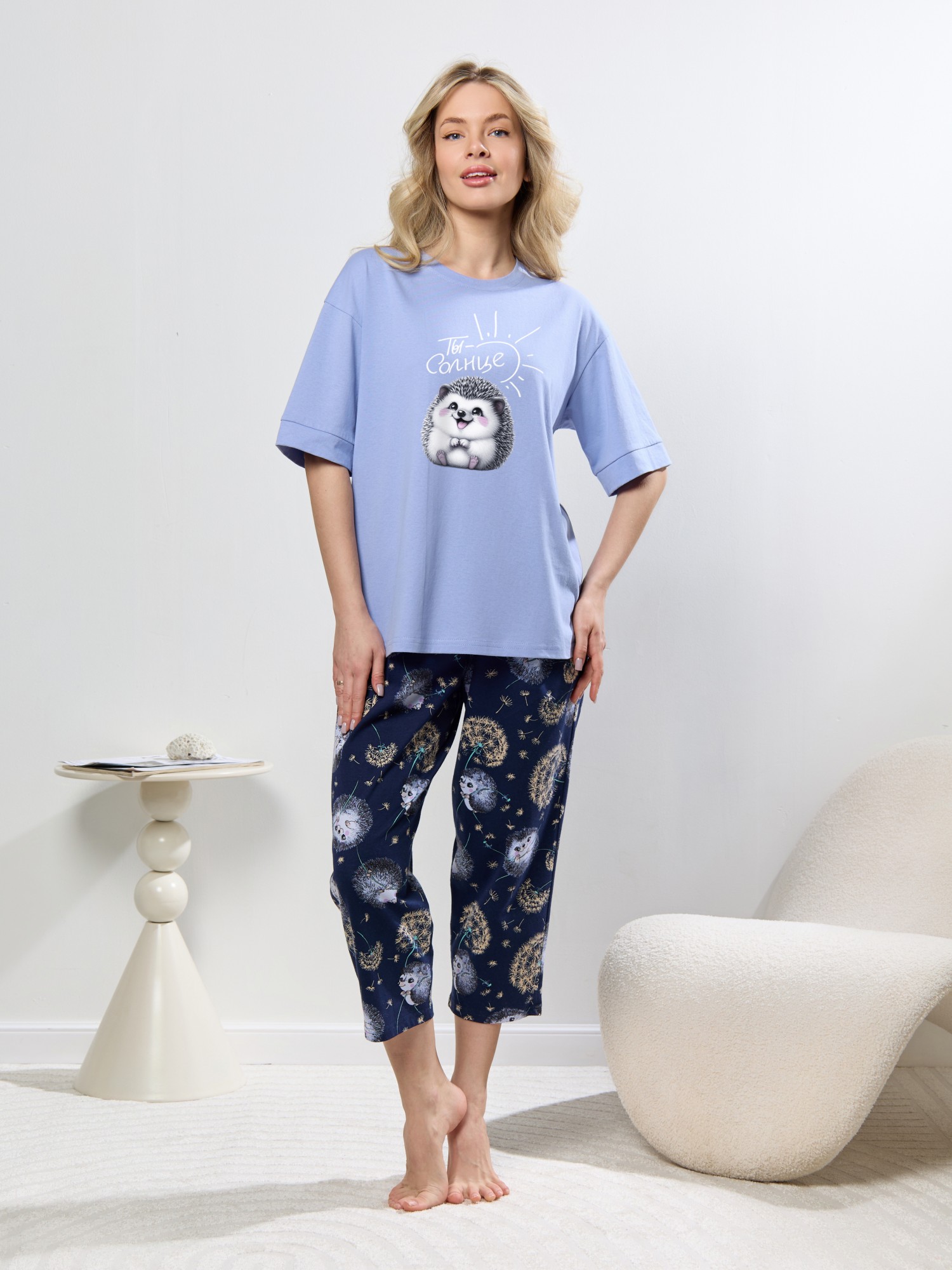 Костюм молодежный из трикотажного полотна «кулирка» в комбинации двух видов: с набивным рисунком и гладкокрашенного в единой цветовой гамме, состоящий из футболки и брюк. Футболка - из гладкокрашенного полотна, классического покроя, с короткими втачными рукавами, горловиной овальной формы и принтом на полочке, выполненным в технике «шелкографии». Горловина обработана притачной бейкой из основного материала, рукава обработаны притачными манжетами.Брюки - из полотна с набивным рисунком, длинные, слегка зауженные книзу, в боковых швах карманы, на притачном поясе с эластичной тесьмой внутри.