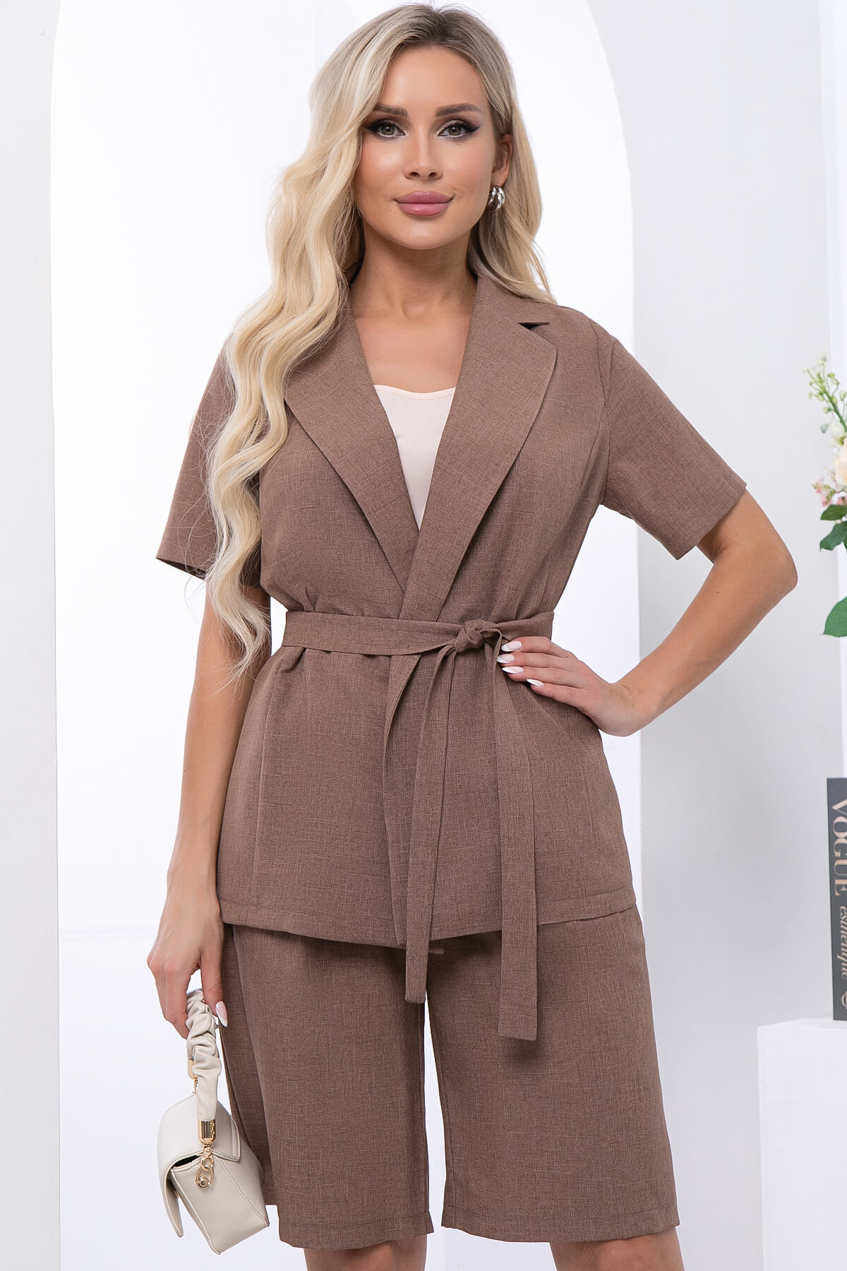 Настало время легких костюмов! На пике популярности в этом сезоне комплект из свободного жакета и прямых шорт. Жакет свободного кроя с поясом из основной ткани, который входит в комплект. Рукав укороченный, втачной. Шорты классические на резинке.