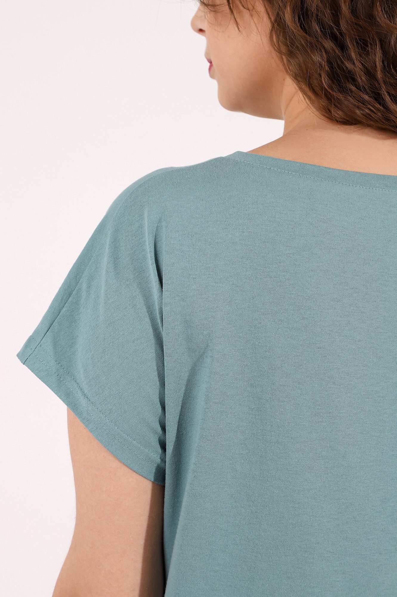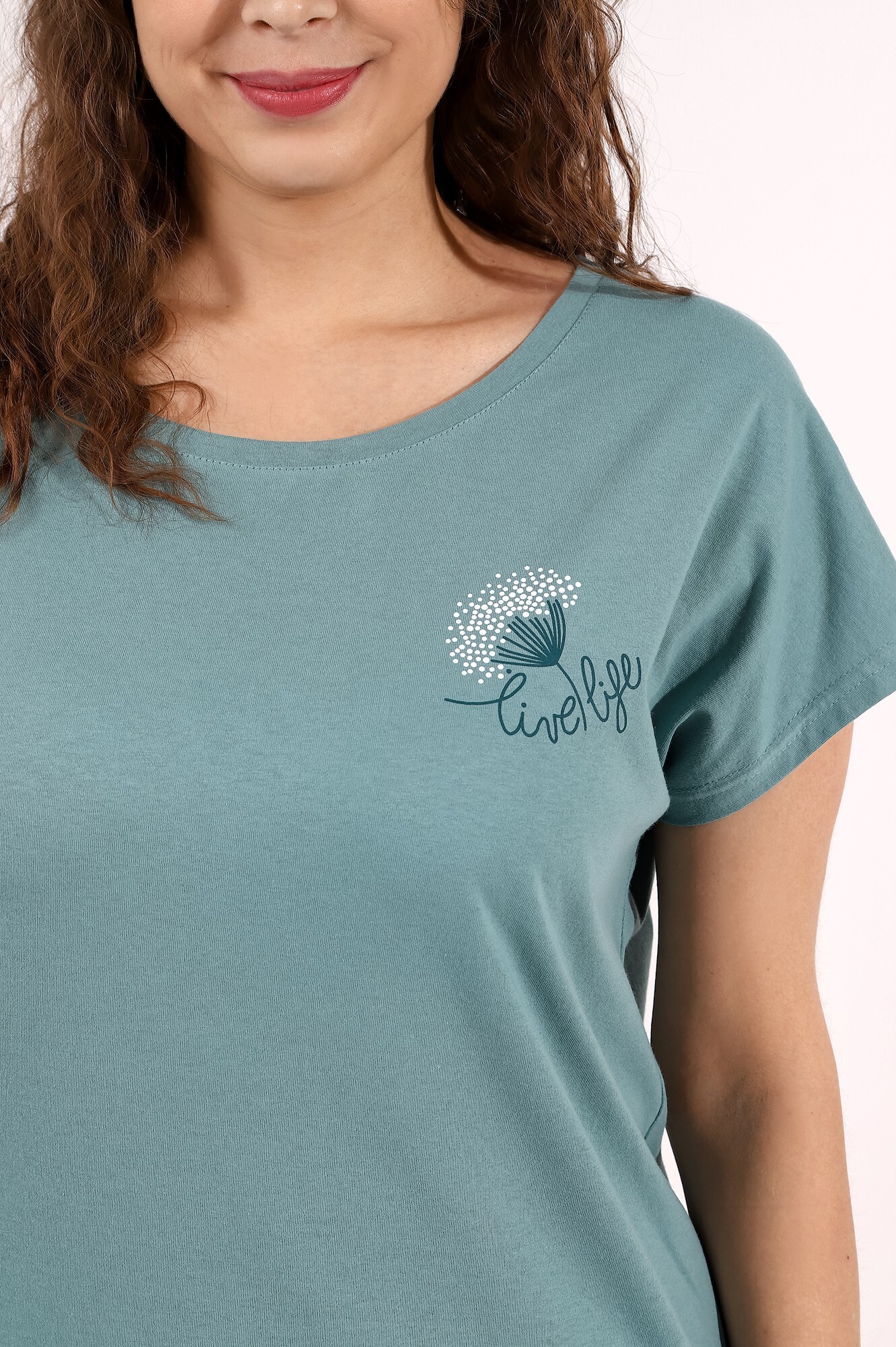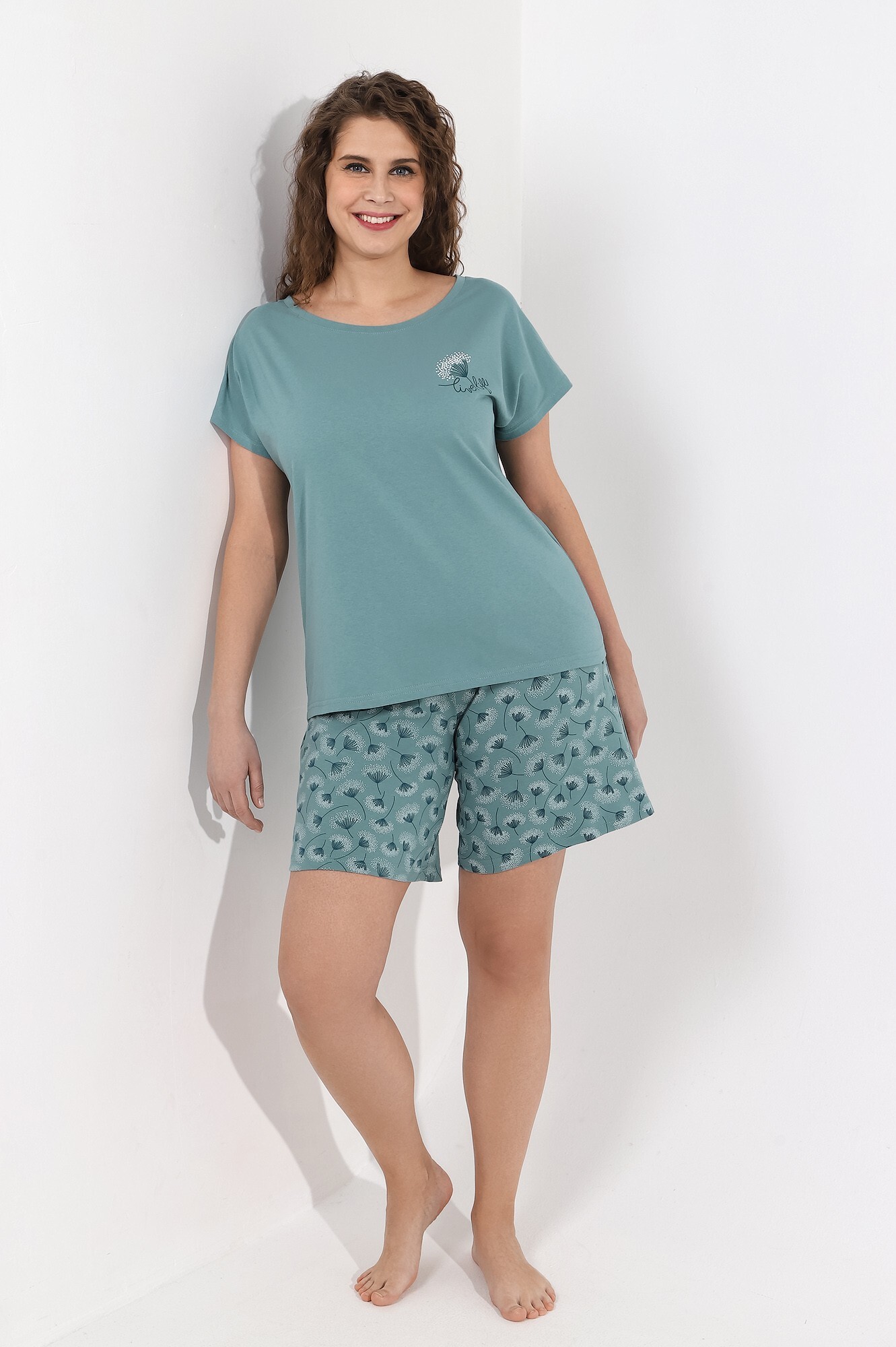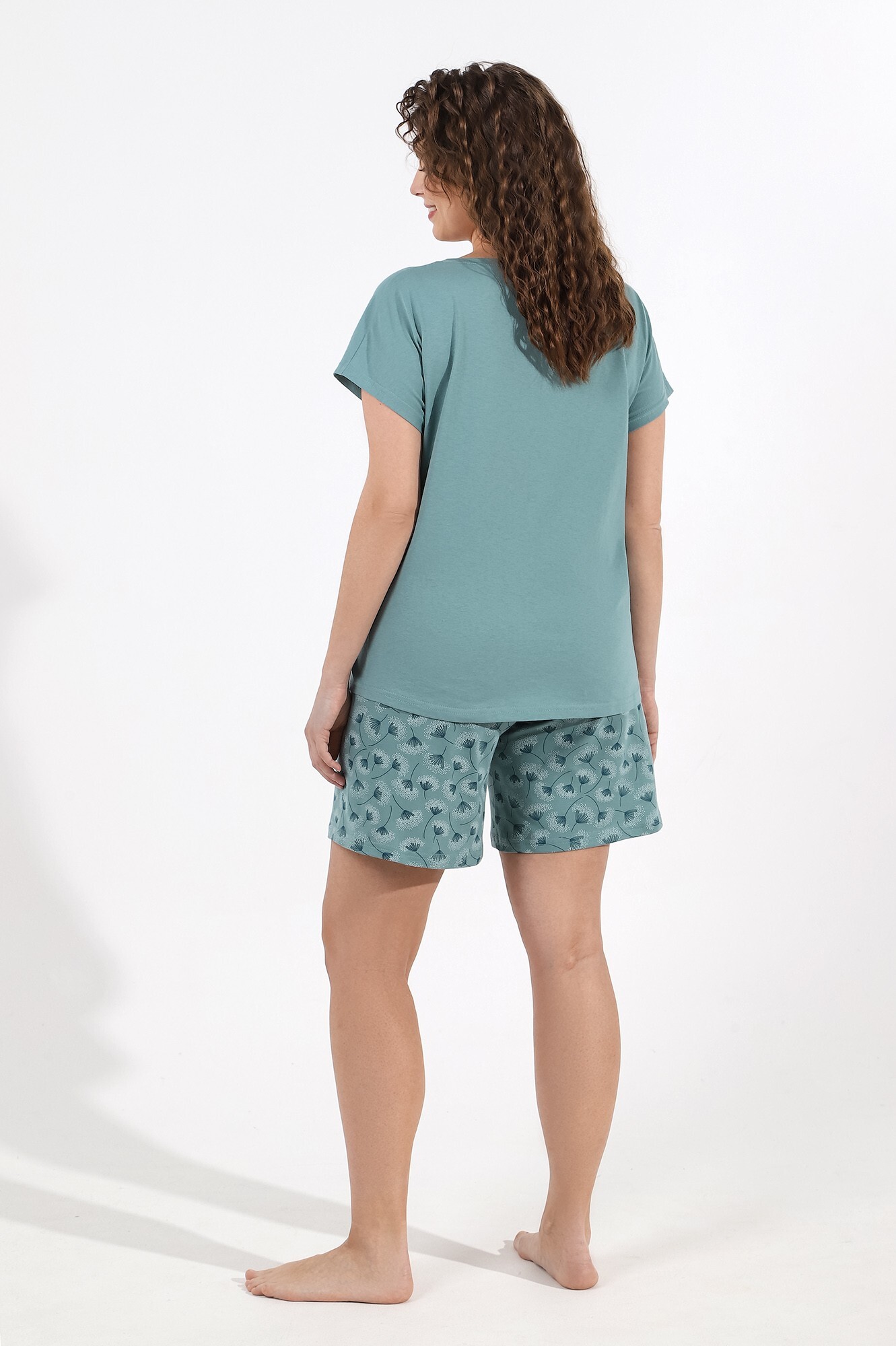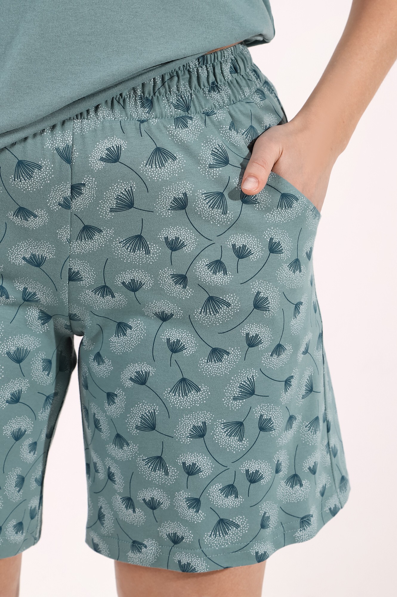 Костюм молодежный из трикотажного полотна «кулирка» в комбинации двух видов: с набивным рисунком и гладкокрашеного в единой цветовой гамме, состоящий из футболки и шорт. Футболка - из гладкокрашеного полотна, классического покроя, с короткими цельнокроеными рукавами, горловиной овальной формы, обработанной притачной бейкой из основного материала и принтом на полочке, выполненным в технике «шелкографии».Шорты – из полотна с набивным рисунком, свободные, средней длины, с карманами в боковых швах, на притачном поясе с эластичной тесьмой внутри.