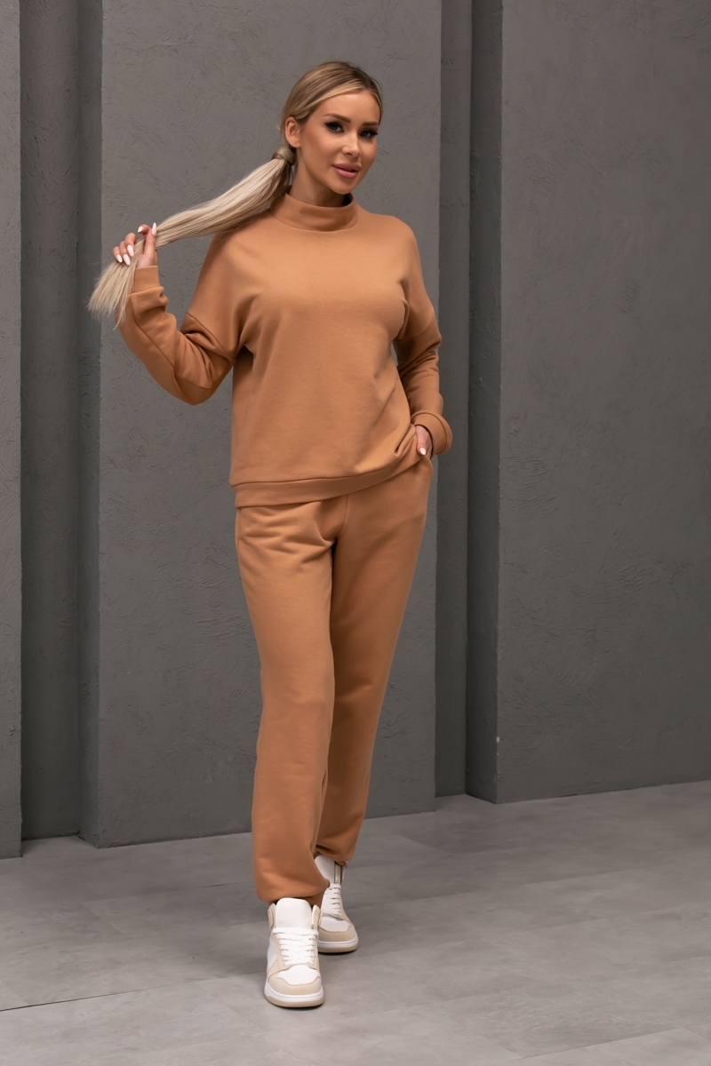 Комфортный костюм выполнен из трикотажного полотна, состоит из брюк и свитшота. Брюки с комфортной посадкой по талии, которую обеспечивает пояс на резинке. По бокам функциональные карманы. Низ на манжете. Свитшот прямого кроя. Втачной рукав со спущенным плечом оканчивается притачной манжетой. Горловина оформлена стойкой. Низ ровный, на манжете. Отличный вариант на каждый день.