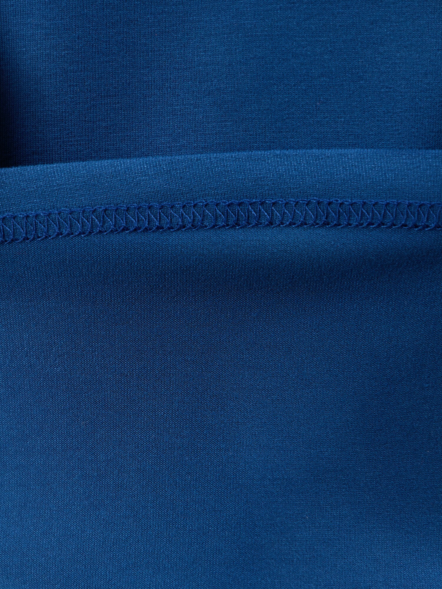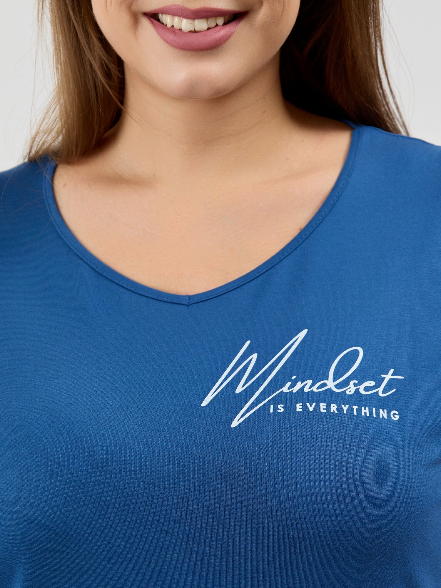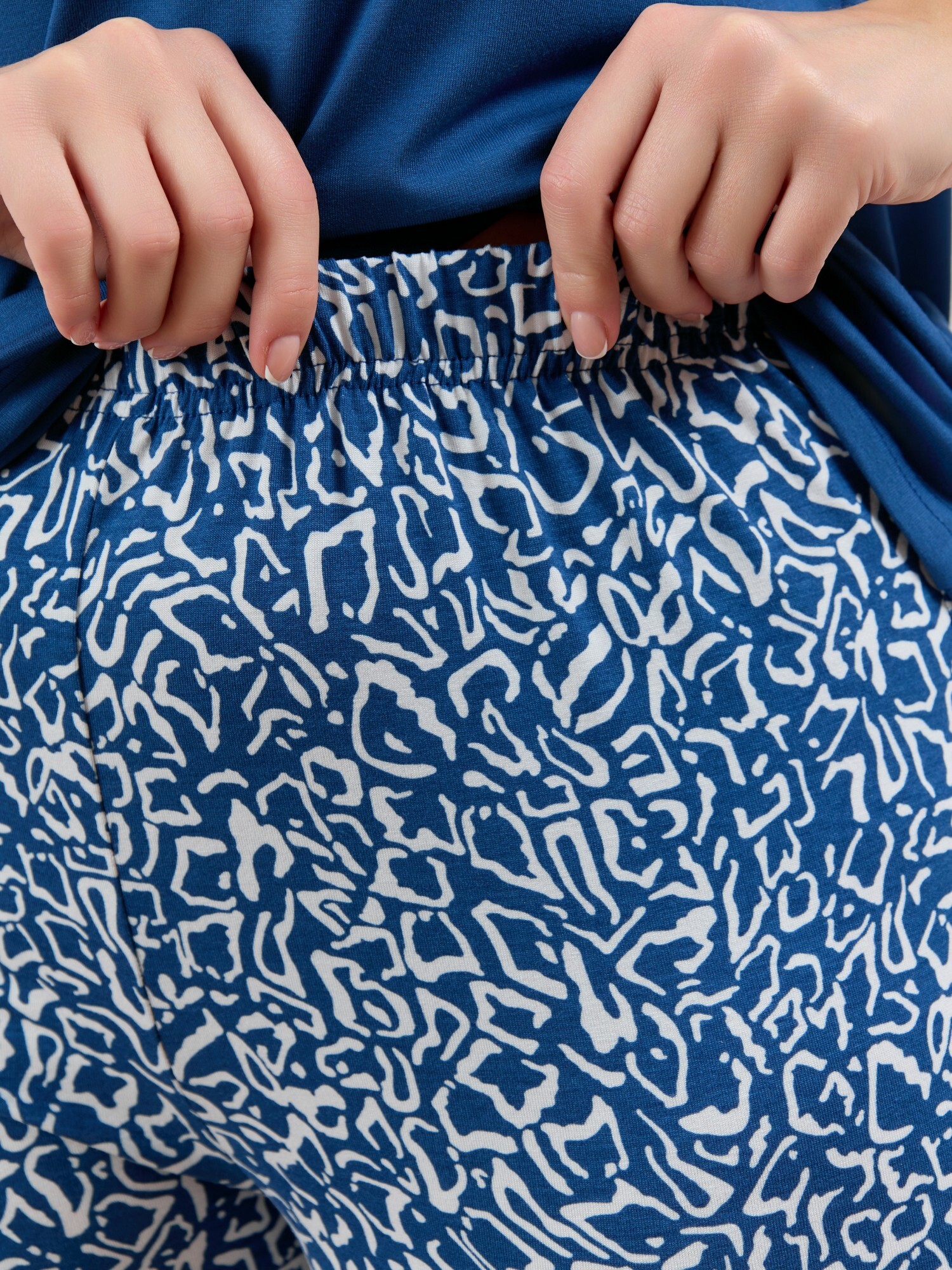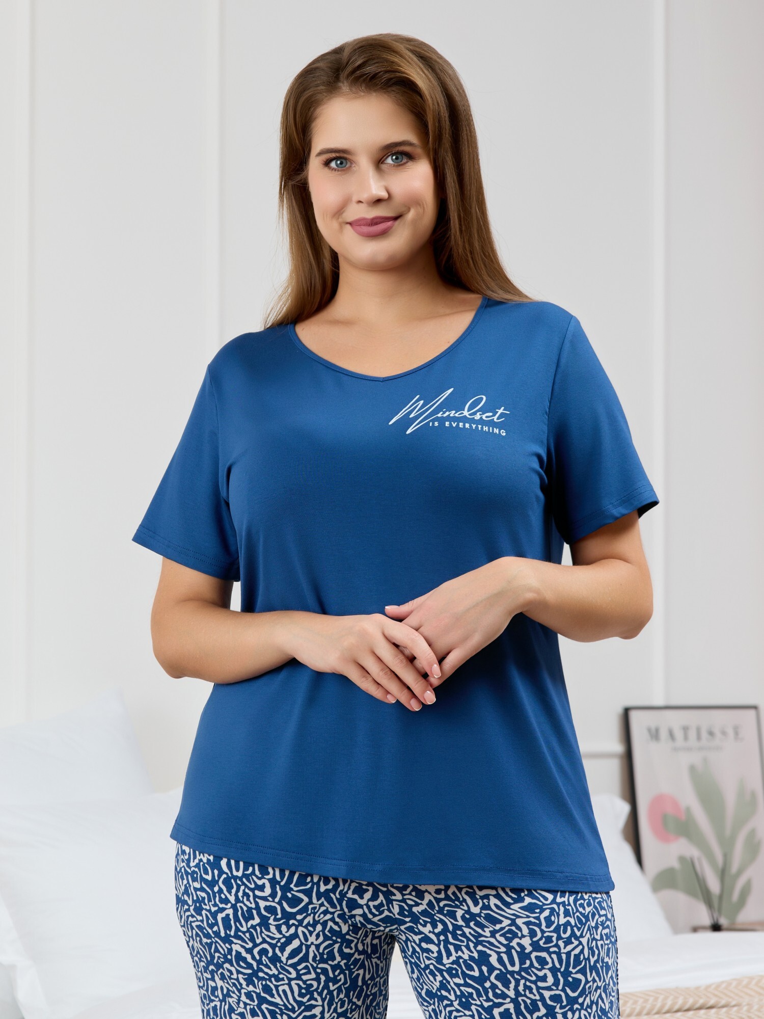 Костюм женский из трикотажного вискозного полотна в комбинации двух видов тканей: гладкокрашеной и с набивным рисунком, состоящий из футболки и брюк. Футболка – из гладкокрашеного полотна с короткими втачными рукавами, V-образной горловиной, окантованной основным материалом и принтом на полочке, выполненным в технике «шелкографии».Брюки — из полотна с набивным рисунком, прилегающего силуэта, с эластичной тесьмой по талии.