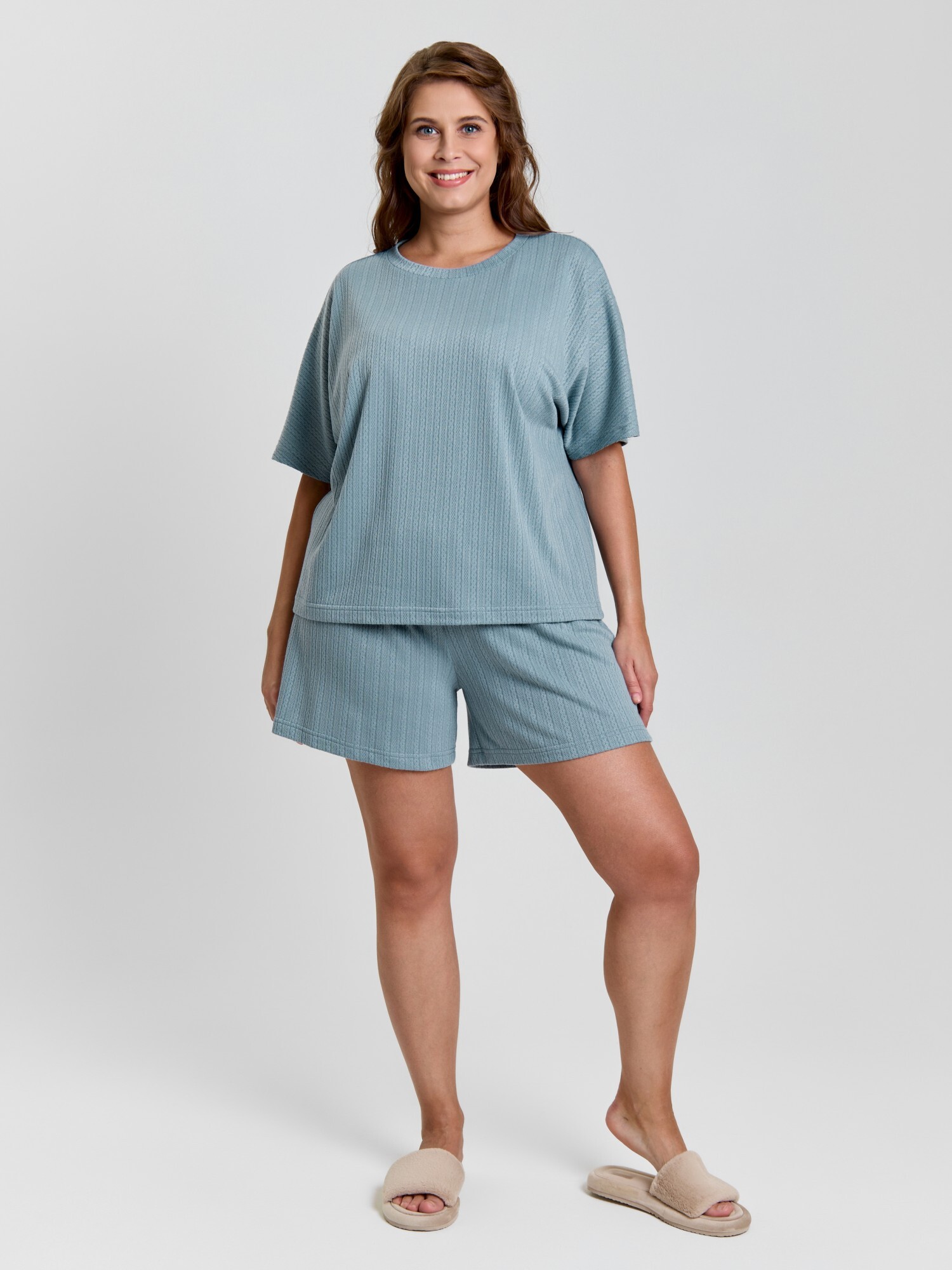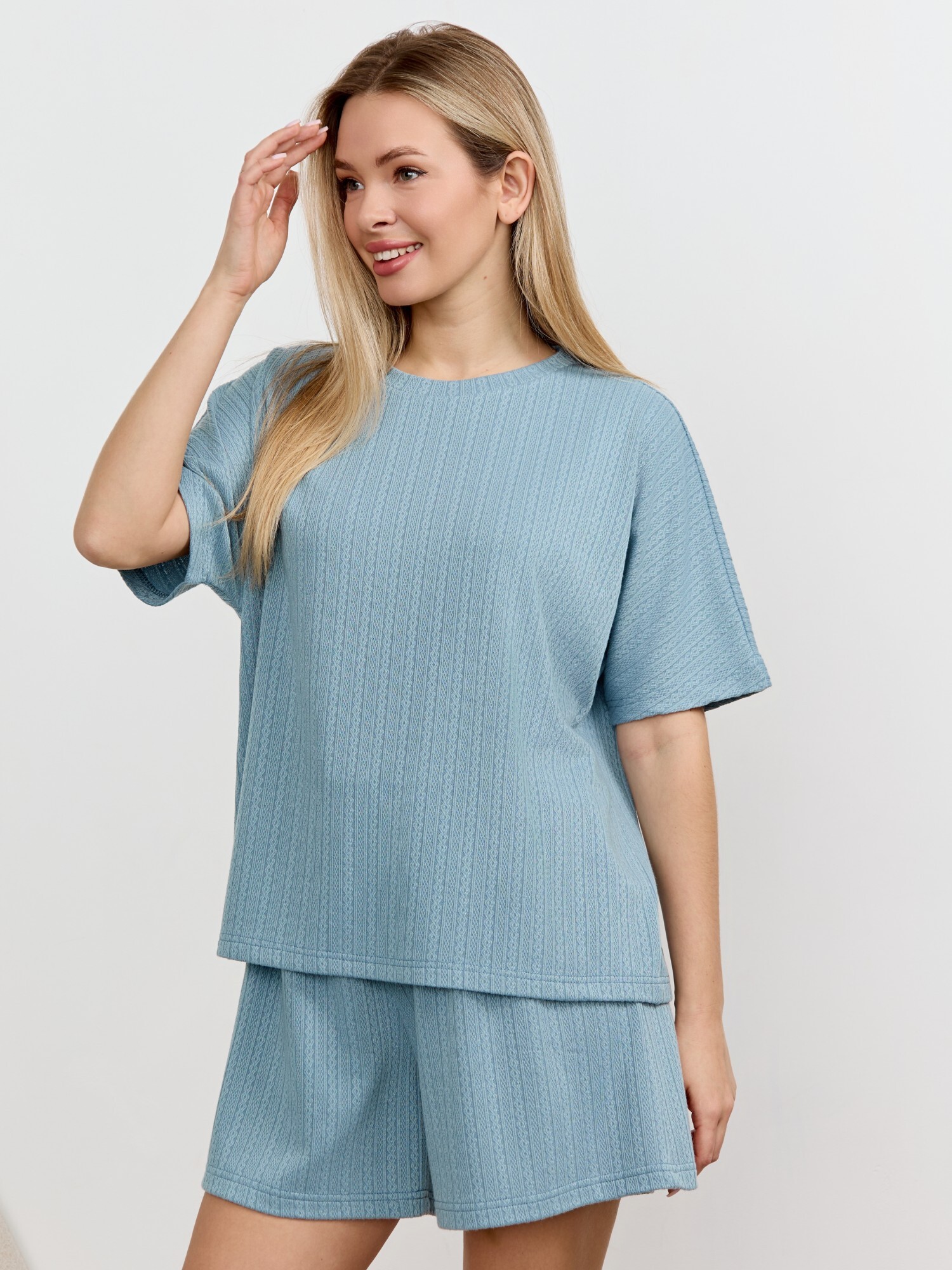 Костюм молодежный из гладкокрашеного фактурного трикотажного полотна, состоящий из футболки и шорт. Футболка – свободного кроя, с цельнокроеными рукавами, горловиной овальной формы, обработанной втачной планкой.Шорты – средней длины, свободные, с эластичной тесьмой по талии и шнурком, продетым в две обметанные петли.