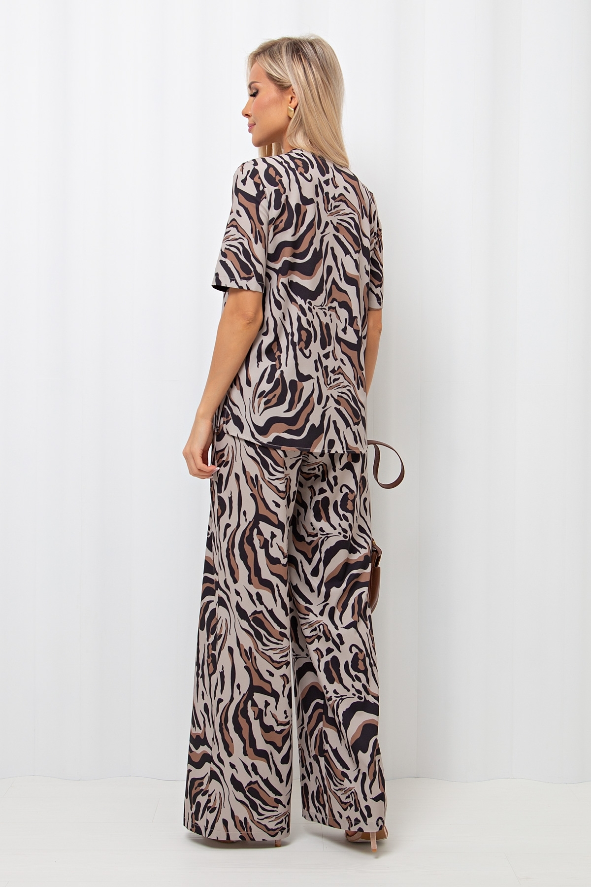 Легкий костюм свободного кроя. Рубашка прямого кроя с коротким втачным рукавом. V - образная горловина, переходящая в планку с застежкой на петли и пуговицы. Низ прямой, по бокам разрезы. Брюки с комфортной посадкой на талии, которую обеспечивает притачной пояс на резинке.