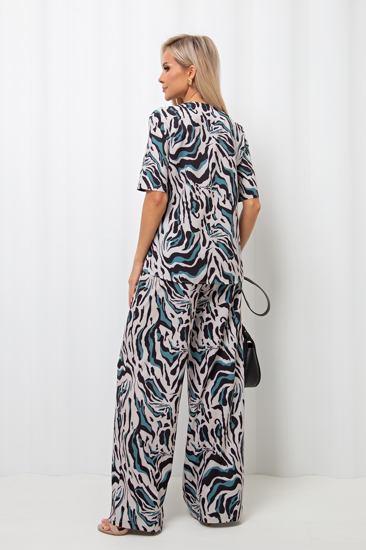 Легкий костюм свободного кроя. Рубашка прямого кроя с коротким втачным рукавом. V - образная горловина, переходящая в планку с застежкой на петли и пуговицы. Низ прямой, по бокам разрезы. Брюки с комфортной посадкой на талии, которую обеспечивает притачной пояс на резинке.