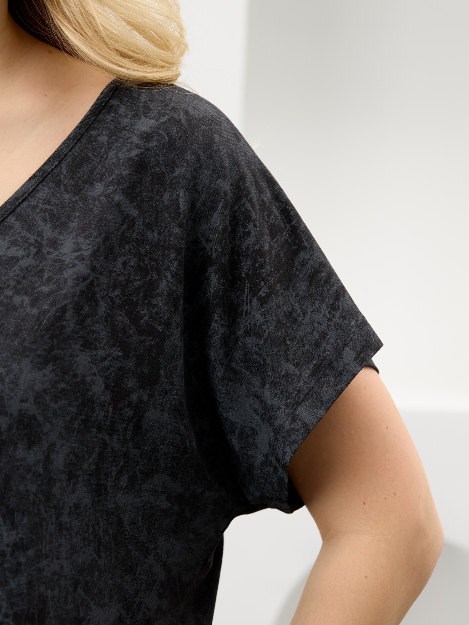 Костюм женский в комбинации двух видов полотен: из гладкокрашенного трикотажного вискозного полотна с эффектом «варенка», состоящий из футболки и брюк. Футболка - свободного покроя, с короткими цельнокроеными рукавами, горловиной V-образной формы, окантованной основным материалом и разрезами в боковых швах. Модной деталью является разница длин между полочкой и спинкой.Брюки – длинные, свободные, на притачном поясе с эластичной тесьмой внутри.