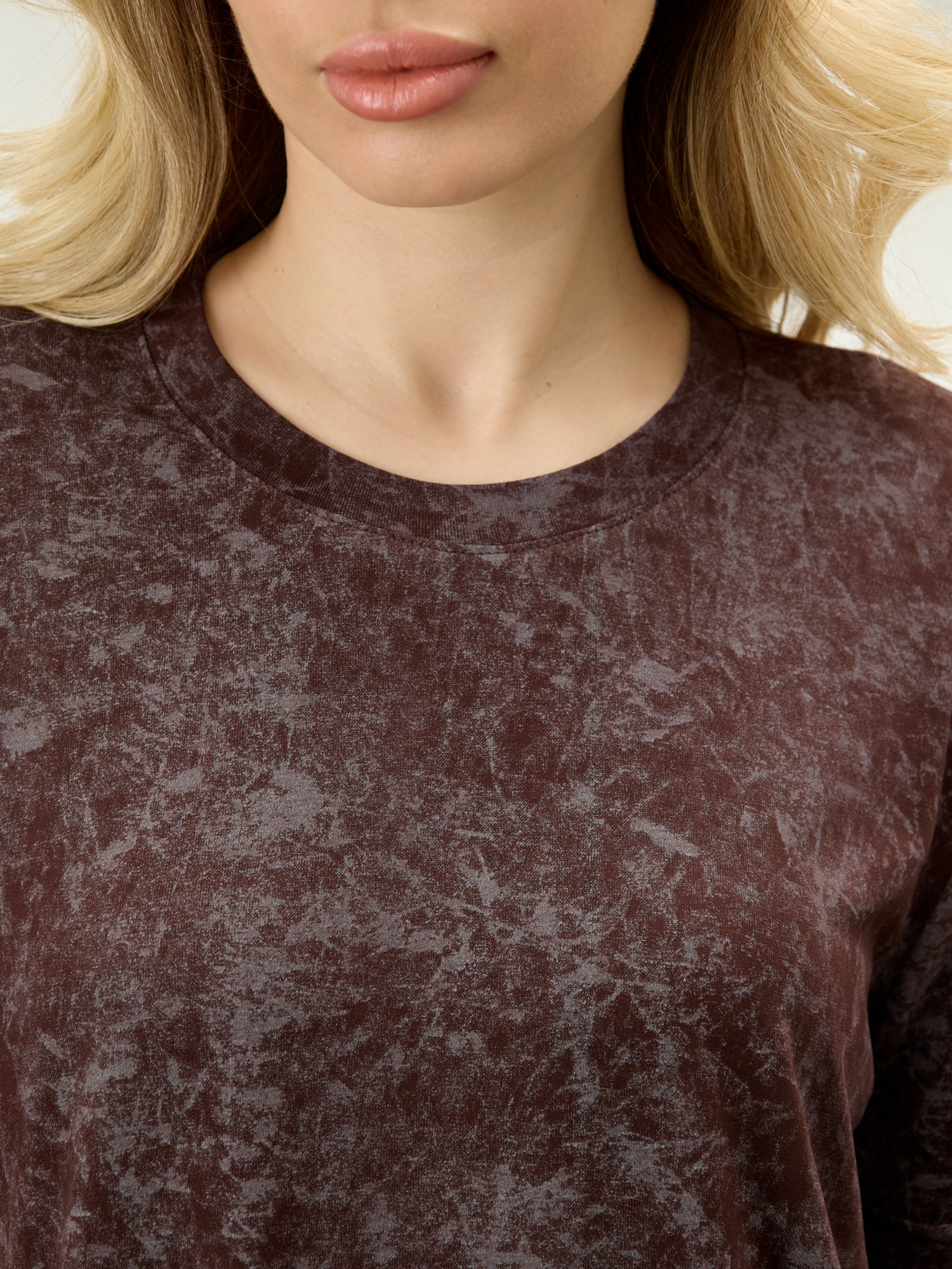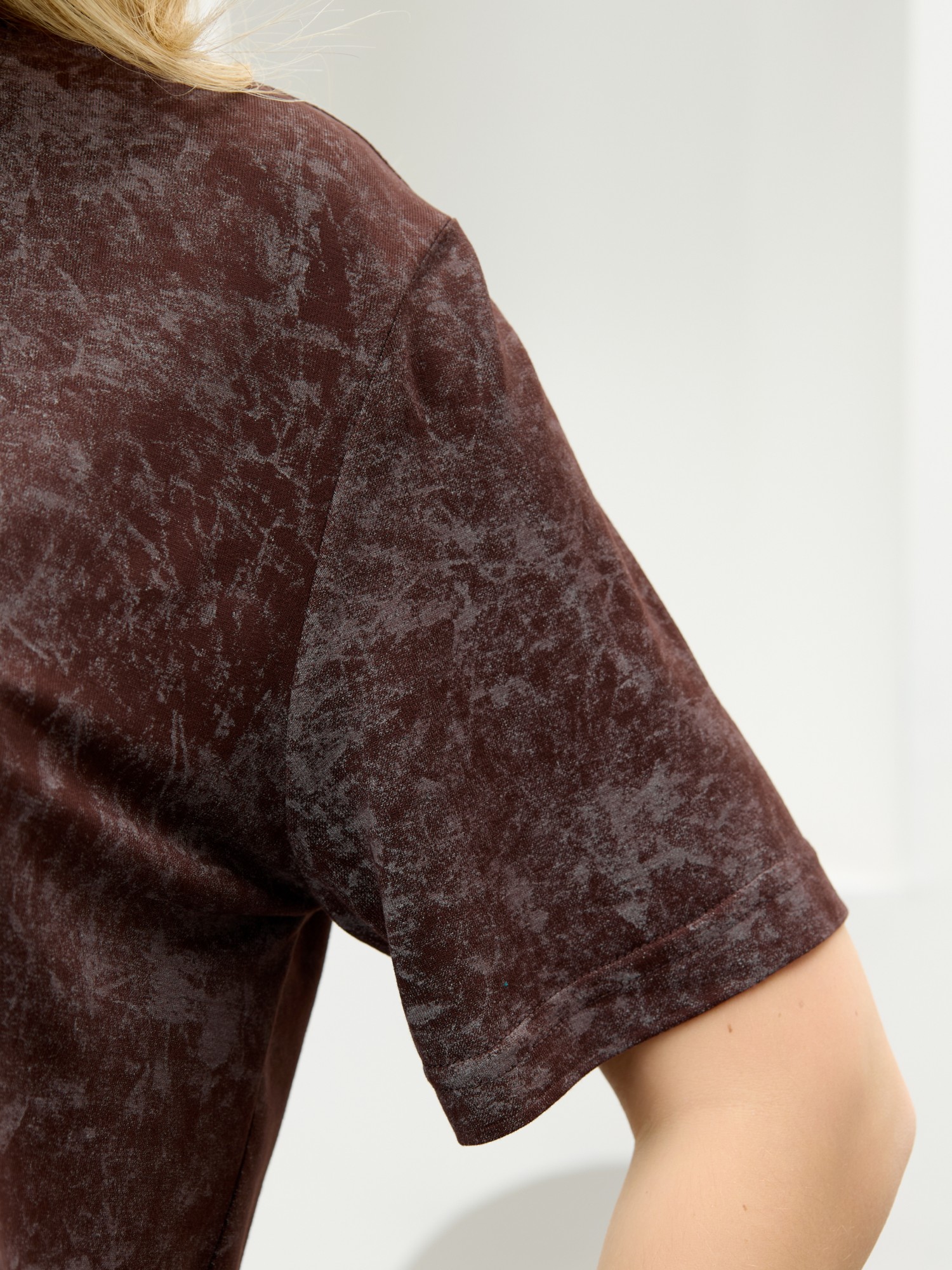 Костюм женский в комбинации двух видов полотен: из гладкокрашенного трикотажного вискозного полотна с эффектом «варенка», состоящий из футболки и шорт. Футболка - классического покроя, с короткими втачными рукавами, горловиной овальной формы, обработанной втачной планкой.Шорты – свободные, средней длины, с эластичной тесьмой по талии.