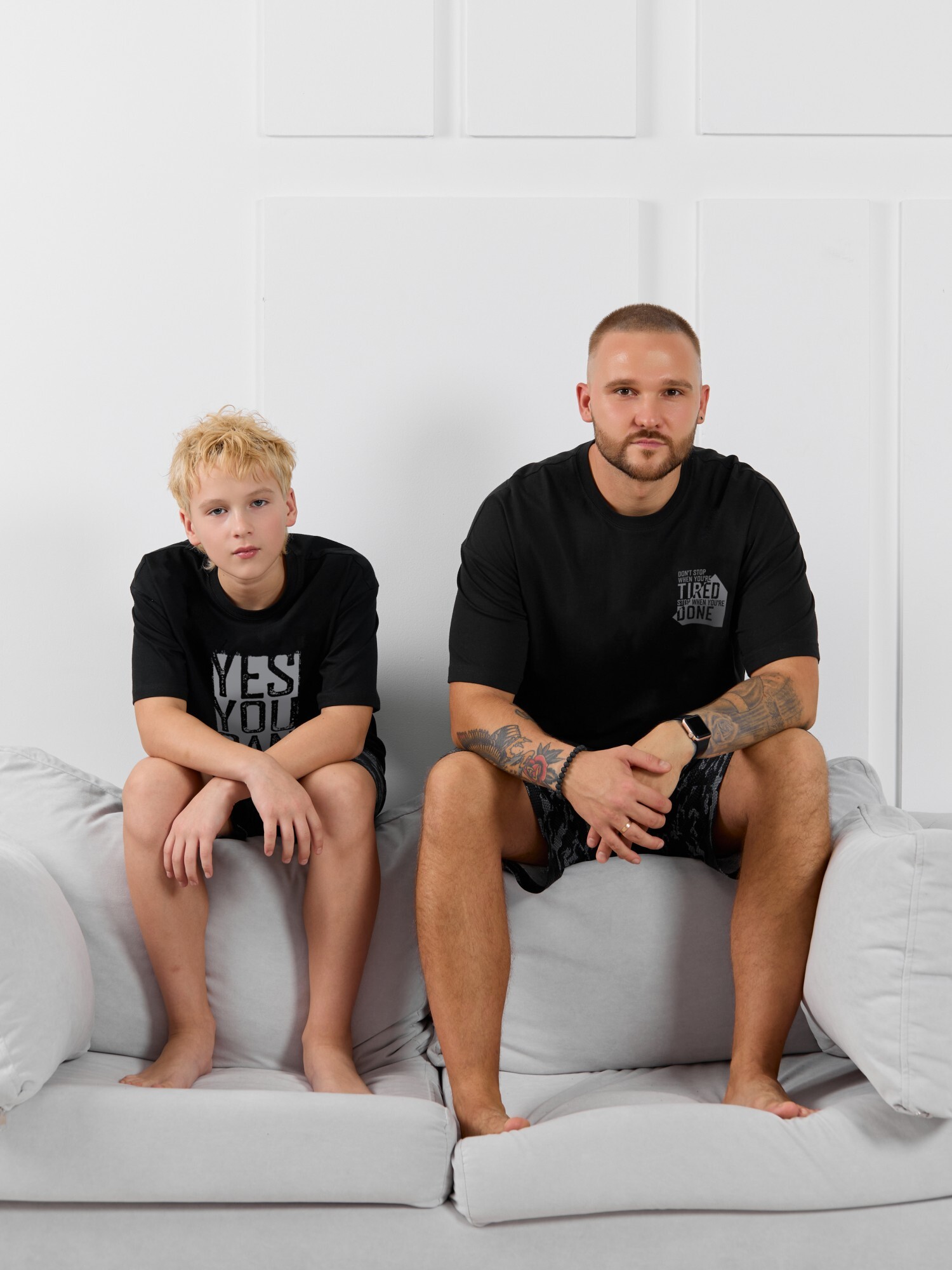 Костюм мужской, состоящий из футболки и шорт. Футболка однотонная с принтом на груди; модель свободная, со спущенной линией плеч. Шорты из полотна с набивным рисунком эксклюзивного дизайна, с боковыми карманами с обтачными входами, на притачном поясе с отстроченной эластичной тесьмой.