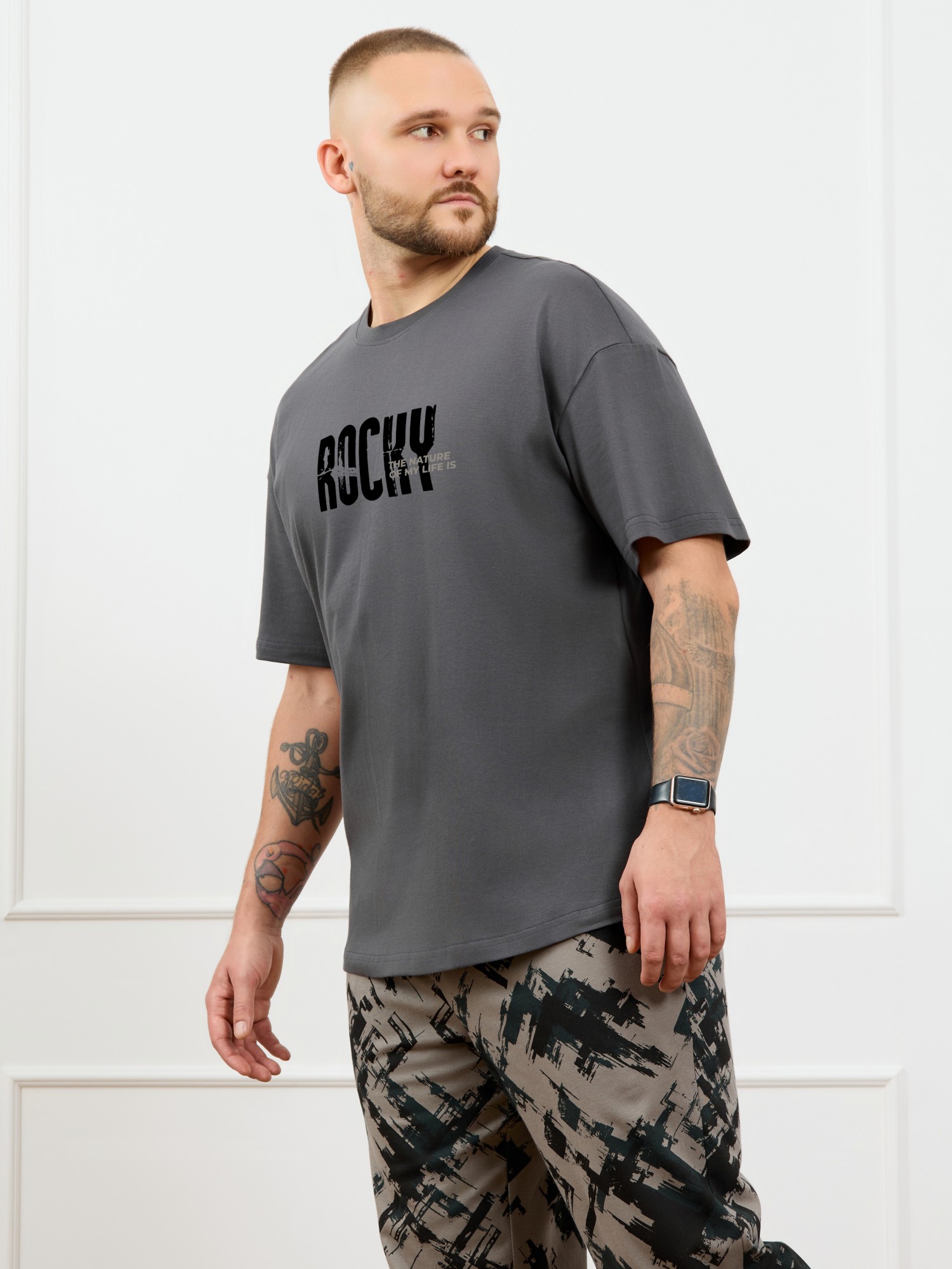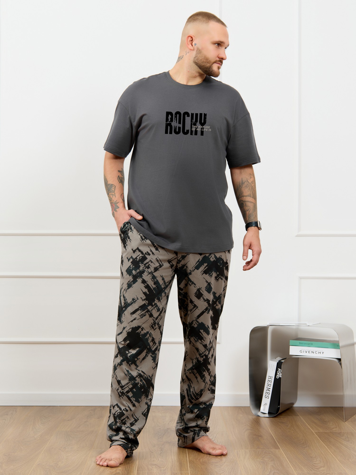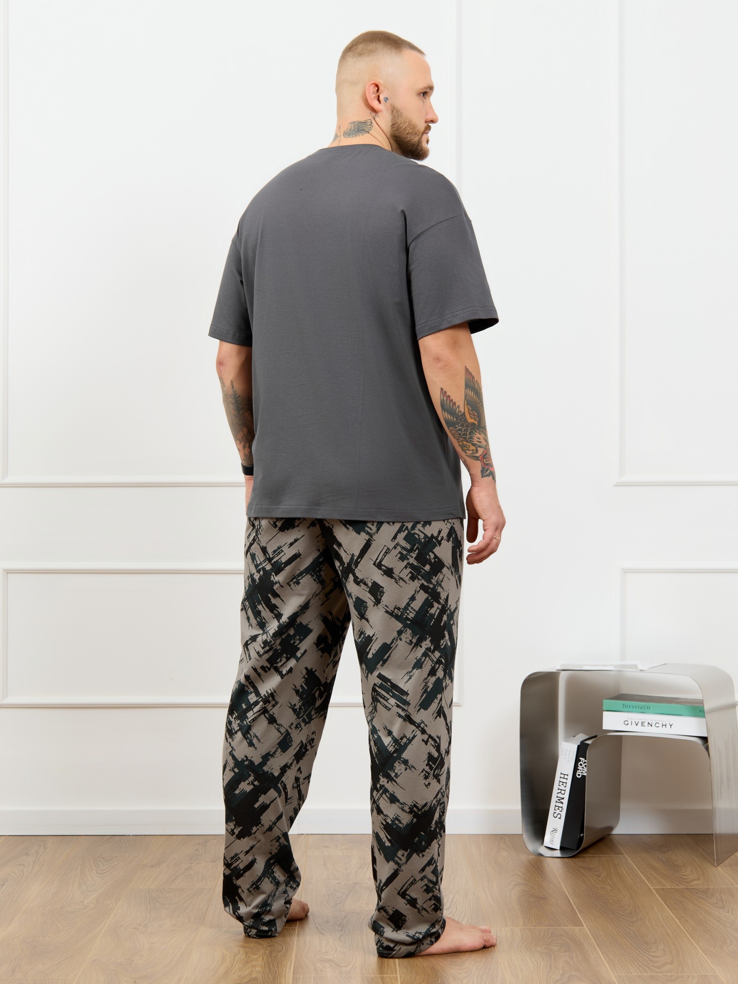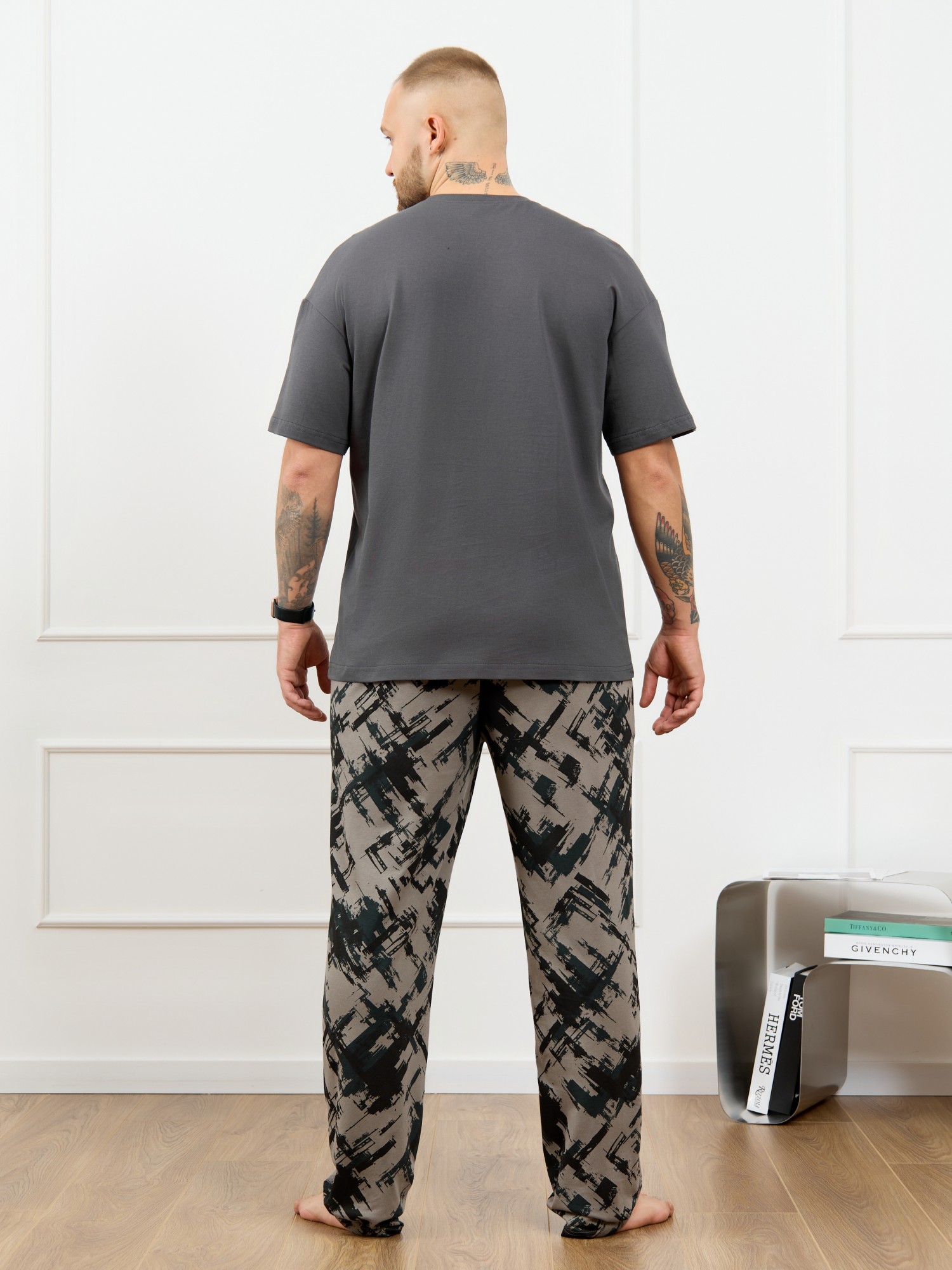 Костюм мужской, состоящий из футболки и брюк. Футболка однотонная с принтом на груди; модель свободная, со спущенной линией плеч, овальным вырезом горловины. Брюки из полотна с набивным рисунком эксклюзивного дизайна, прямые, с боковыми карманами с обтачными входами, на притачном поясе с отстроченной эластичной тесьмой.