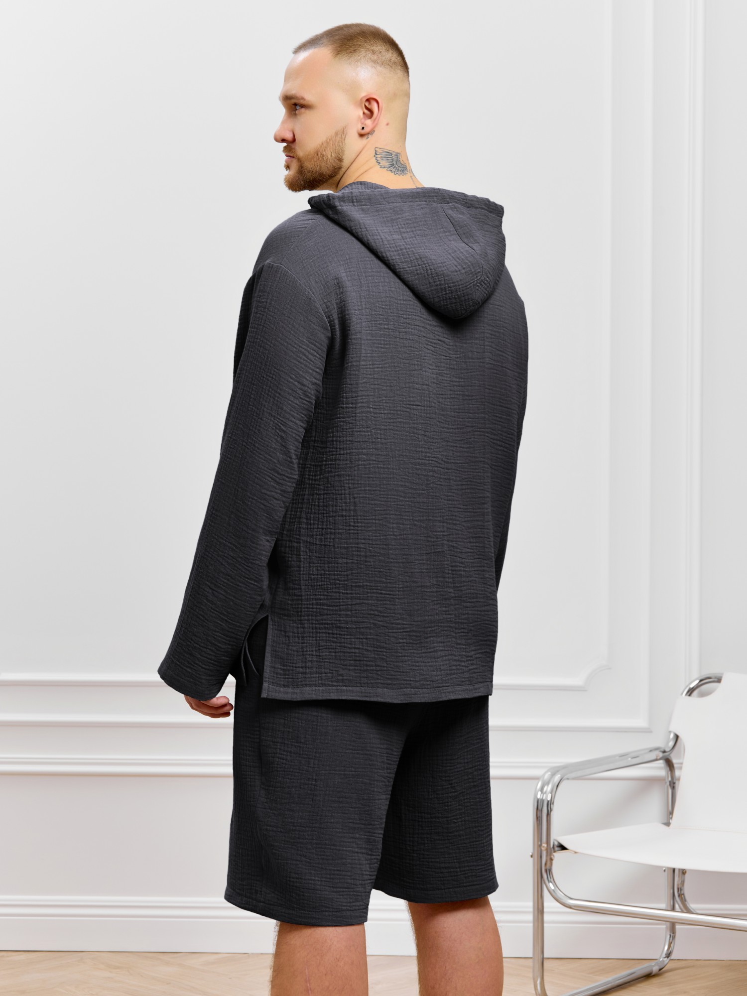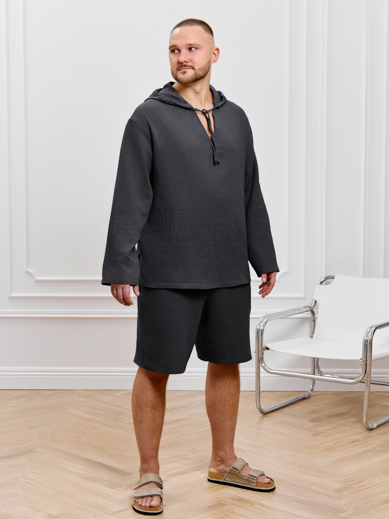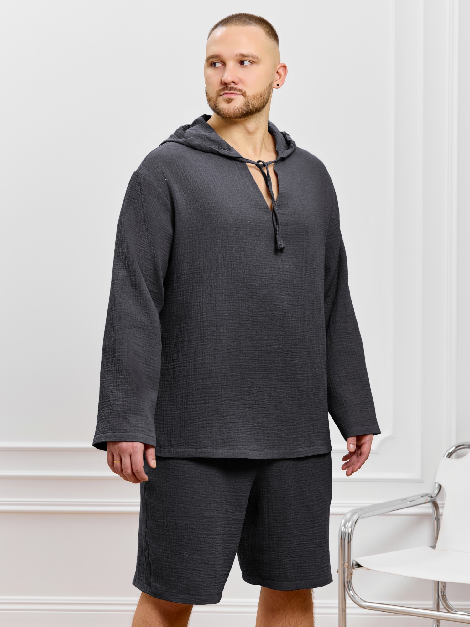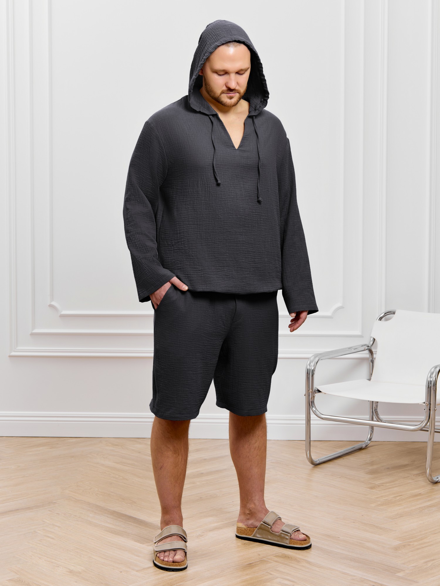 Костюм мужской из фактурного гладкокрашеного полотна, состоящий их джемпера и брюк. Джемпер - с капюшоном, длинными втачными рукавами и V-образным вырезом горловины спереди. В шве подгибки переднего края капюшона вставлен шнурок из основного материала. Нижние срезы рукавов и низ изделия обработаны подгибкой. Шорты - классическогь покроя, на притачном поясе с эластичной тесьмой внутри, с карманами в боковых швах. Нижние срезы обработаны подгибкой.