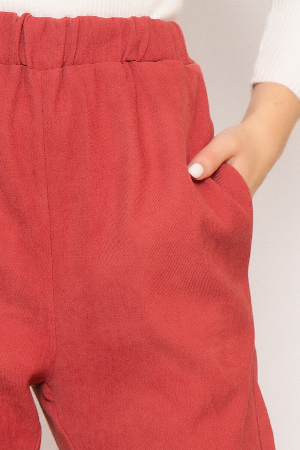 Костюм из вельвета - настоящий маст-хэв осенне-зимнего сезона! Для сохранения тепла в прохладную погоду, наденьте под рубашку топ или футболку. Стильно смотрится с туфлями на высоком каблуке, для более расслабленного образа - подойдут кроссовки или лоферы. Брюки на резинке, в боковых швах расположены удобные карманы, низ так же собран на резинку. Рубашка свободного кроя с отложным воротничком, на кнопках, на груди функциональные карманы с клапаном. Низ рубашки закруглен, спинка удлинена. Рукав длинный, втачной, манжет застёгивается на кнопку.