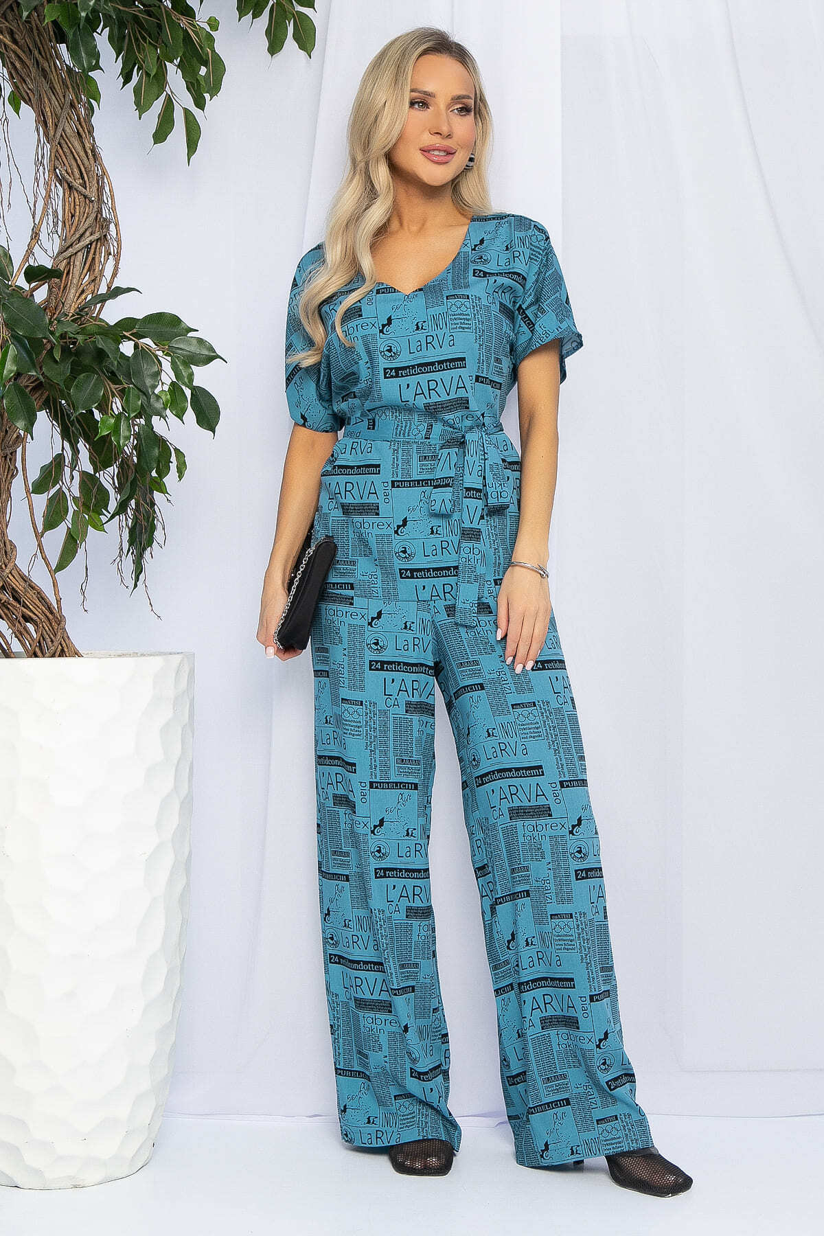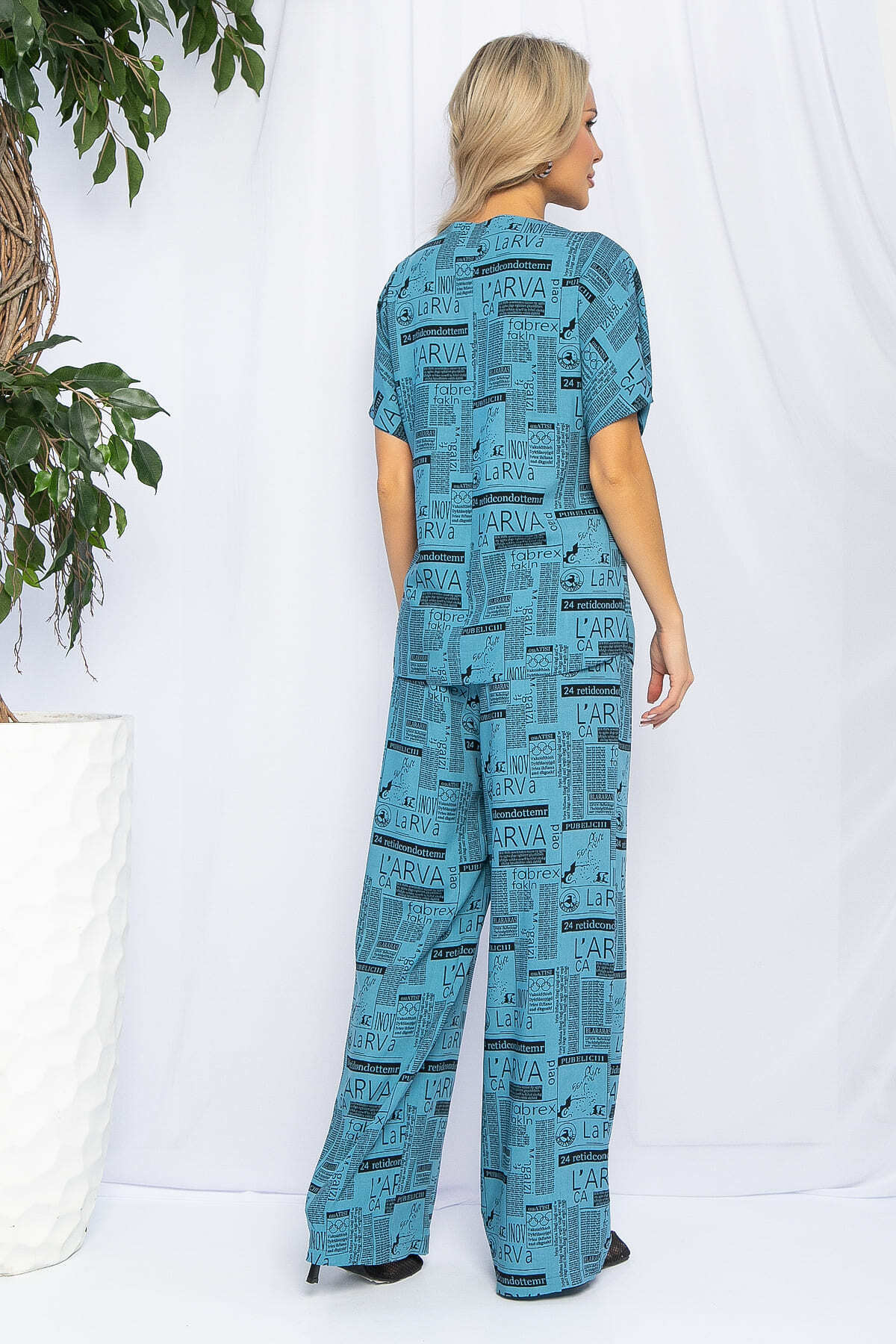 Легкий и очень приятный к телу брючный костюм из струящегося хлопка в модных цветовых оттенках этого сезона с необычным модным принтом. Натуральный состав ткани особенно важен в летнее время. Блуза свободного кроя с коротким рукавом-кимоно и разрезами по бокам. Свободные брюки в стиле палаццо придают костюму легкость и особый шик. Брюки имеют пояс на комфортной резинке, что позволяет чувствовать себя свободно и не сомневаться при выборе размера. Костюм имеет съемный пояс в комплекте. Свободный силуэт костюма подходит абсолютно для любой фигуры. Костюм актуален для любого мероприятия, романтических встреч и летних прогулок.