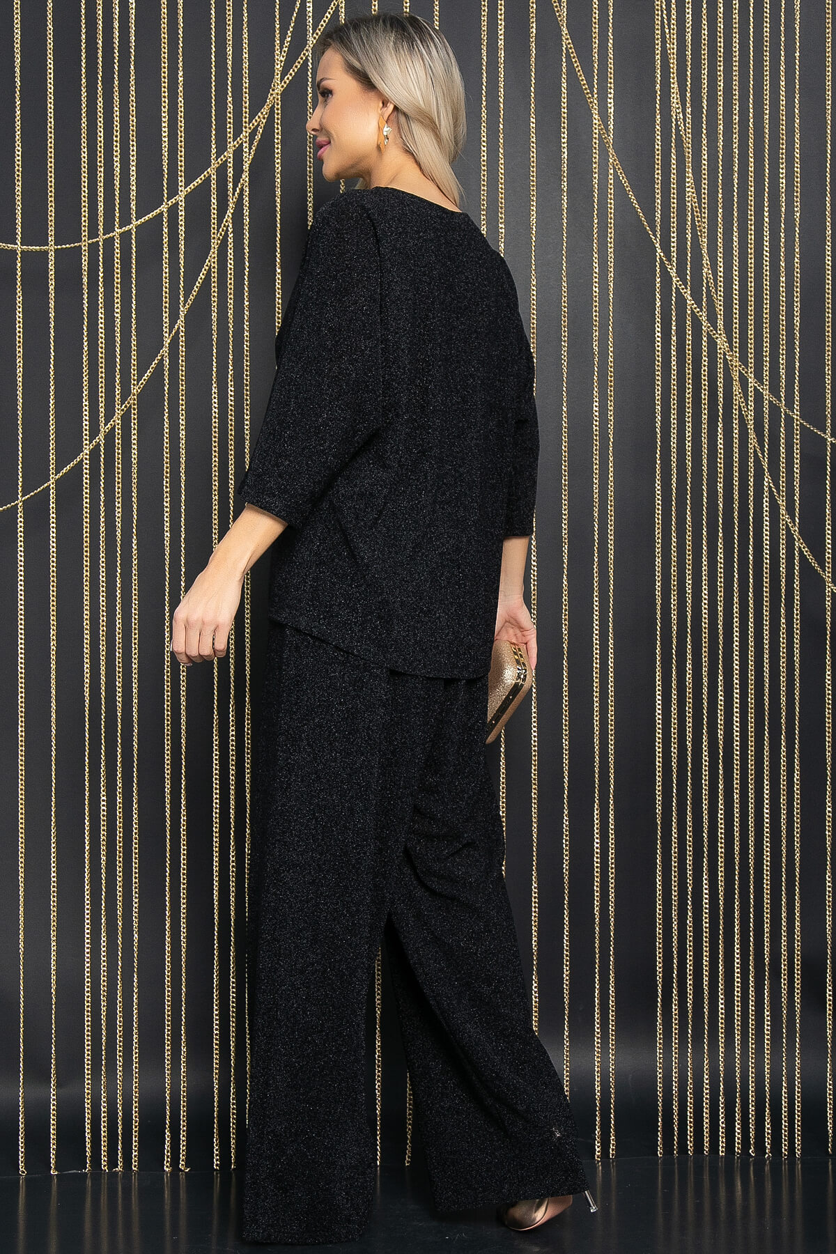 Женственный костюм-двойка из трикотажа с люрексом, состоящий из брюк на резинке и блузы свободного кроя, прекрасно подойдёт для любого праздника. Свободный крой блузы, с округлым вырезом горловины и цельнокроеным рукавом три четверти, даёт ощущение комфорта и изысканности. Брюки имеют удобный крой и отлично сидят на фигуре, делая образ элегантным. Пояс из основной ткани подчеркнёт вашу талию.
