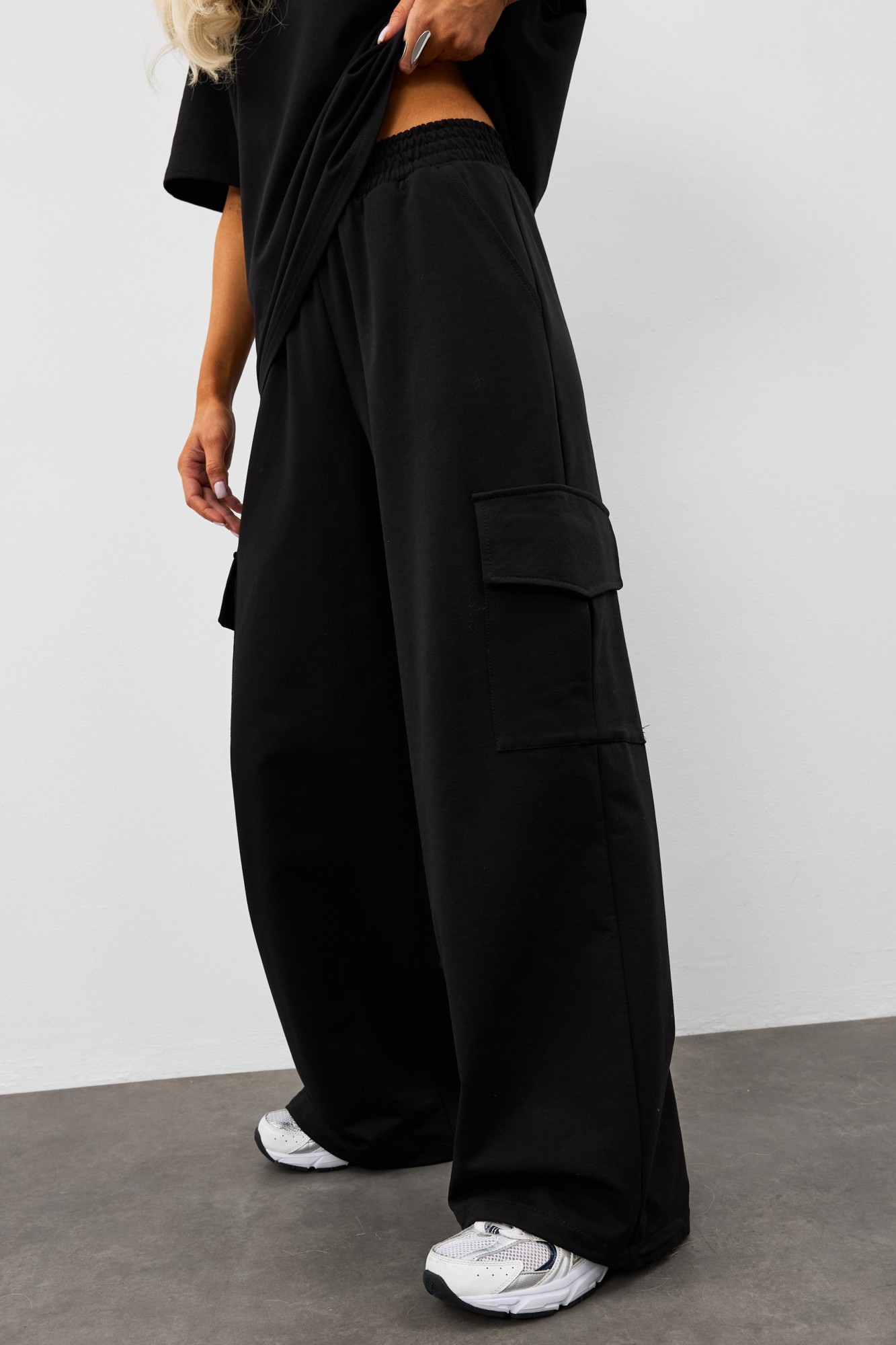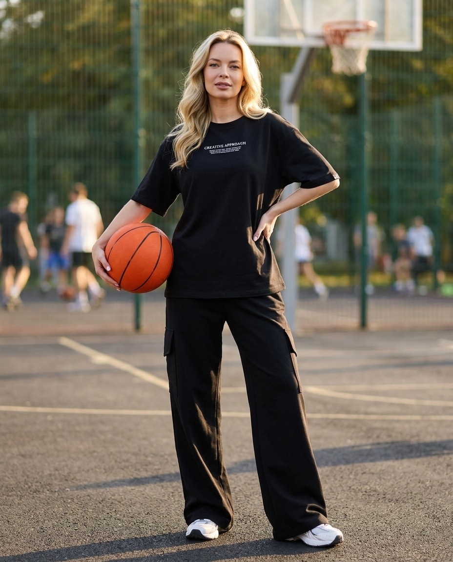 Костюм молодежный из трикотажного полотна «футер - двунитка», состоящий из футболки и брюк. Футболка - с короткими втачными рукавами, горловиной овальной формы, обработанной втачной планкой и принтом на полочке, выполненным в технике «шелкографии». Брюки-карго – длинные, свободные, на притачном поясе с эластичной тесьмой внутри, карманами в боковых швах. Дополнительные накладные карманы со складкой, закрывающиеся клапаном, располагаются по бокам в области бедер. Низ брюк обработан подгибкой с вложением эластичной тесьмы и регулируется по длине с помощью фиксатора.