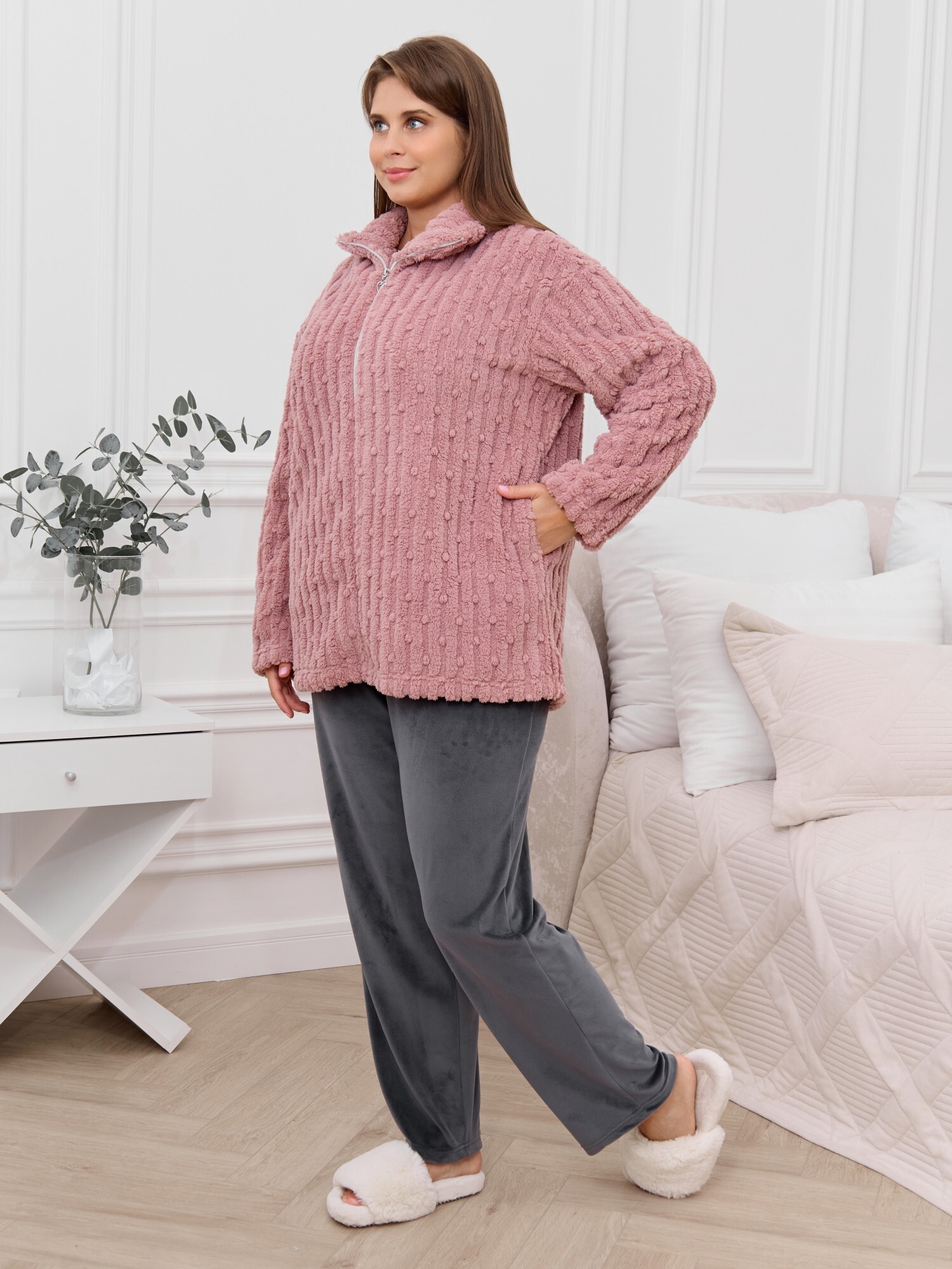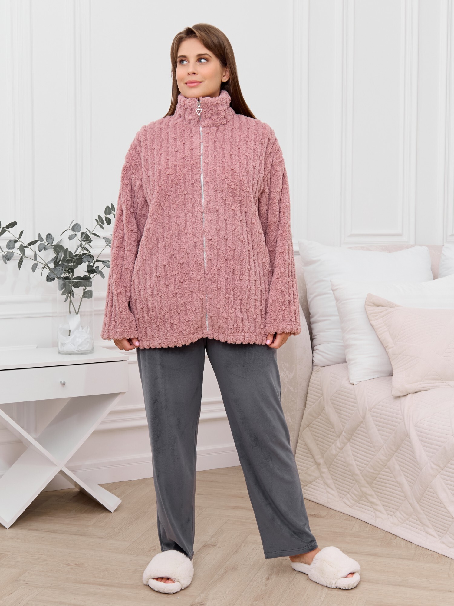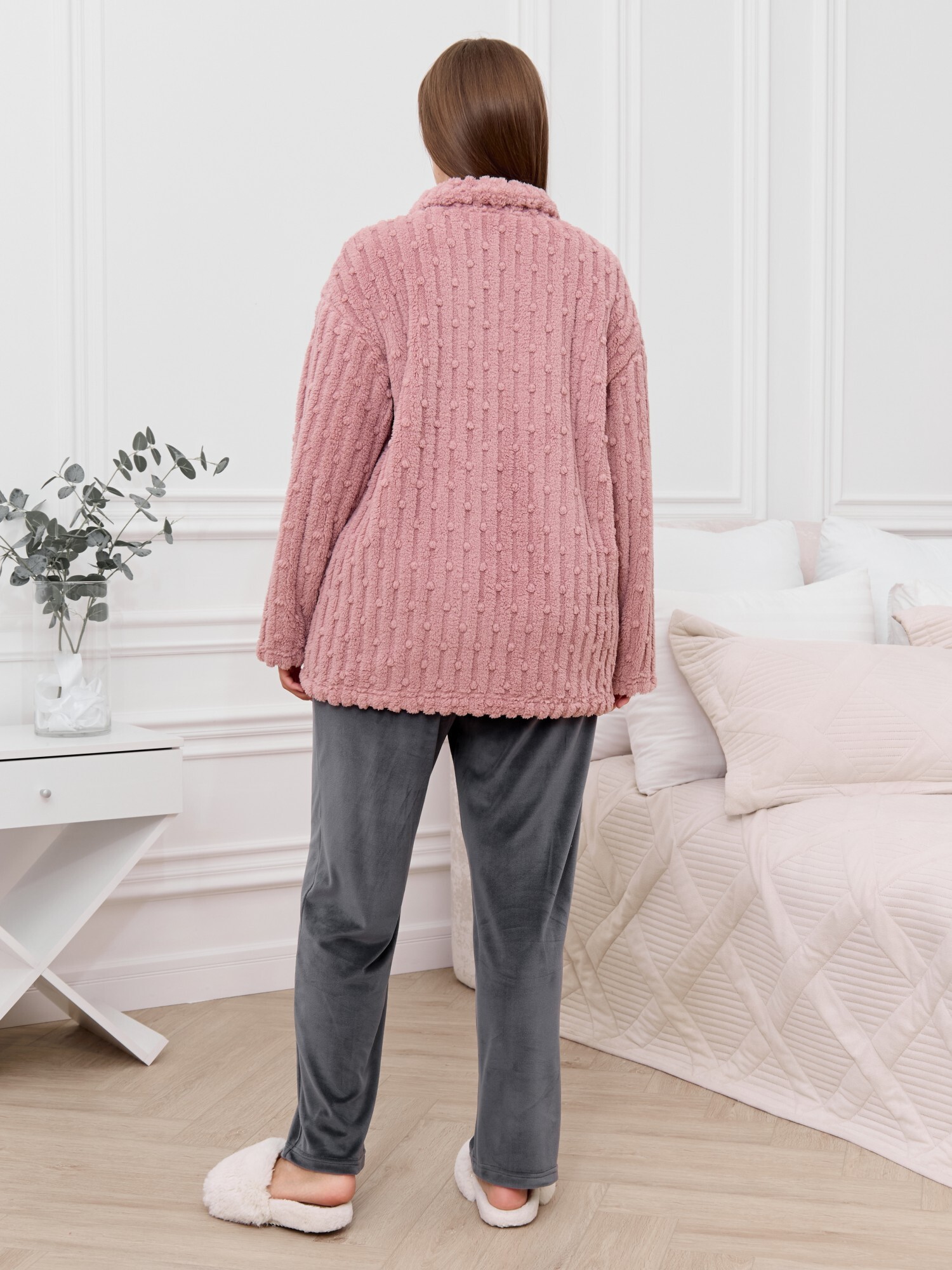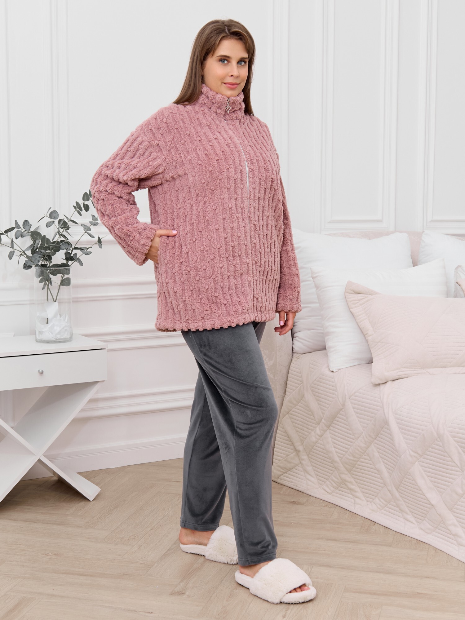 Костюм женский из двух видов текстильных материалов: тканого полотна «велсофт» и трикотажного полотна «вельмонд», состоящий из куртки и брюк.Куртка – из гладкокрашенного трикотажного полотна «велсофт» со стриженым рисунком, с длинными втачными рукавами, воротником «стойка», карманами в боковых швах, центральной бортовой застежкой на