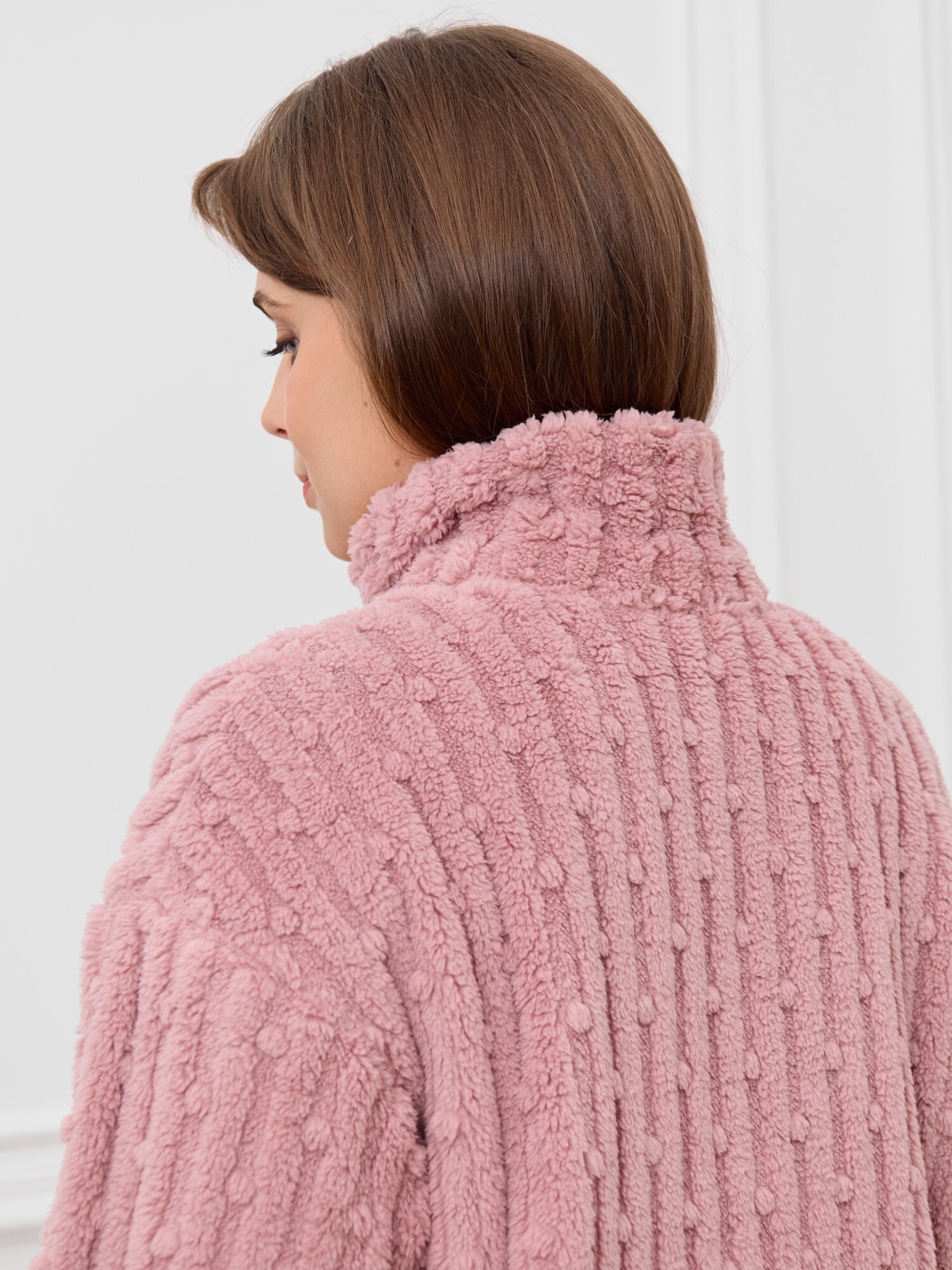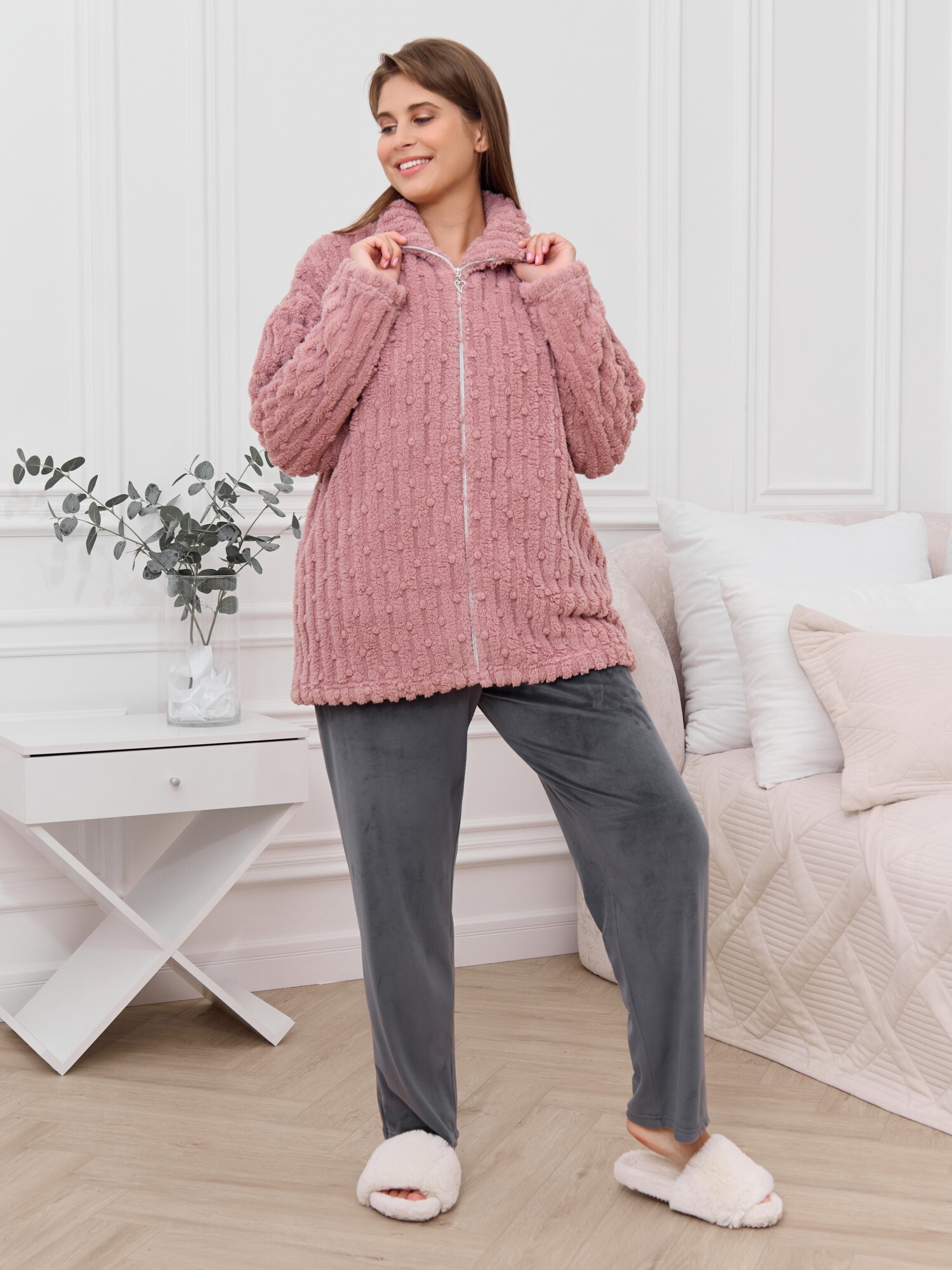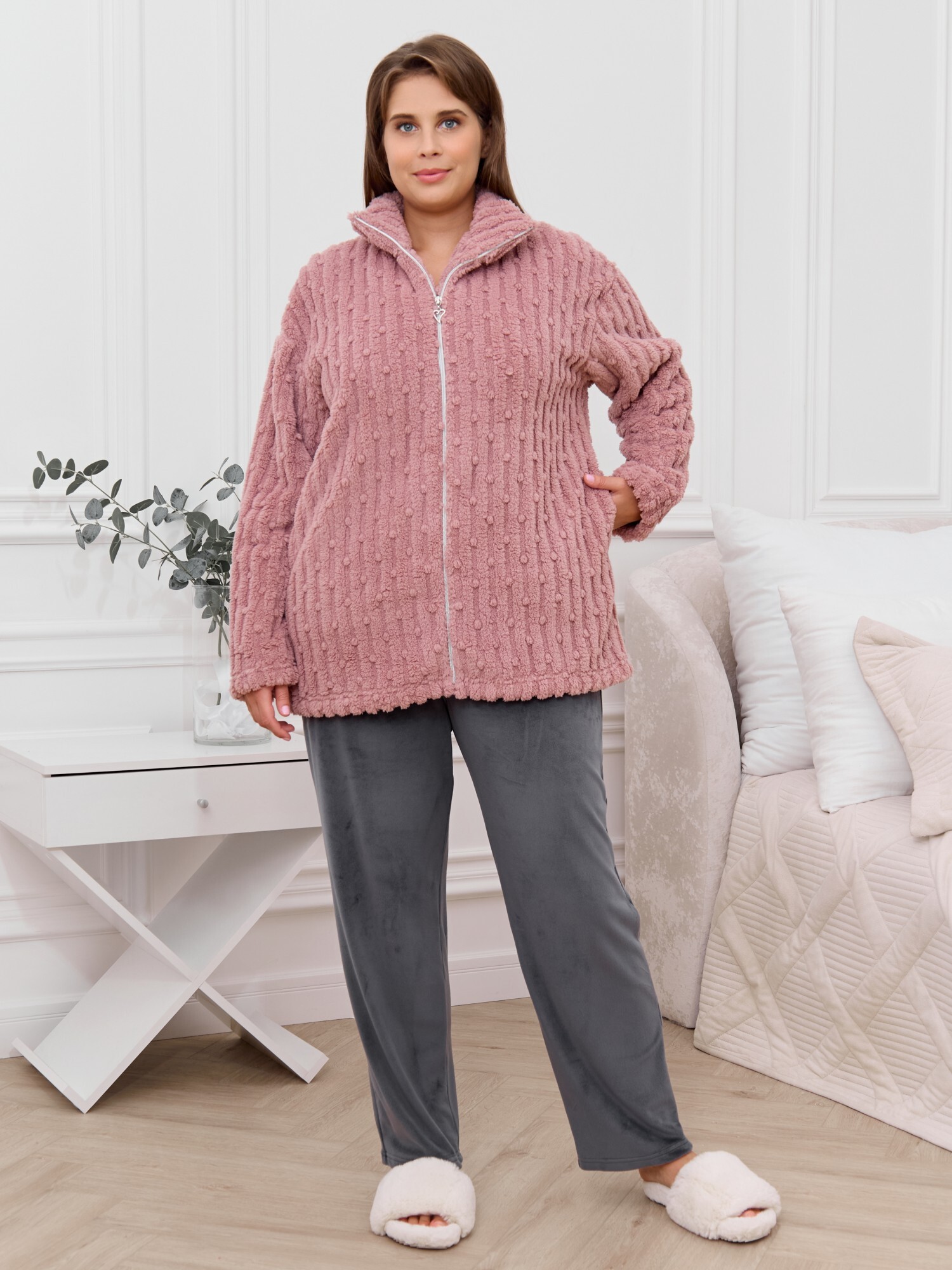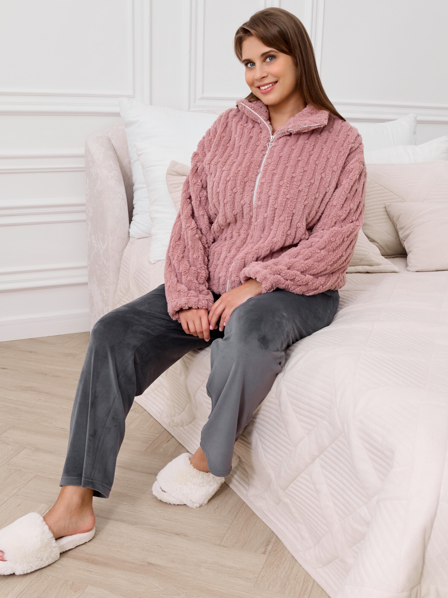 Костюм женский из двух видов текстильных материалов: тканого полотна «велсофт» и трикотажного полотна «вельмонд», состоящий из куртки и брюк.Куртка – из гладкокрашенного трикотажного полотна «велсофт» со стриженым рисунком, с длинными втачными рукавами, воротником «стойка», карманами в боковых швах, центральной бортовой застежкой на