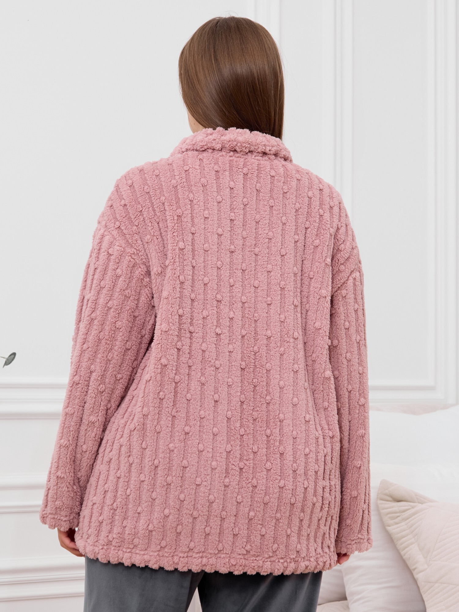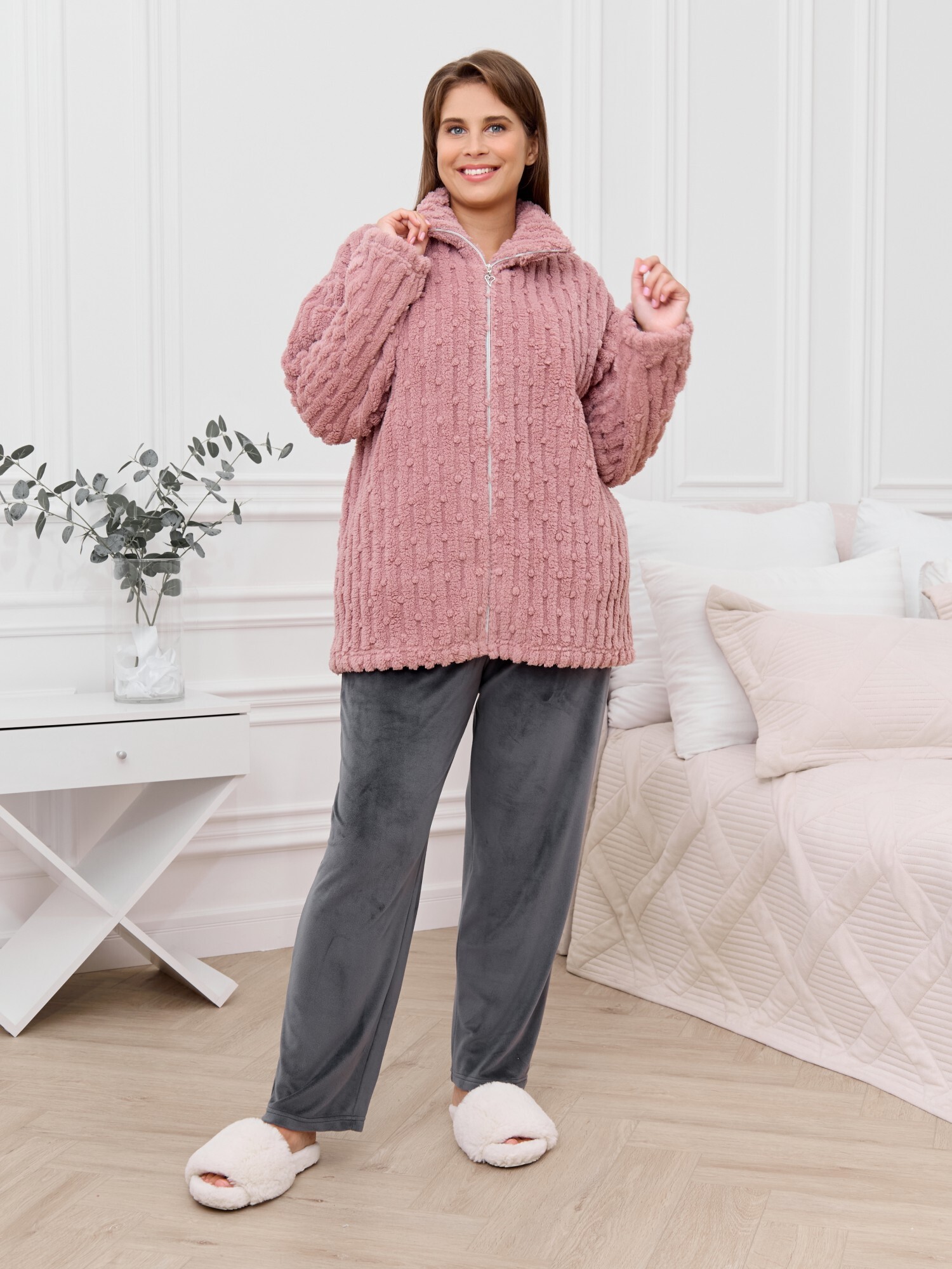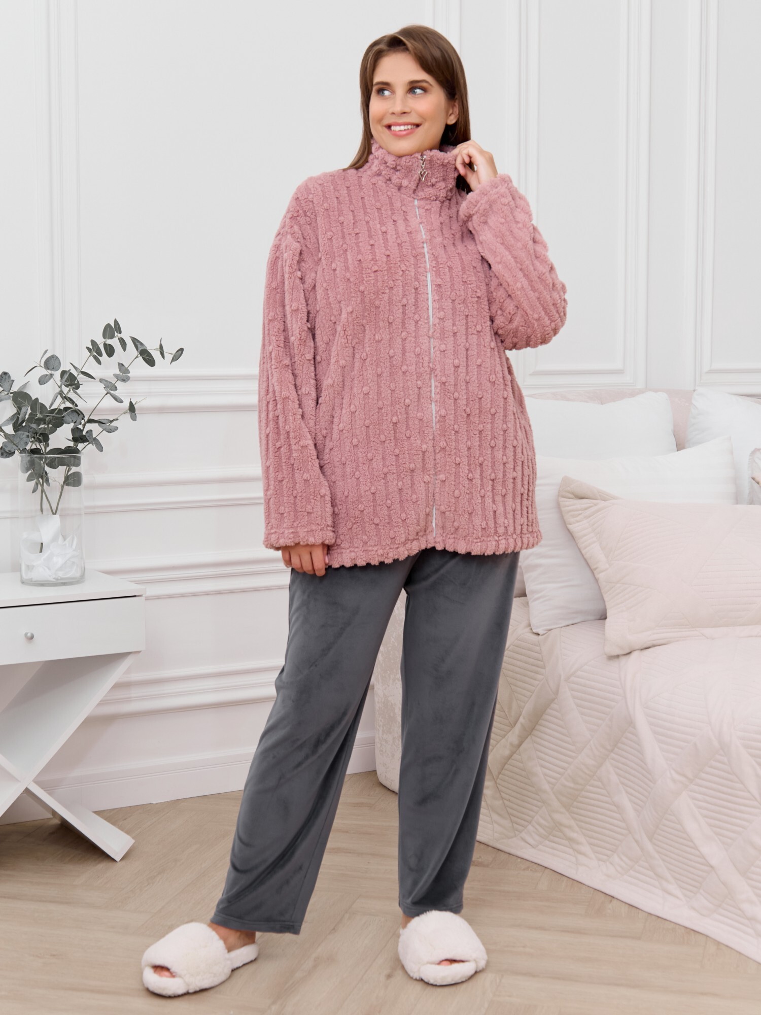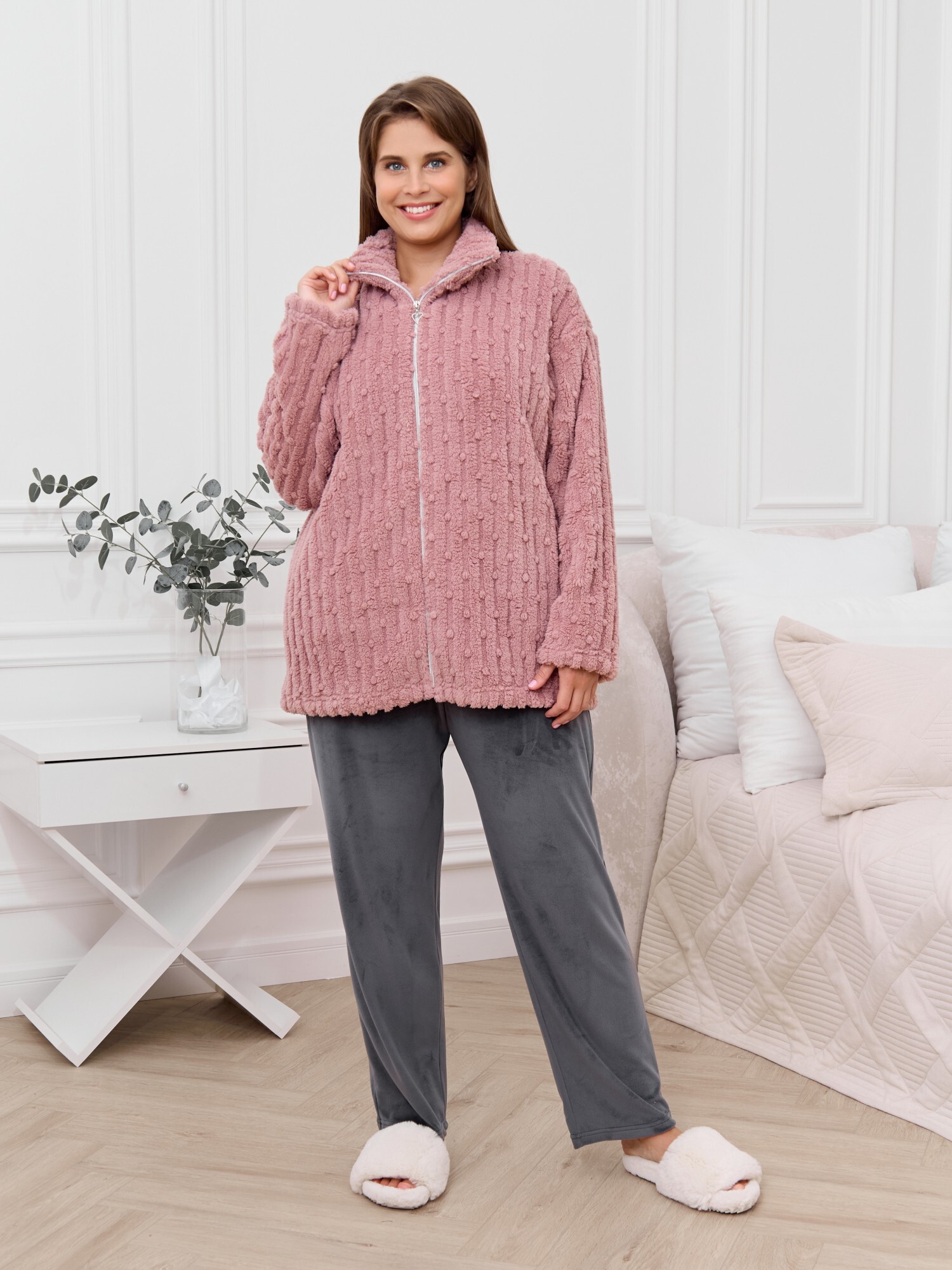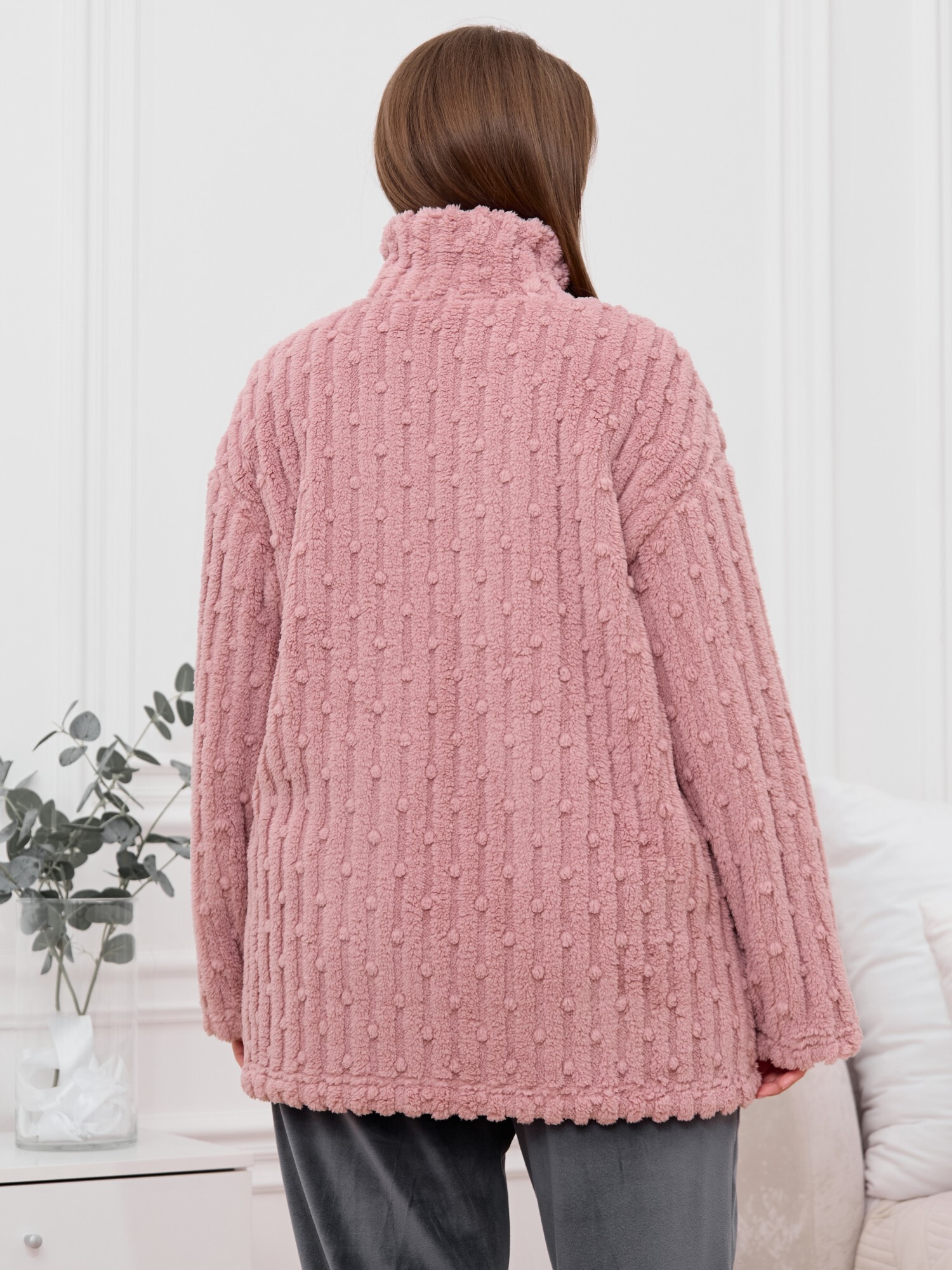 Костюм женский из двух видов текстильных материалов: тканого полотна «велсофт» и трикотажного полотна «вельмонд», состоящий из куртки и брюк.Куртка – из гладкокрашенного трикотажного полотна «велсофт» со стриженым рисунком, с длинными втачными рукавами, воротником «стойка», карманами в боковых швах, центральной бортовой застежкой на