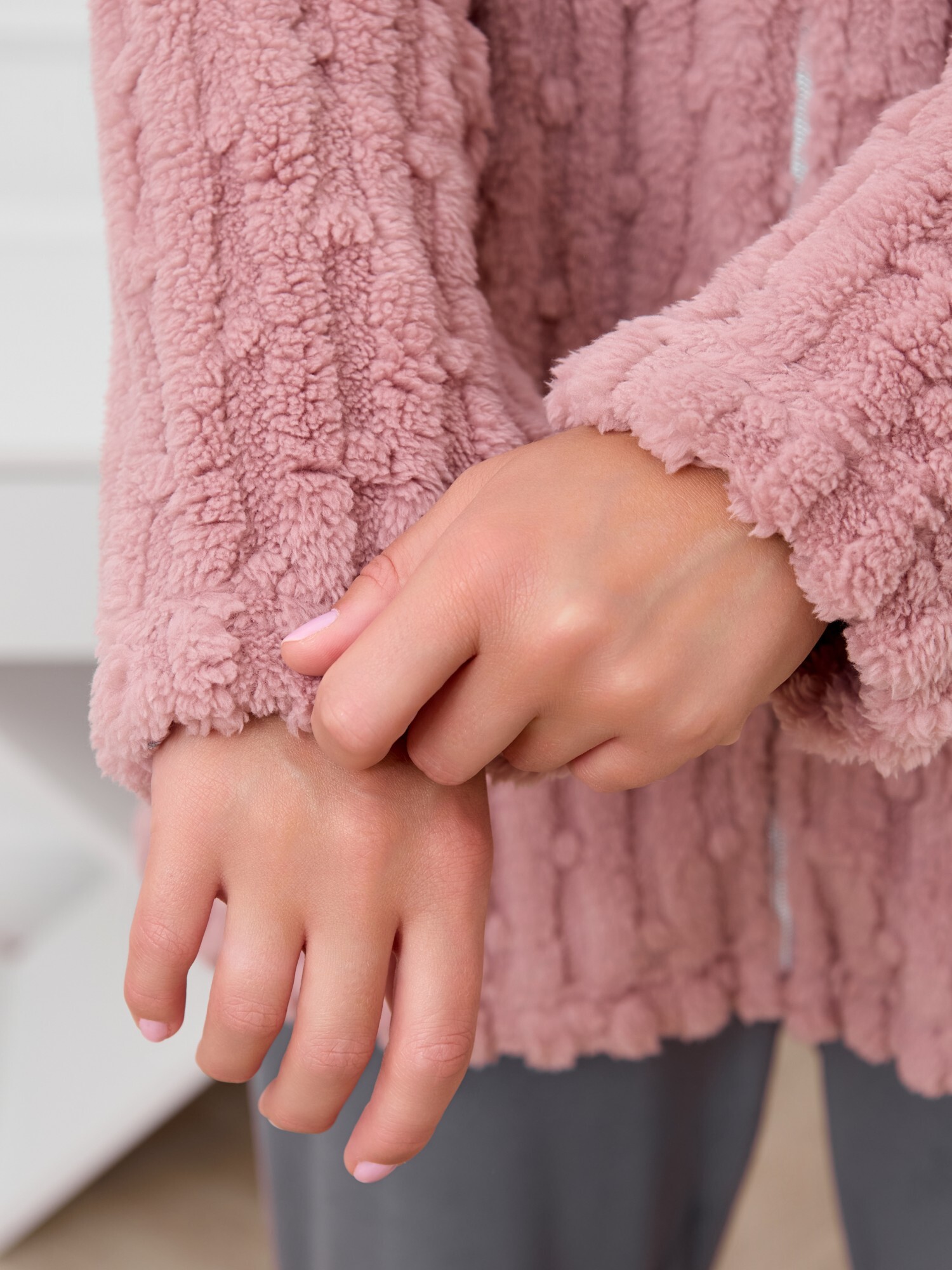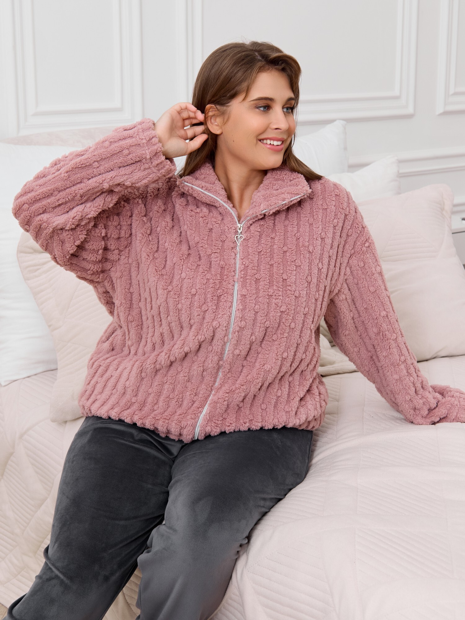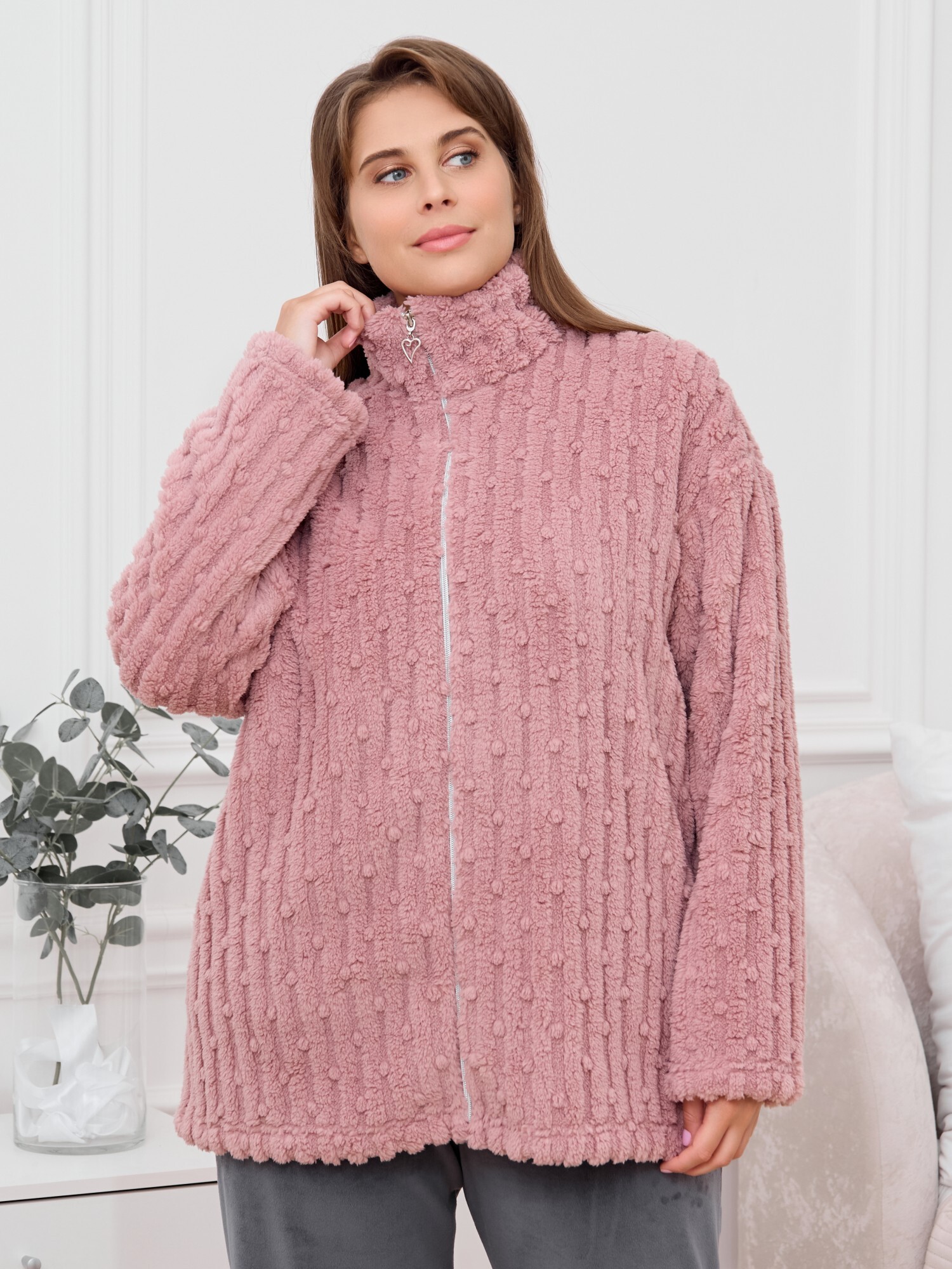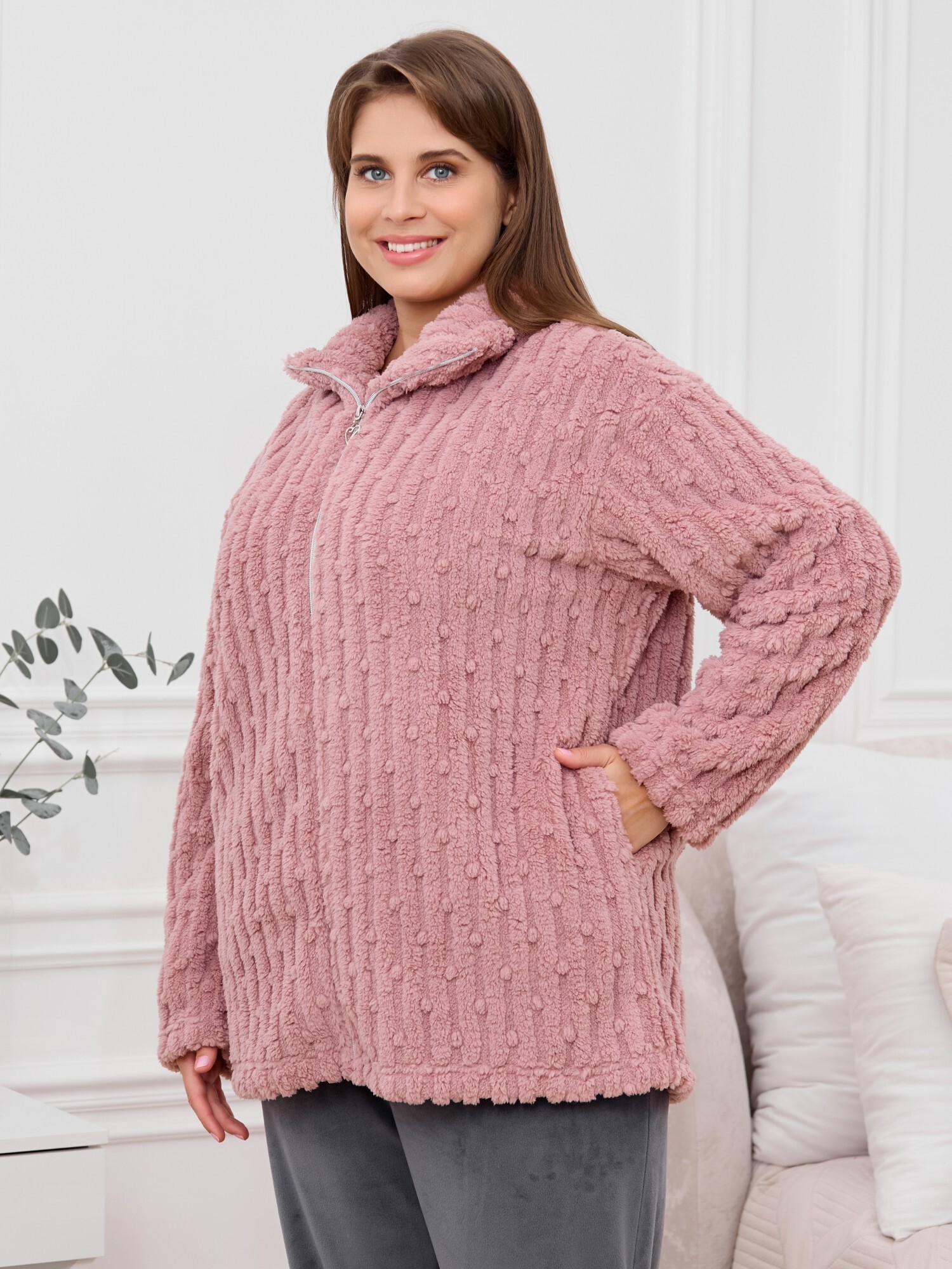Костюм женский из двух видов текстильных материалов: тканого полотна «велсофт» и трикотажного полотна «вельмонд», состоящий из куртки и брюк.Куртка – из гладкокрашенного трикотажного полотна «велсофт» со стриженым рисунком, с длинными втачными рукавами, воротником «стойка», карманами в боковых швах, центральной бортовой застежкой на