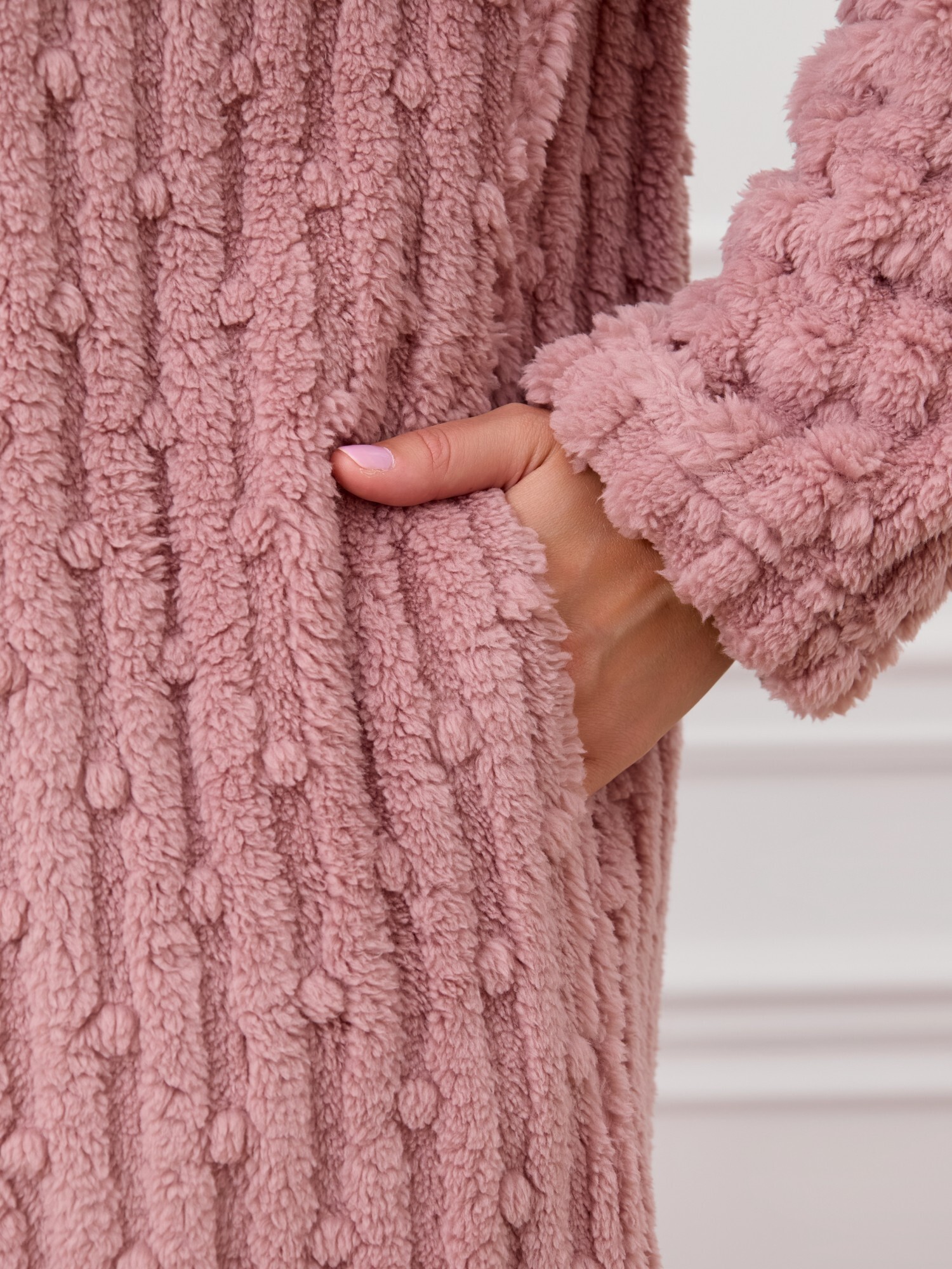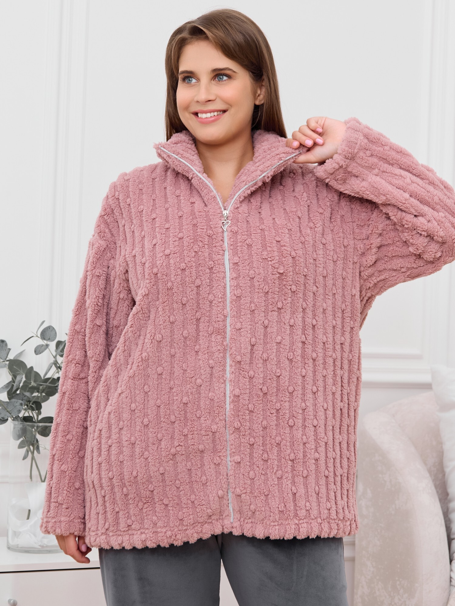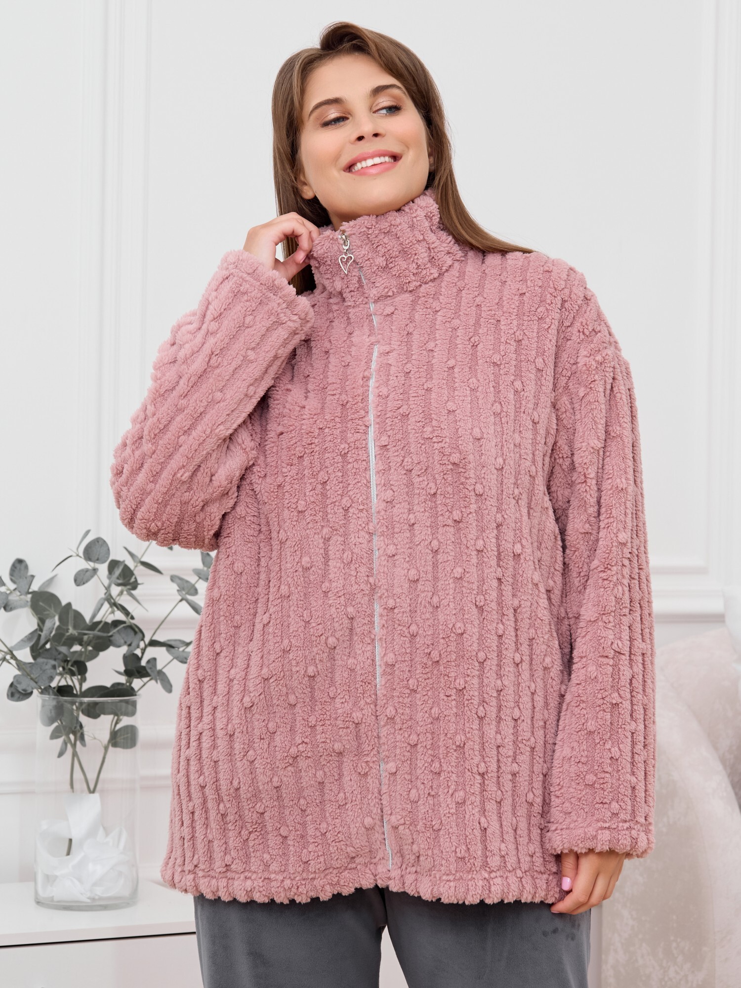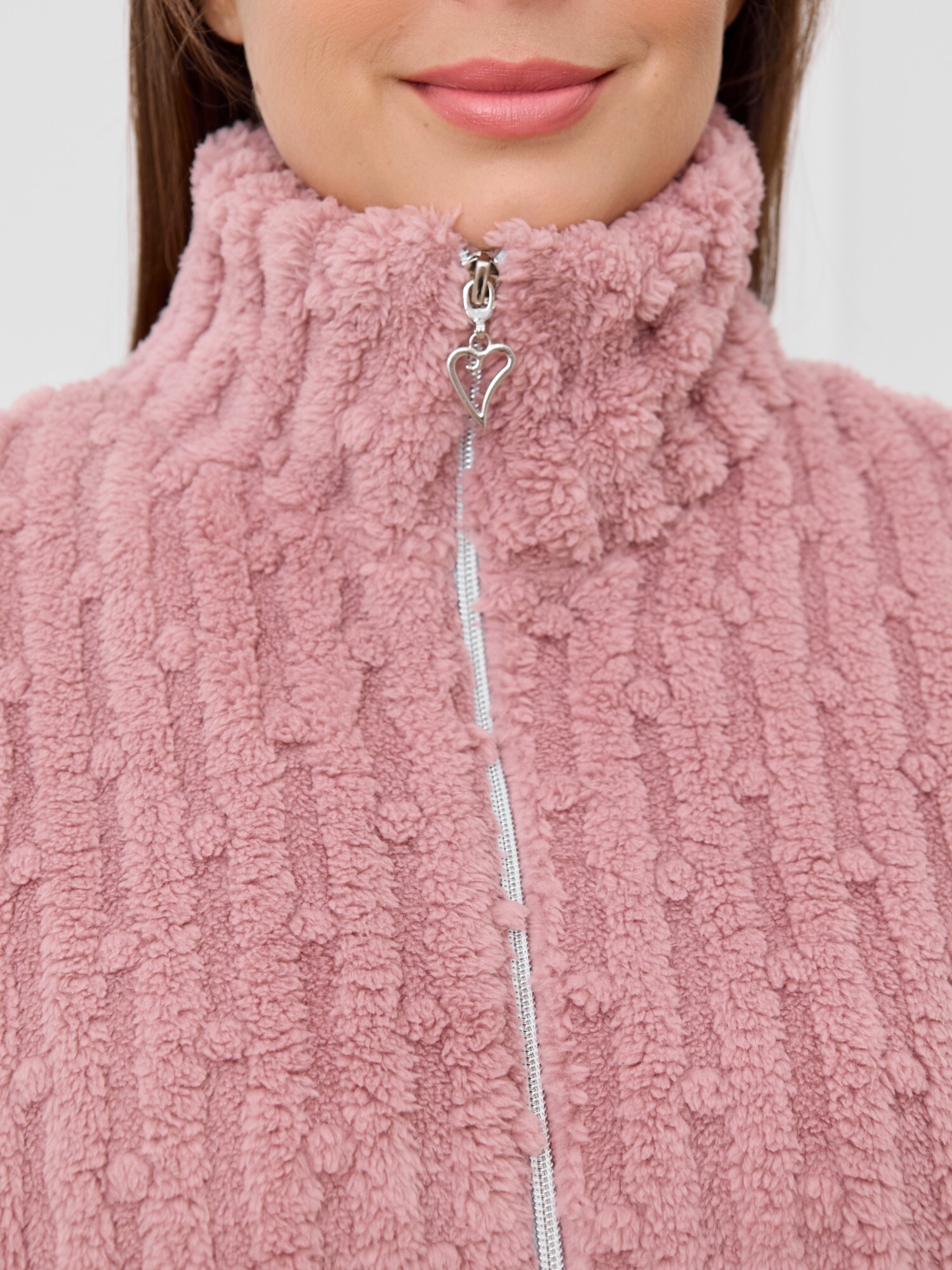 Костюм женский из двух видов текстильных материалов: тканого полотна «велсофт» и трикотажного полотна «вельмонд», состоящий из куртки и брюк.Куртка – из гладкокрашенного трикотажного полотна «велсофт» со стриженым рисунком, с длинными втачными рукавами, воротником «стойка», карманами в боковых швах, центральной бортовой застежкой на