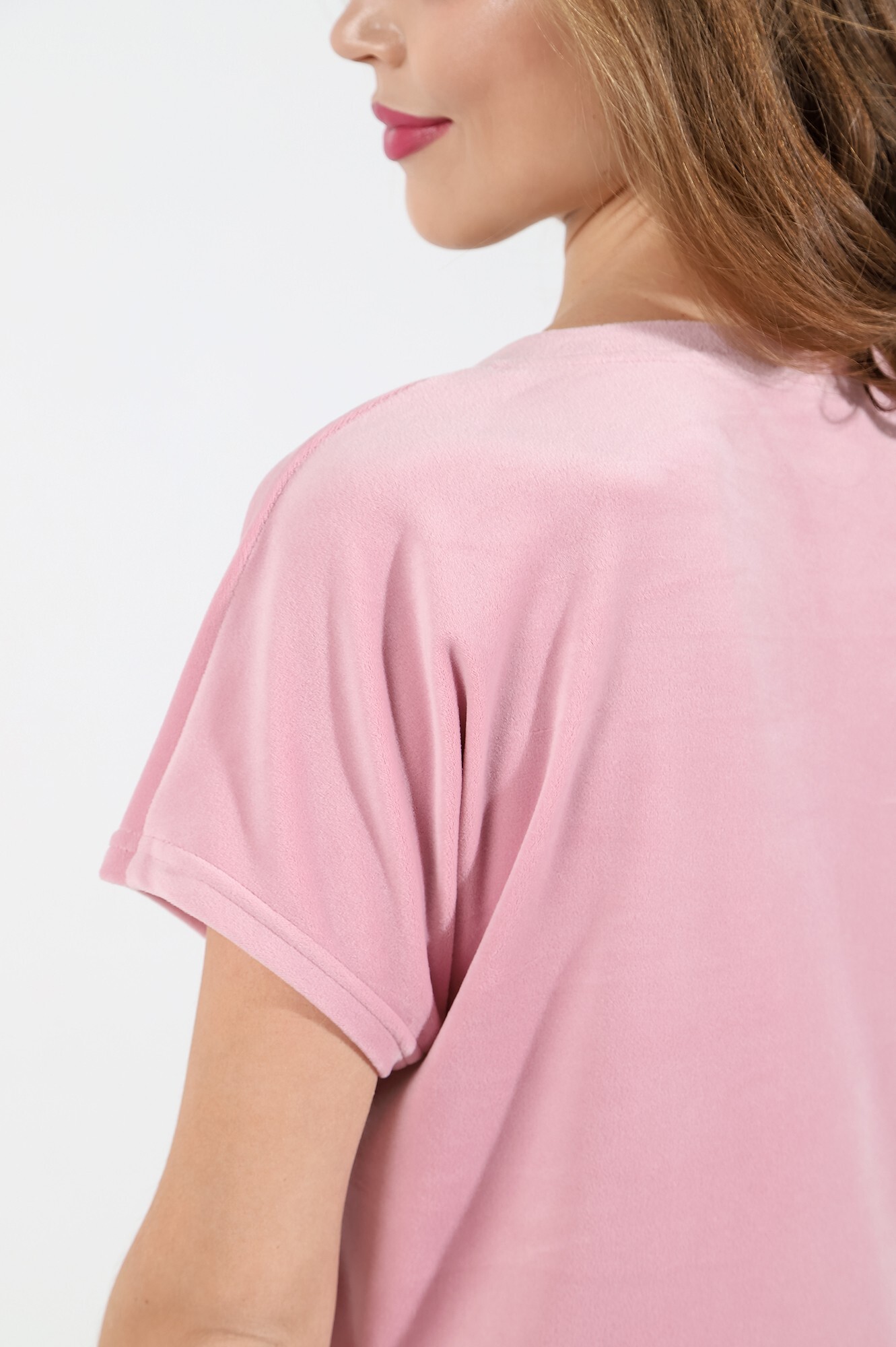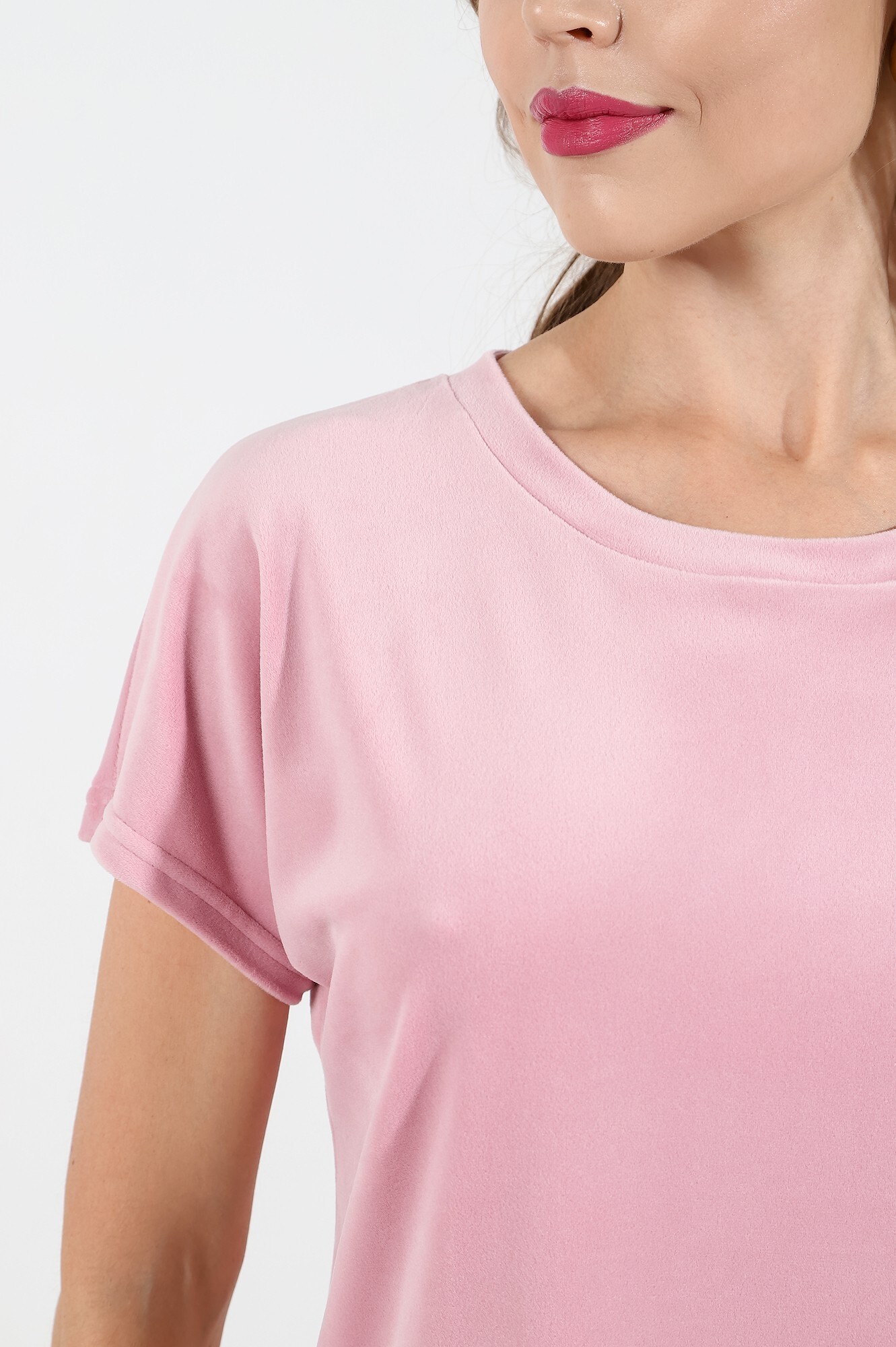 Костюм молодежный из трикотажного полотна «велюр-стрейч», состоящий из футболки и шорт. Футболка – классического покроя, с короткими цельнокроеными рукавами и горловиной овальной формы, обработанной втачной планкой. Шорты - средней длины, расширенные книзу, с эластичной тесьмой по талии.