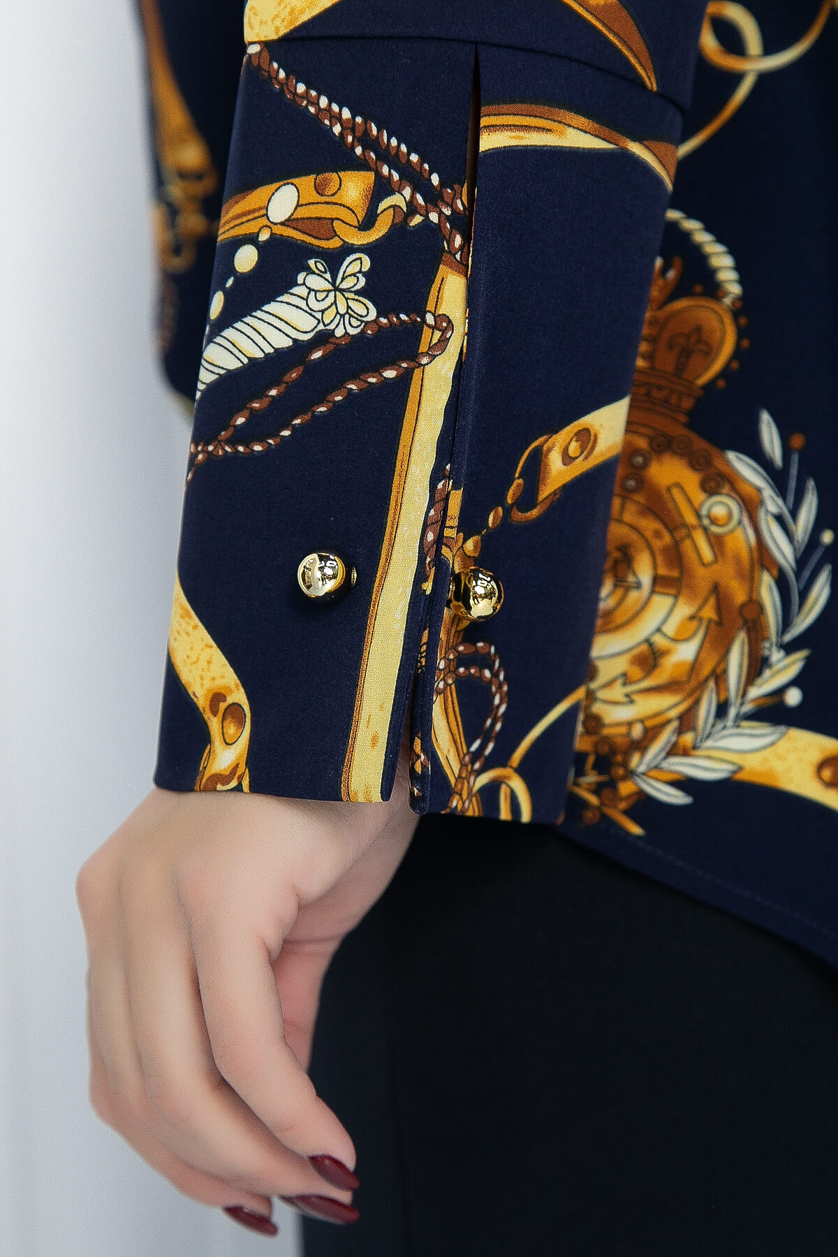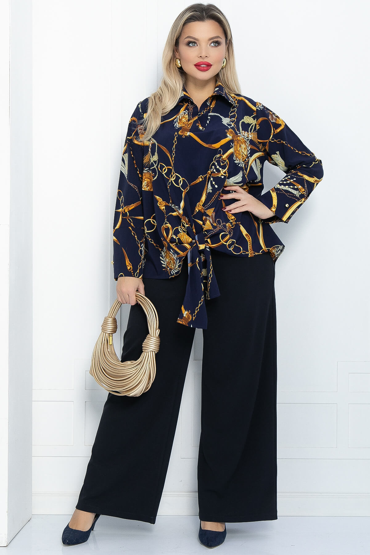 Стильный костюм из приятной к телу ткани с трендовым принтом. Оригинальный блузон свободного кроя имеет рубашечный воротник и элегантную планку поло. Широкий манжет блузона имеет необычную застёжку в виде золотой иглы с горошинами на концах. Украшает блузон нарядная завязка по переду изделия, которую вы можете завязать по своему желанию, корректируя длину блузона. Свободные брюки придают костюму легкость и особый шик. Брюки имеют пояс на комфортной резинке, что позволяет чувствовать себя свободно и не сомневаться при выборе размера. Свободный силуэт костюма подходит абсолютно для любой фигуры. Оригинальный костюм для любого мероприятия позволит вам чувствовать себя элегантно, дорого и в тренде.