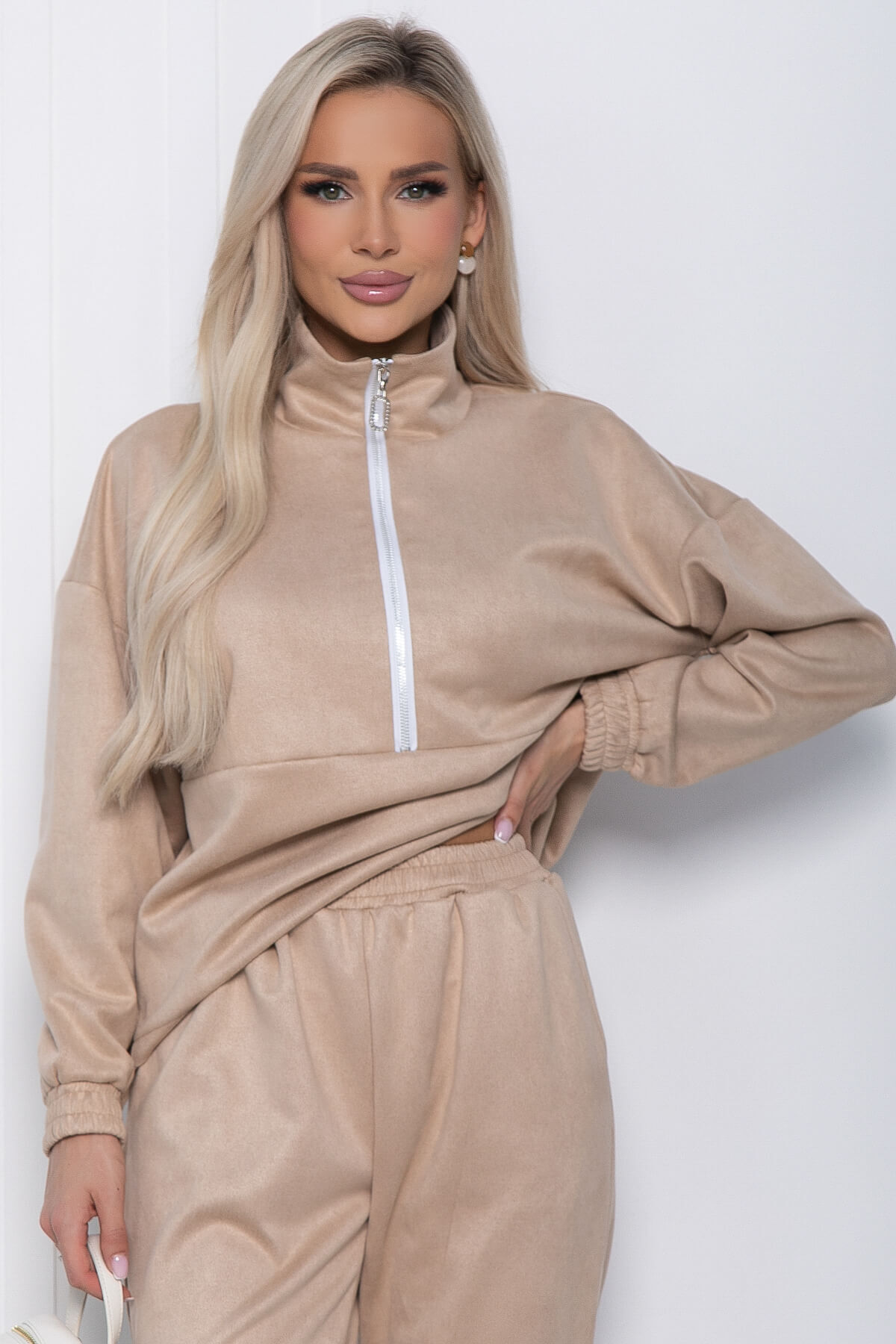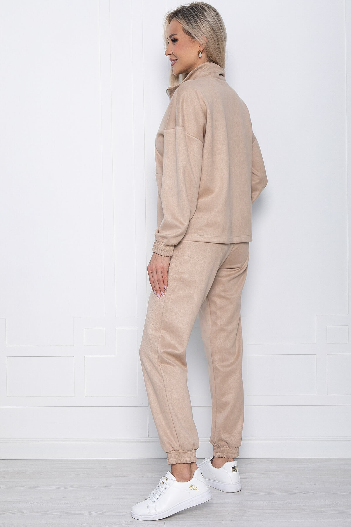 Повседневный костюм в стиле спорт-шик. Воротник-стойка, удобный спущенный рукав на резинке. Молния расстёгивается до груди, поэтому вы можете регулировать степень открытости груди. Брюки на эластичной манжете, чтобы можно было регулировать их длину. Есть брючные карманы.