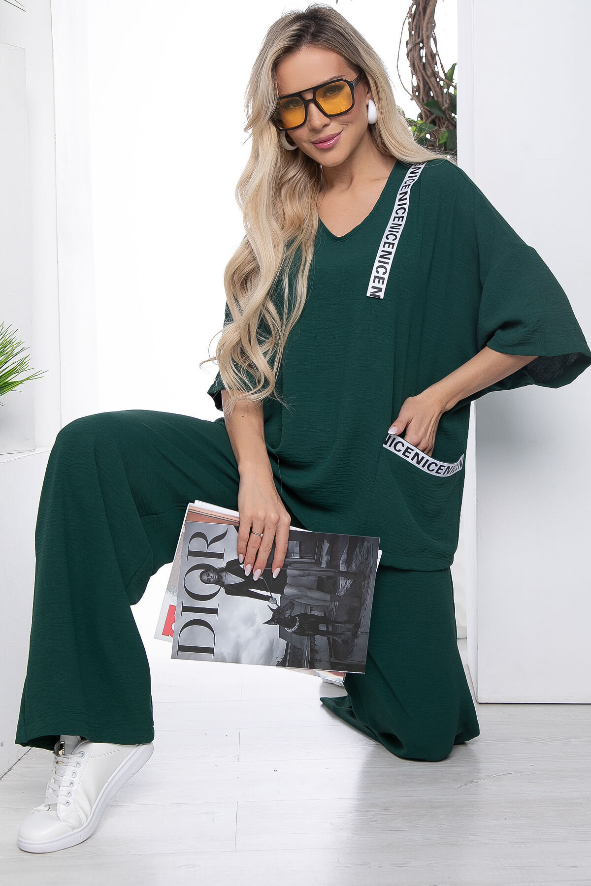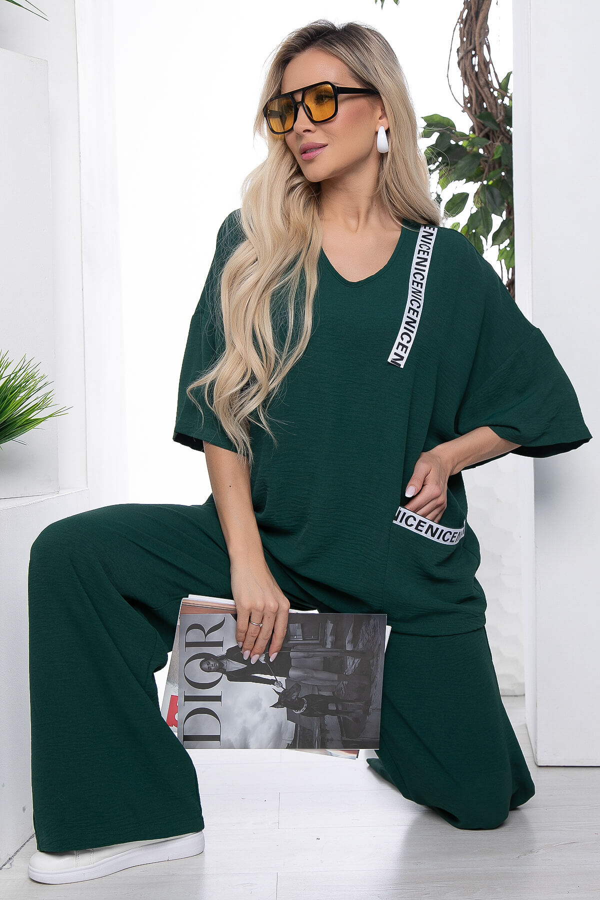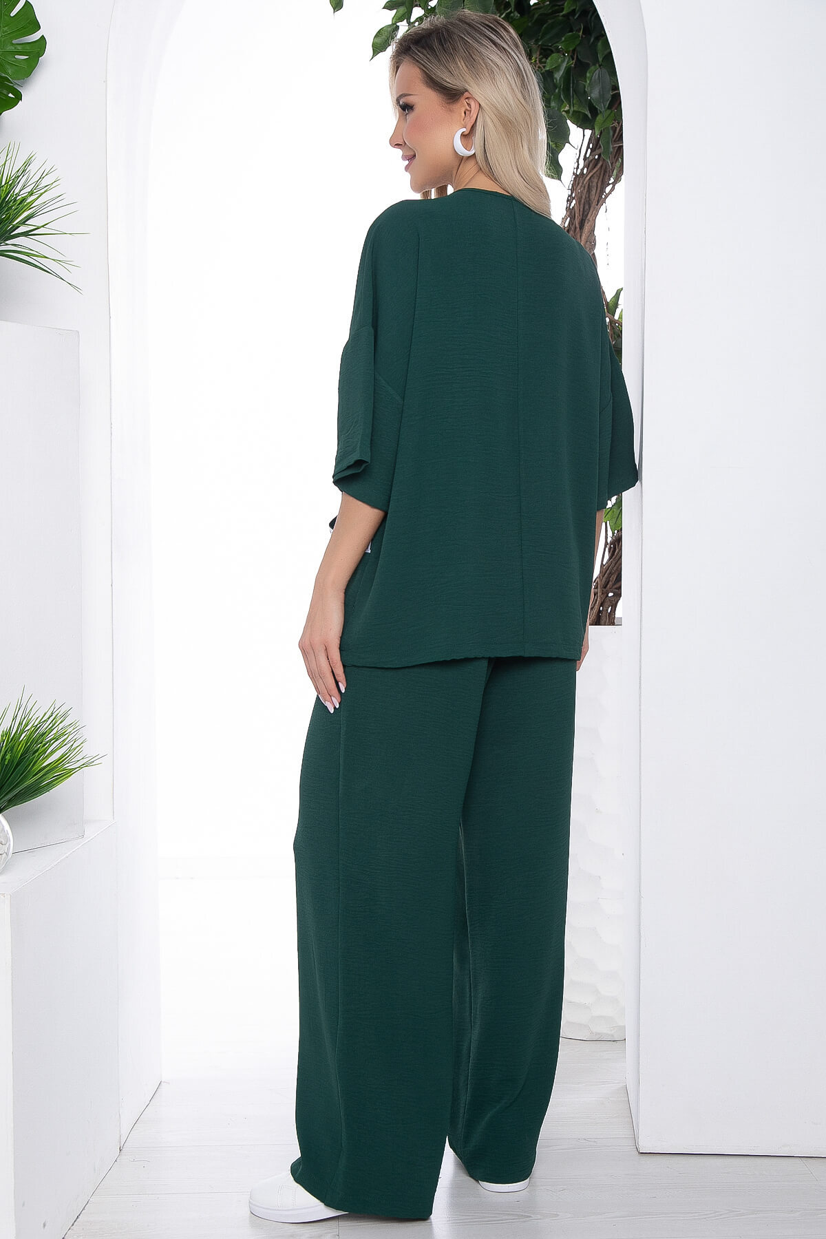 Тренд сезона - лёгкий брючный костюм из приятной струящейся ткани. Оригинальный верх свободного кроя с рукавом-кимоно средней длины и кулиской по низу изделия. Свободные брюки в стиле палаццо придают костюму лёгкость и особый шик. Брюки имеют пояс на комфортной резинке, что позволяет чувствовать себя свободно и не сомневаться при выборе размера. Свободный силуэт костюма подходит абсолютно для любой фигуры. Костюм актуален как для офиса, праздничных мероприятий, так и для романтических встреч.