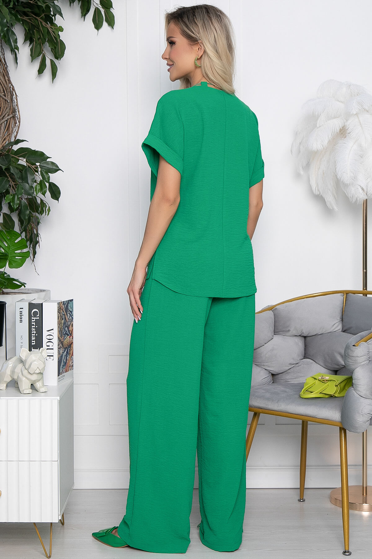 Тренд сезона – легкий брючный костюм из приятной струящейся ткани в модных цветовых оттенках. Оригинальная блуза свободного кроя с коротким рукавом-кимоно и разрезами по бокам. Декорирована петельками, в которые продет шнурок. По желанию вы можете использовать свое любимое украшение, например, цепочку с кулоном. Свободные брюки в стиле палаццо придают костюму легкость и особый шик. Брюки имеют пояс на комфортной резинке, что позволяет чувствовать себя свободно и не сомневаться при выборе размера. Свободный силуэт костюма подходит абсолютно для любой фигуры. Костюм актуален как для офиса, праздничных мероприятий, так и для романтических встреч.