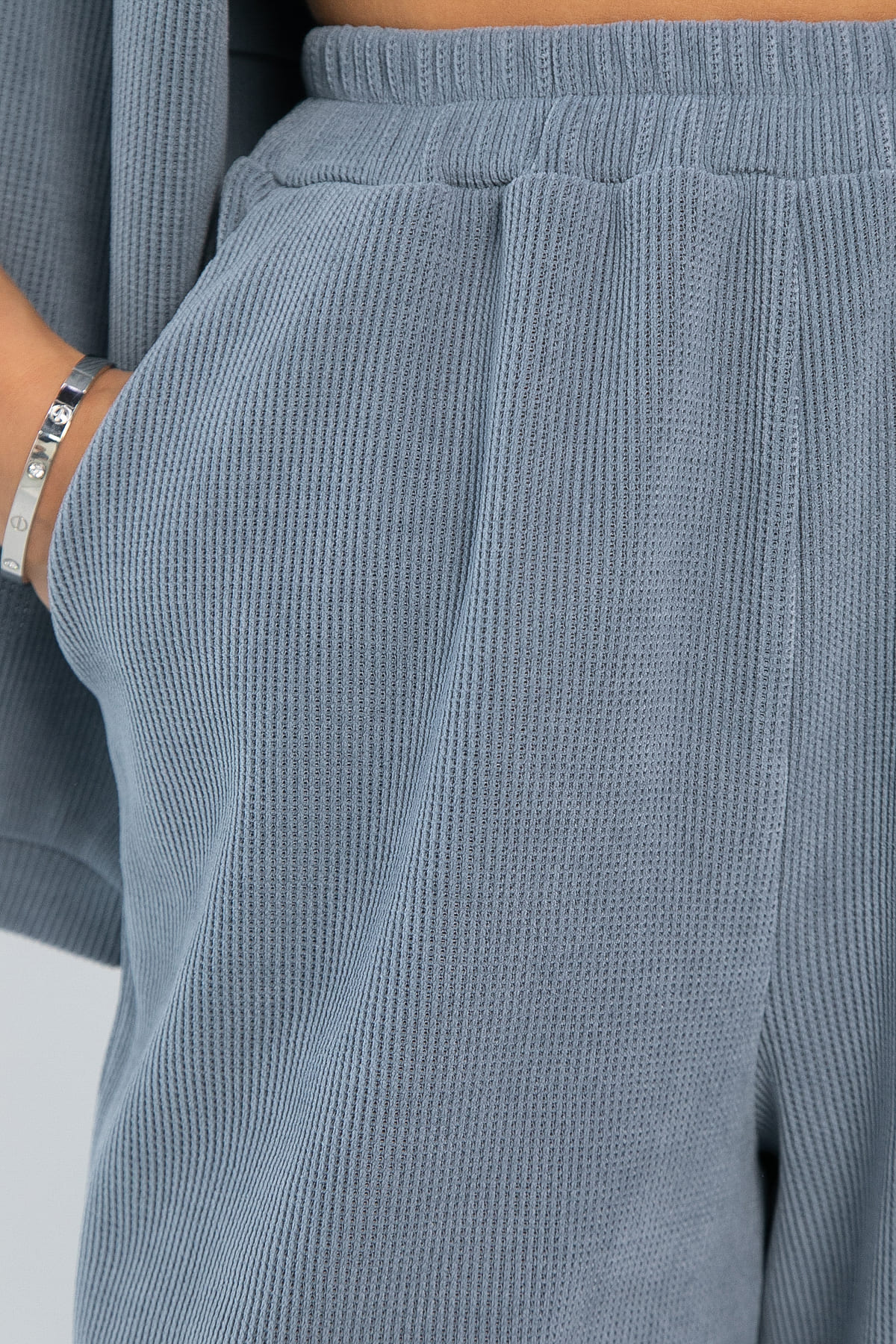Ваш идеальный выбор для комфортных образов — костюм свободного кроя в светло-сером цвете! Отличительная особенность этой модели — широкие брюки палаццо. Свободный крой верха и спущенный рукав создают ощущение комфорта, что особенно актуально в прохладную погоду. Брюки по талии на резинке обеспечивают дополнительный комфорт. По боковым швам расположены карманы. Этот комплект идеально подойдет тем, кто ценит свободу движений и уют без лишних деталей.